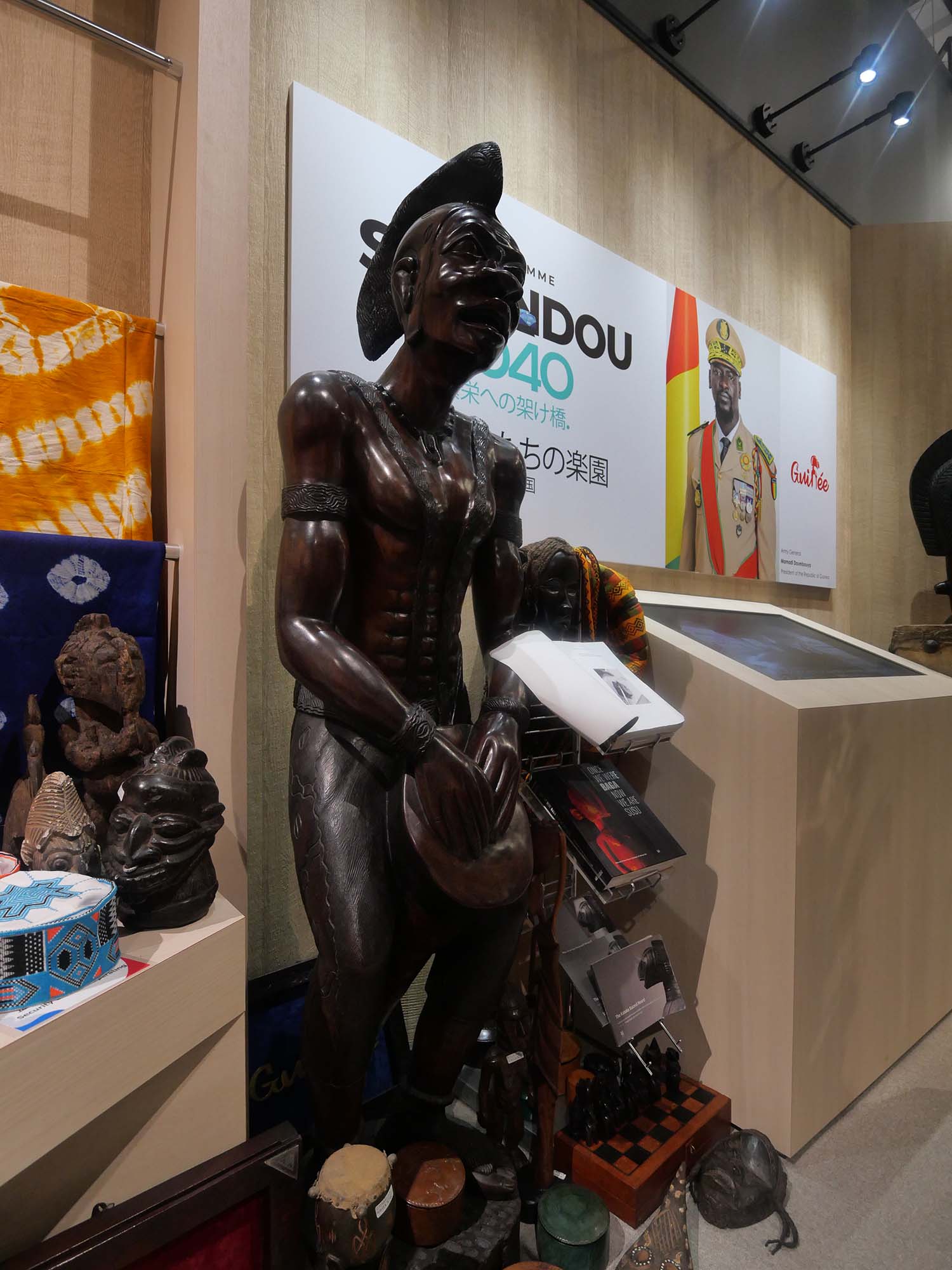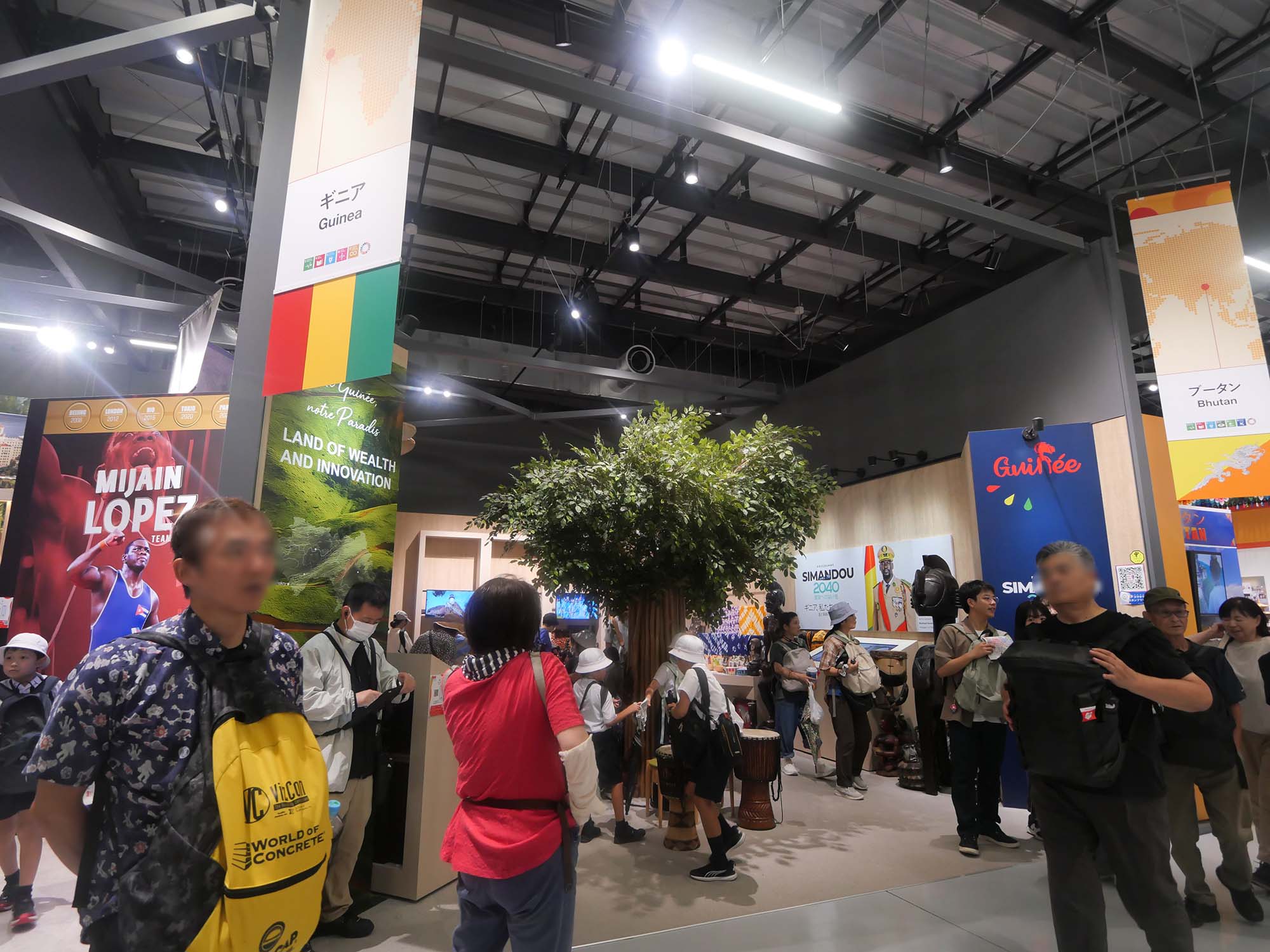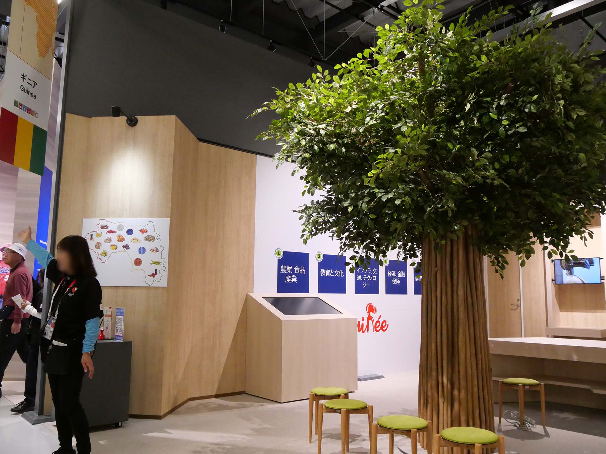 パビリオンの前には大きな樹木が立ち、来場者の目印となっています。館内では、ギニアの代表的な食品や工芸品、映像展示などを通して、民族文化や暮らし、発展の歩みが紹介されています。自然資源と人々の生活文化の関係を感じることができる展示構成となっています。