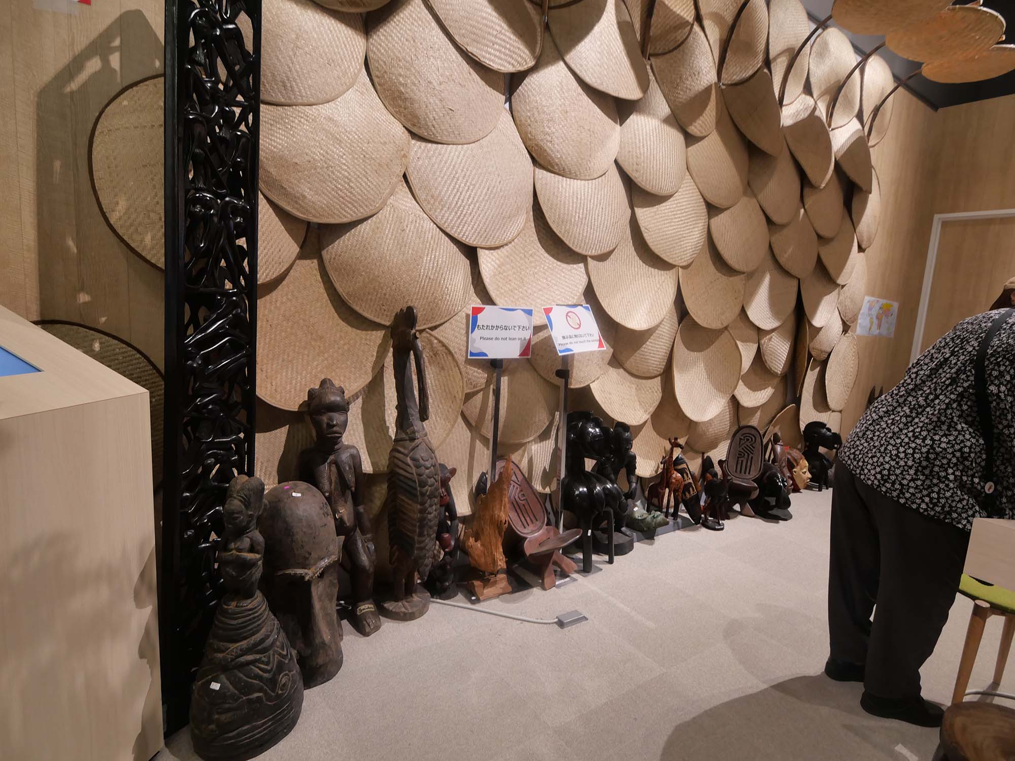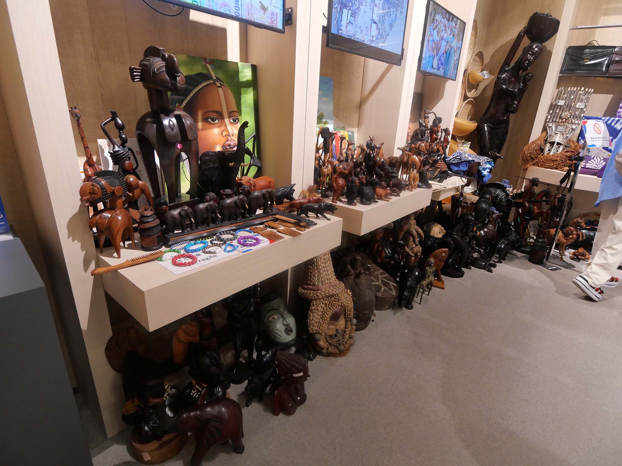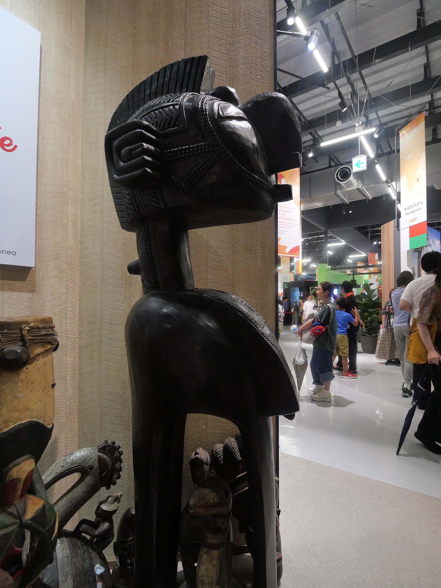 パビリオンの前には大きな樹木が立ち、来場者の目印となっています。館内では、ギニアの代表的な食品や工芸品、映像展示などを通して、民族文化や暮らし、発展の歩みが紹介されています。自然資源と人々の生活文化の関係を感じることができる展示構成となっています。