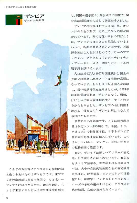 1970年大阪万博のザンビア館は、「ヒューマニズムと発展」をテーマに、独立後間もない国家としての歩みと未来像を紹介する展示が行われました。建物は同じ大きさの正方形3棟が重なった独特の構成で、外壁にはアフリカ地図や国名表示が掲げられ、来場者に強い印象を与えました。館内では歴史や伝統文化、観光、農業・工業の発展、そして基幹産業である銅鉱業を中心に、模型や写真、映像装置を用いて総合的に紹介していました。大統領肖像や民族楽器、住居模型なども展示され、文化と資源を背景に未来へ進むザンビアの姿を来場者に伝える教育的なパビリオンでした。