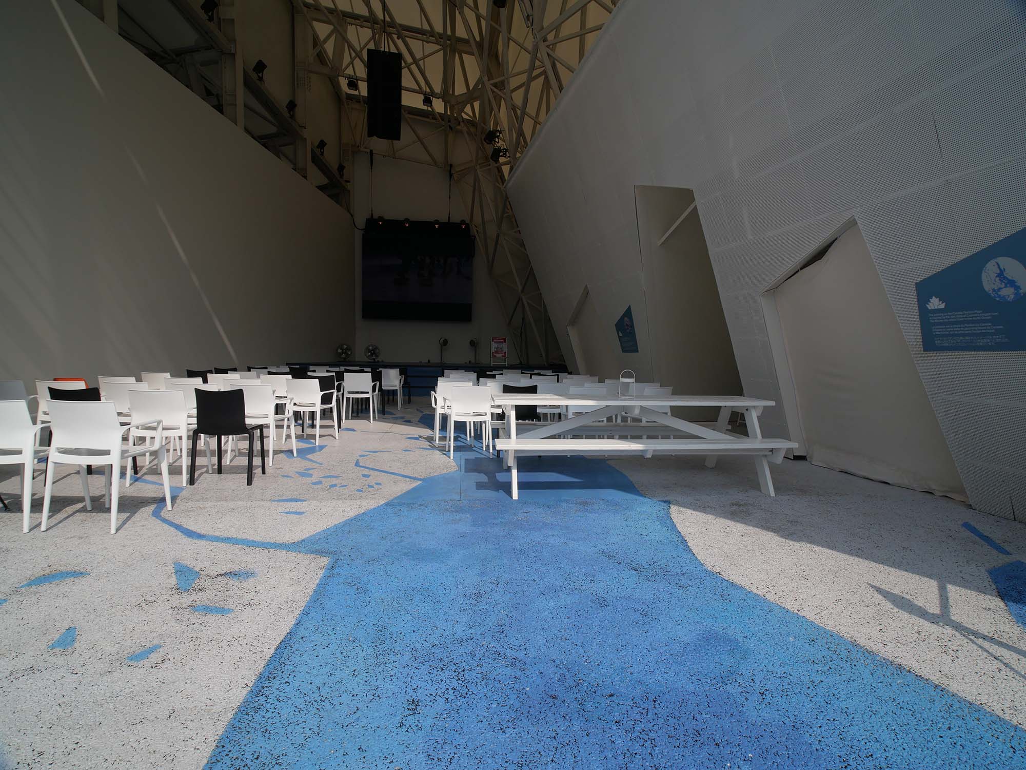 冬から春へと移り変わる季節、凍っていた川の氷が溶けて流れ出す風景をモチーフにしています。外観は、カナダの自然現象である「水路氷結」を表現し、儚く溶けゆく氷の造形が特徴です。内部では、カナダの温かさや開放性、革新性、多様性、持続可能な社会への取り組みが紹介されています。