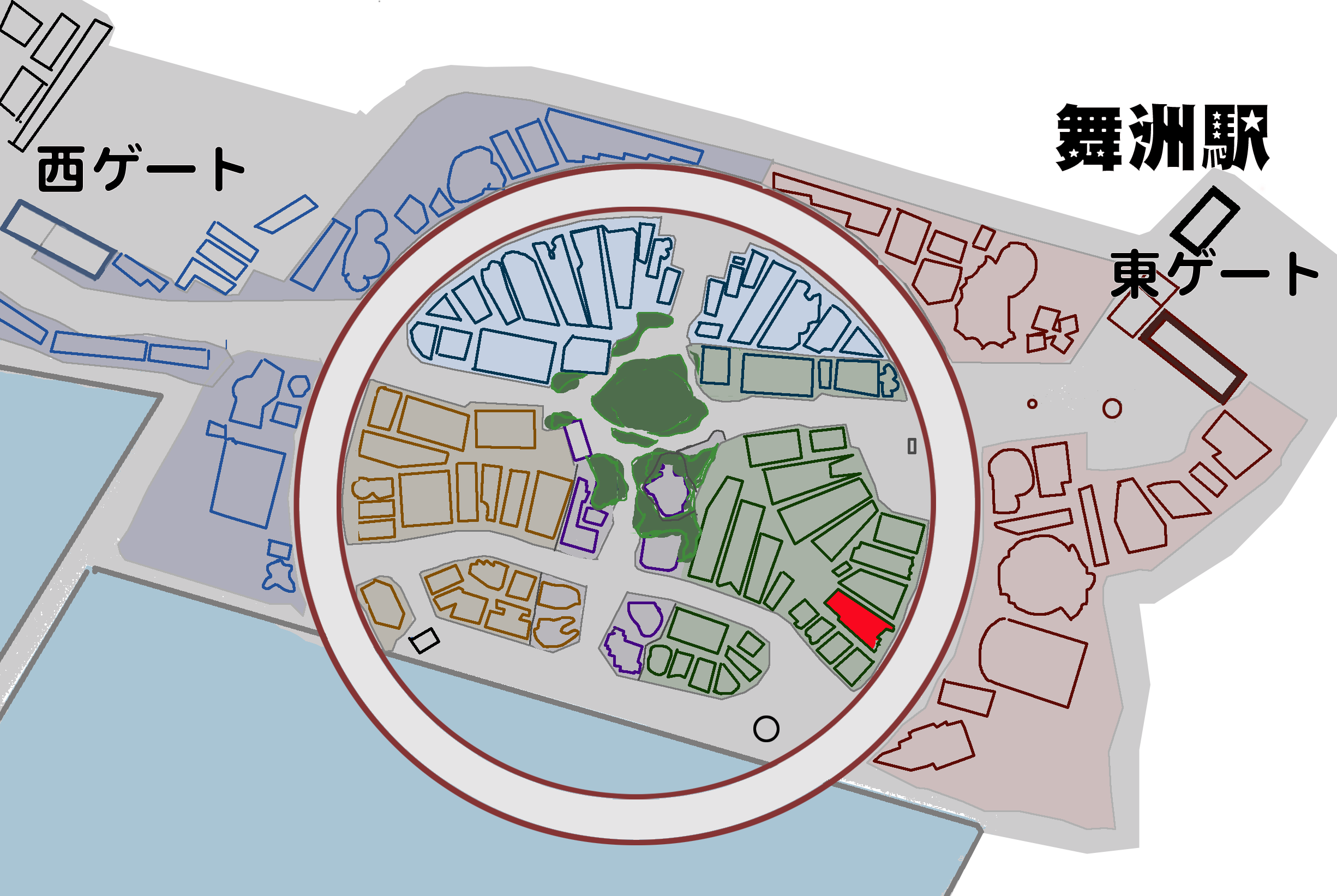 東ゲートから大屋根リングを左に、カタール、アラブ首長国を通りすぎたところ。
