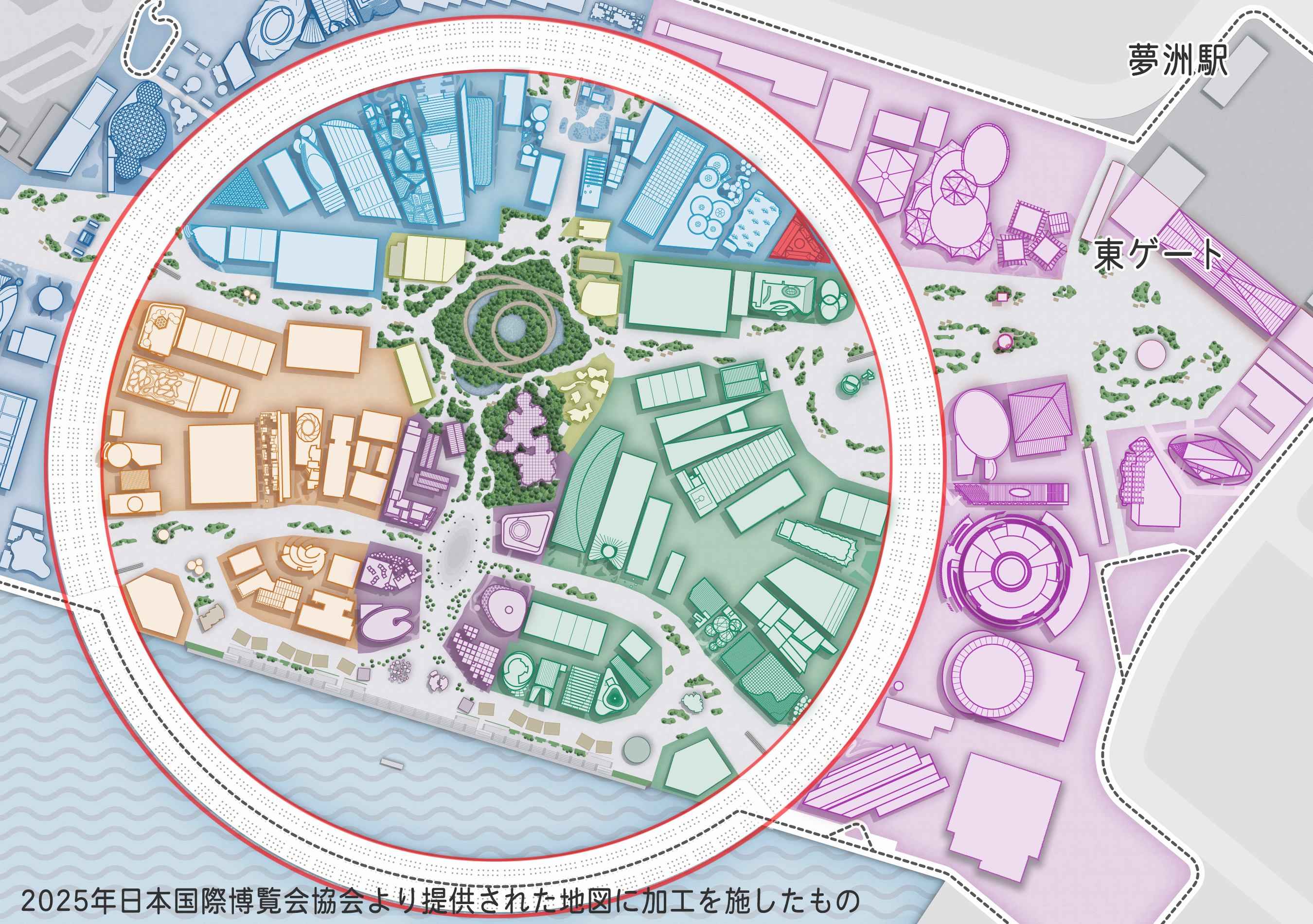 構造面では鉄骨主体・木材は意匠的利用が中心という点が、木材利用の多い今回の万博の中での特徴といえます。