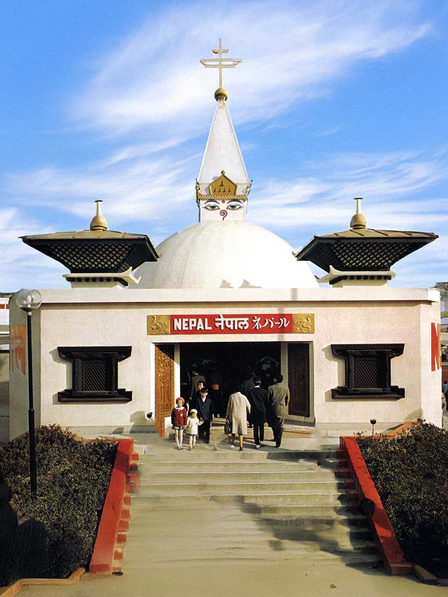しかしこのパビリオンは、開幕に間に合わず、会期中盤の7月19日に開館したことで話題となりました。資材調達や輸送、建設費支払いの遅れが主因とされ、開幕時点で未開館だった海外館の中で最後まで開館できなかった館でもあります。万博では世界的にも建設の遅れは珍しくなく、1970年大阪万博でも開幕当日の早朝まで工事が続いていた例がありました。ネパールも1970年万博には出展しており、その際は問題なく開館しています。
