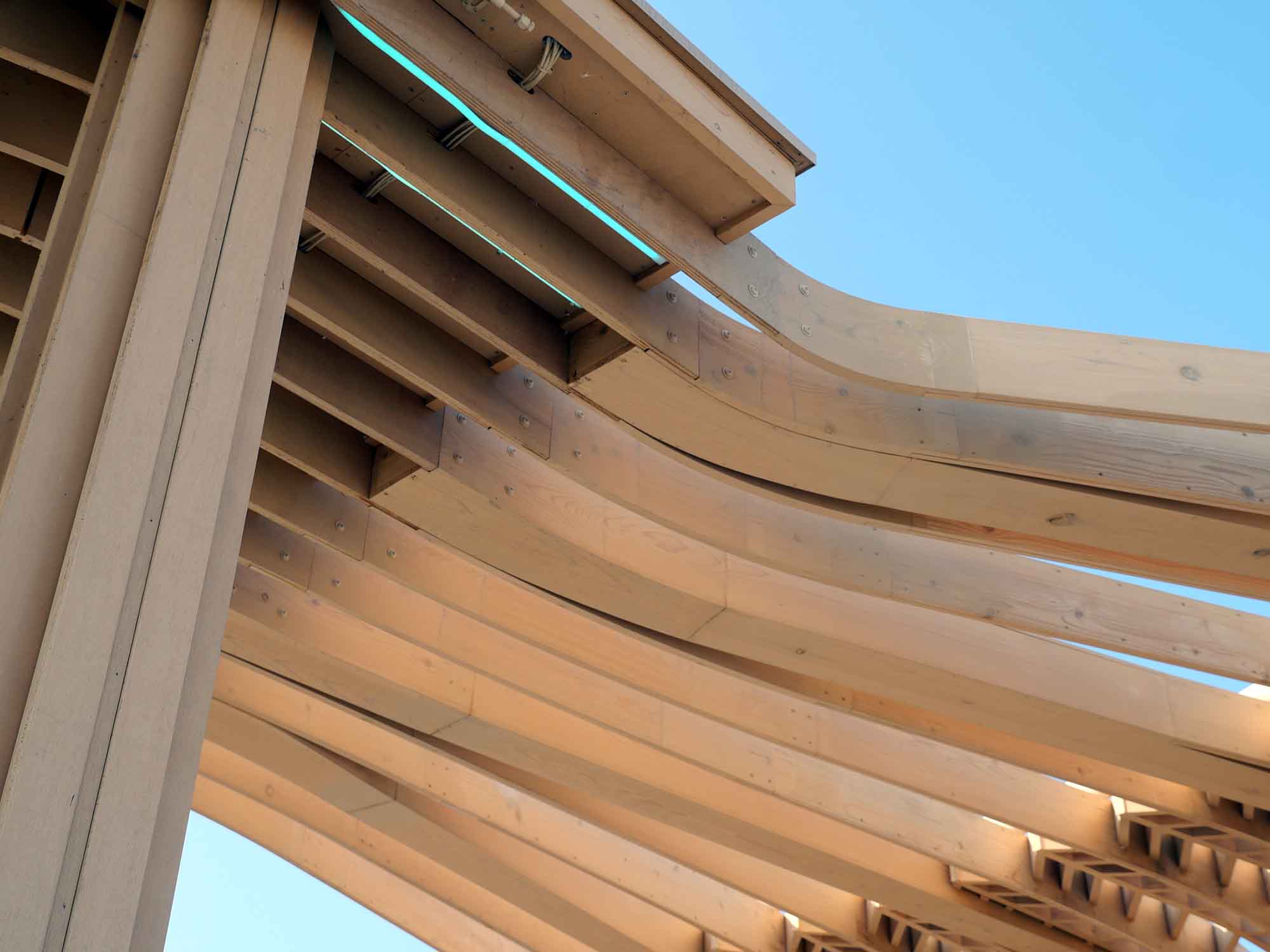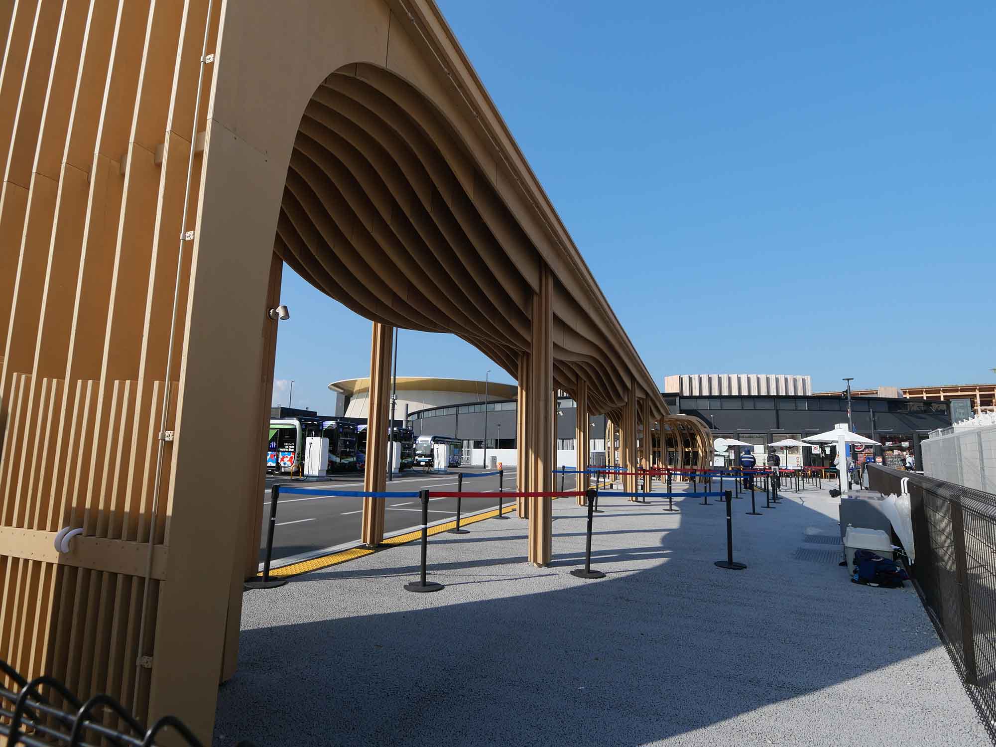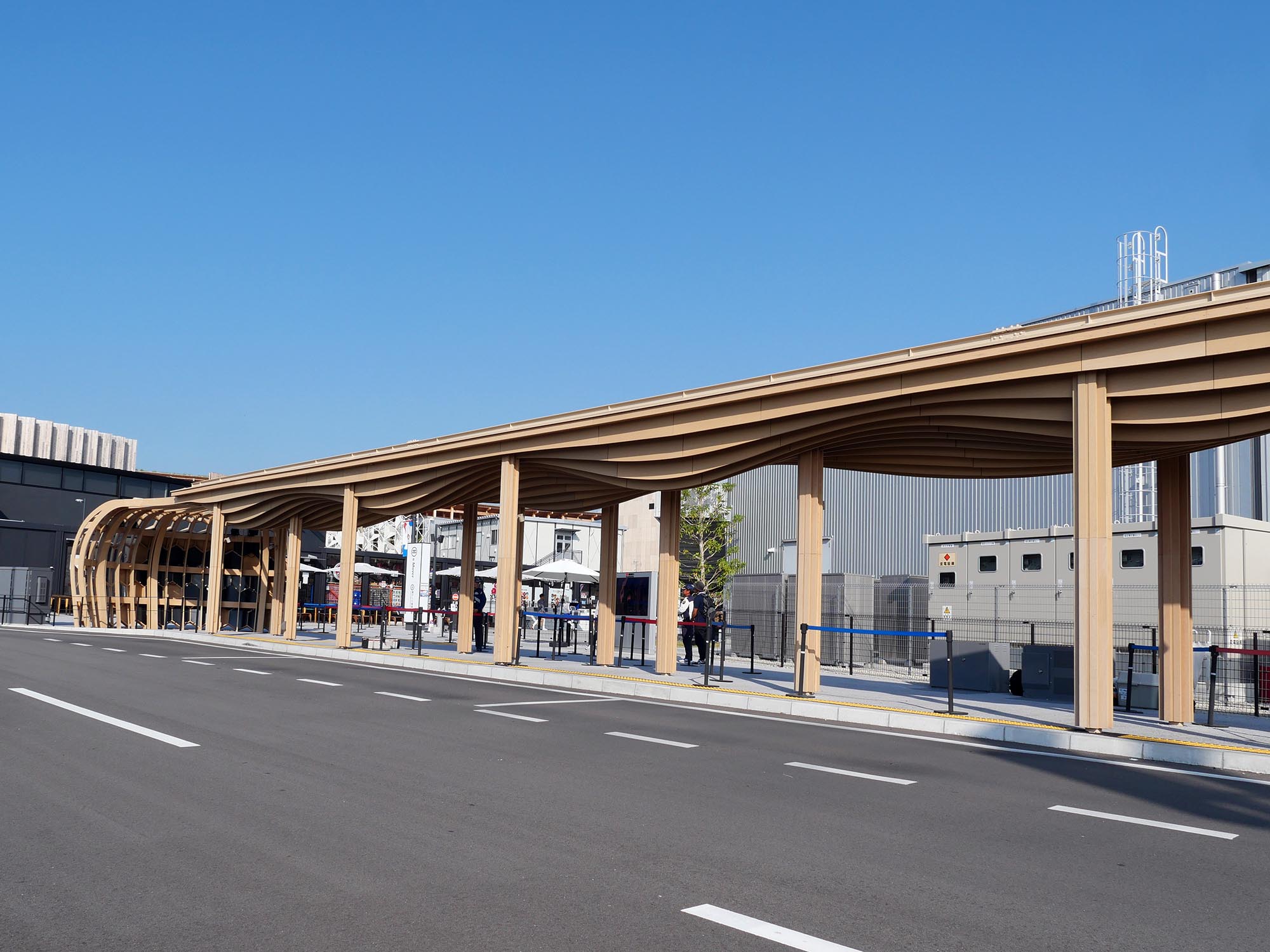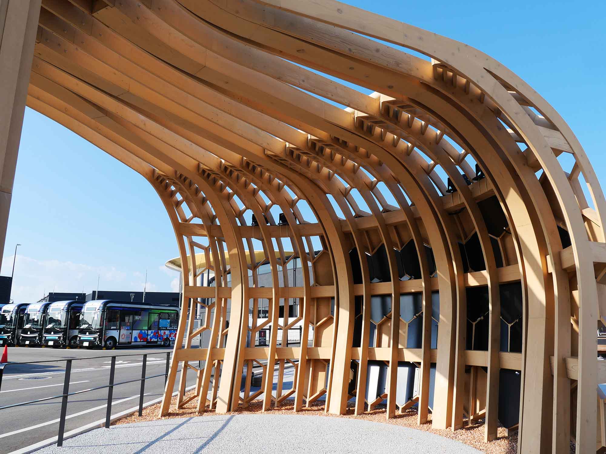 構造は鉄骨造に木質仕上げを施した構成で、全長約32m・幅3〜6m・高さ約4m、竣工は2025年2月。設計・施工は大和ハウス工業、木材の造形製作と組立は株式会社コトブキが担当しました。BIMやパラメトリックデザインを用い、初期設計段階から意匠と施工性の両立を図ることで、複雑な曲面や格子の精度と量産性を同時に実現しています。木材は停留所全体で積極的に活用されていますが、現時点で公表資料に具体的な樹種の明記は確認できていませんが、国産スギと思われます。 。木の温かい触感と視覚的な安らぎを前面に出しつつ、EVバスという次世代モビリティと響き合い、人とまち、そして万博と未来を結ぶ出発点として機能しています。