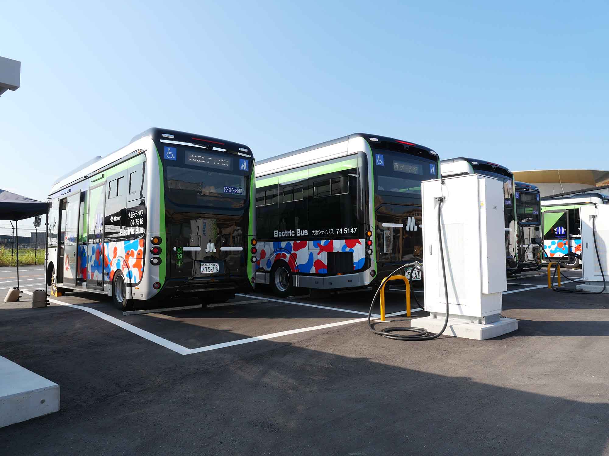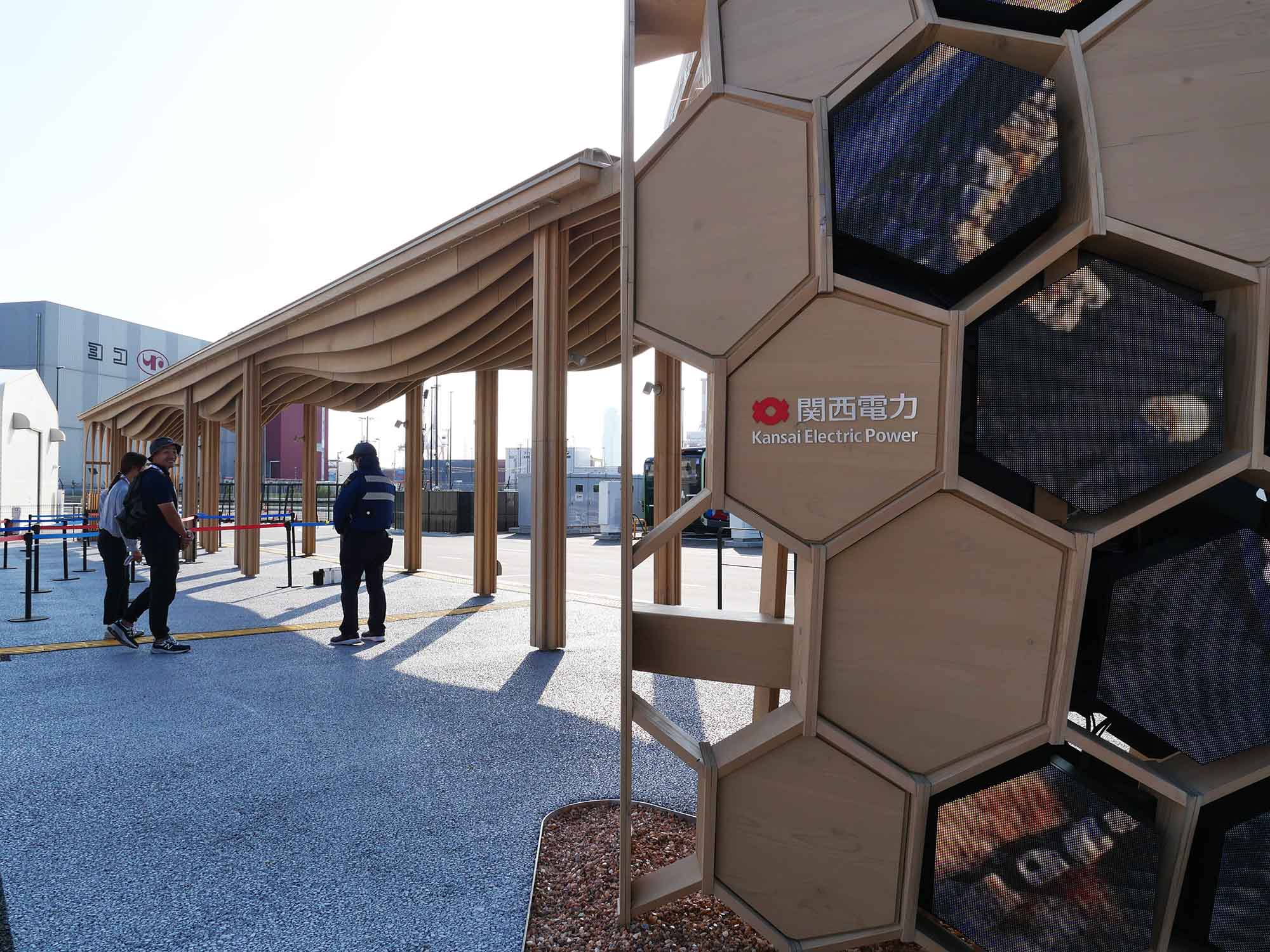 デザインは大阪湾に面した立地に呼応して「波」をモチーフとし、屋根のうねりで波の動きを、縦ルーバーで立ち上がる波を表現。正面に据えたボロノイ形状の格子とドーム型シェルターは、浜辺に打ち上がる波の一瞬を捉えたような有機的で彫刻的な造形です。ドーム内部には六角形のLEDモニターが組み込まれ、関西電力によるカーボンニュートラル発信「EXPO2025グリーンビジョン」の映像が流れます。サインとアート、インフラと展示が重なり合う“見せる停留所”として、夕刻には照明演出が加わり幻想的な表情を見せます。