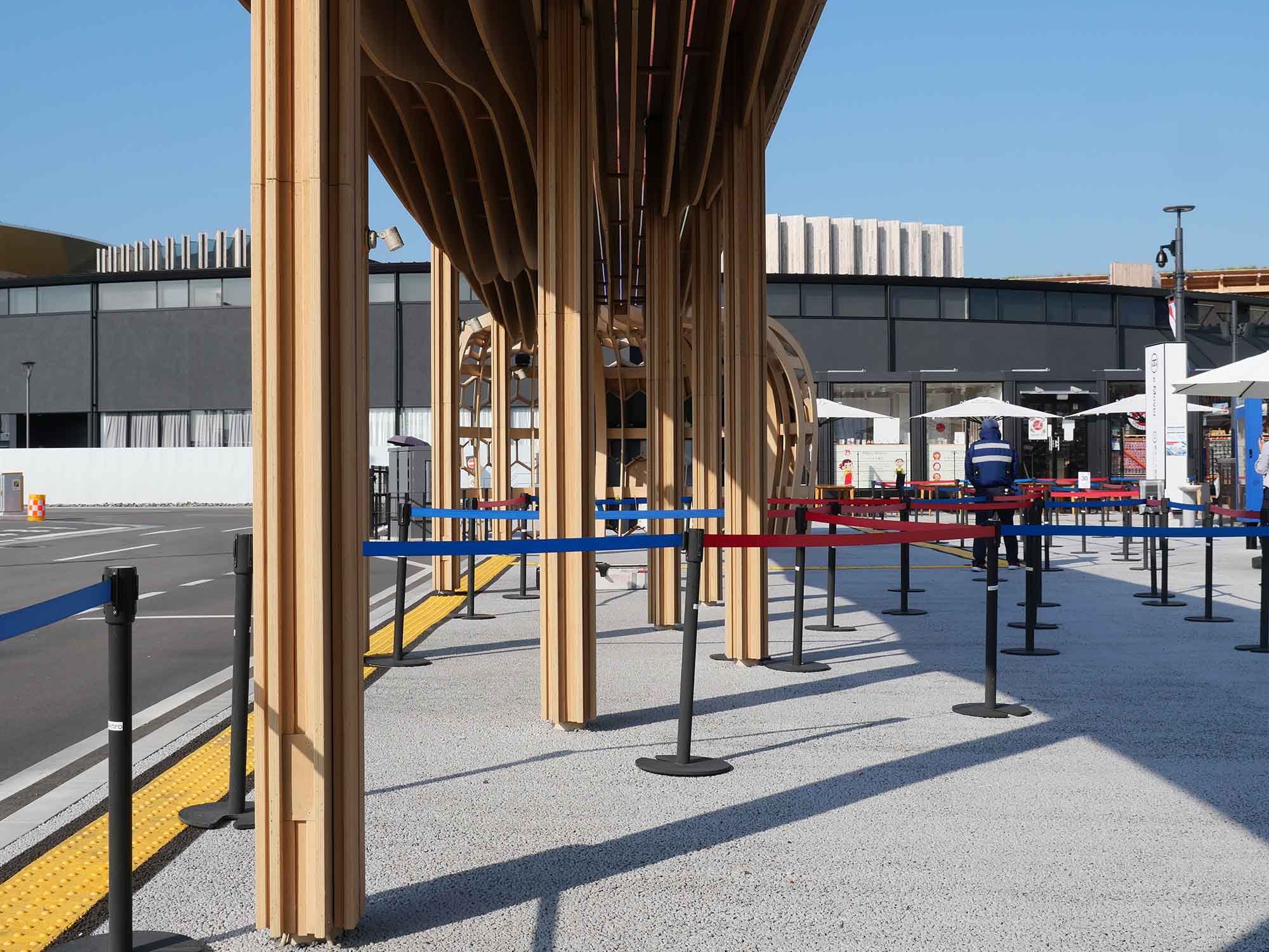 東ゲート南停留所は、環境配慮・快適性・デザイン性、そして「未来に向けた新たな体験価値の創出」をテーマに設けられた、会場内外周路を走るEVバス「e Mover」のための停留所です。森林の循環――“伐って、使って、植えて、育てる”――をイメージとして据え、「持続可能な未来社会」を木質の質感で可視化しています。
