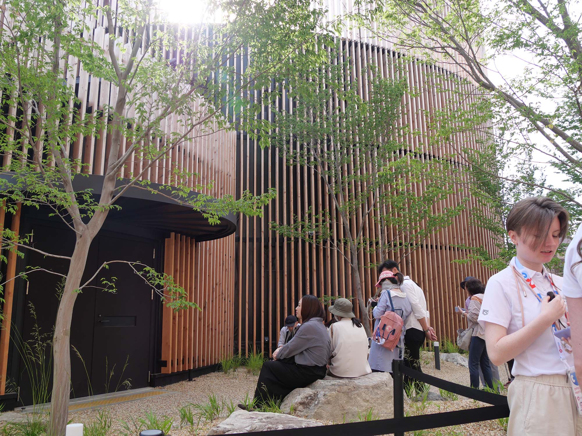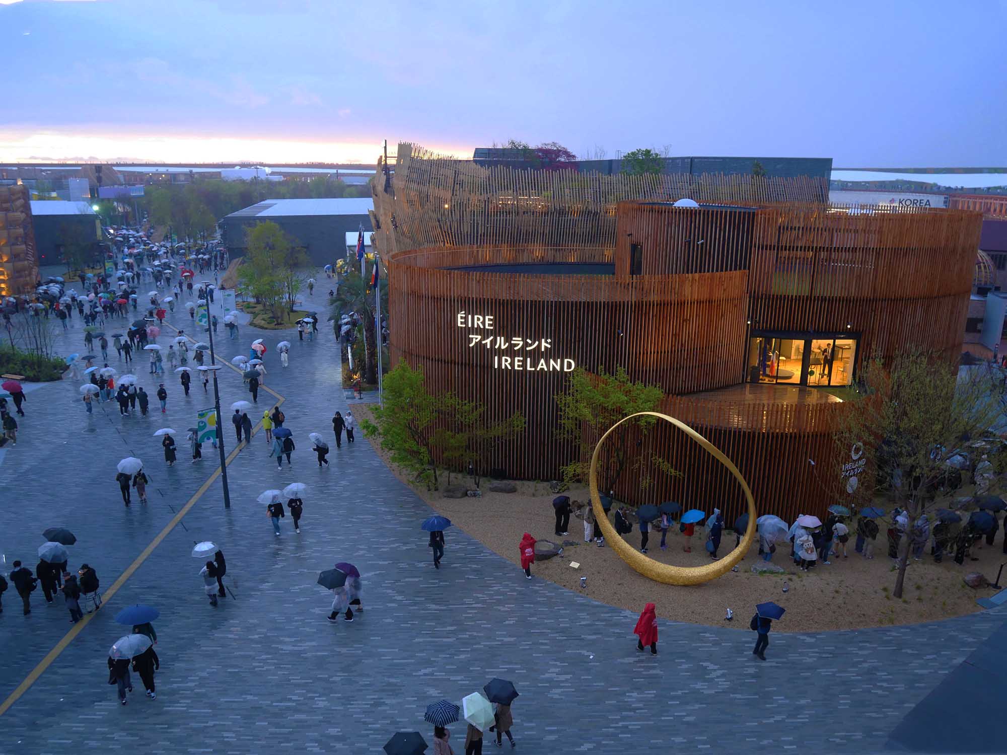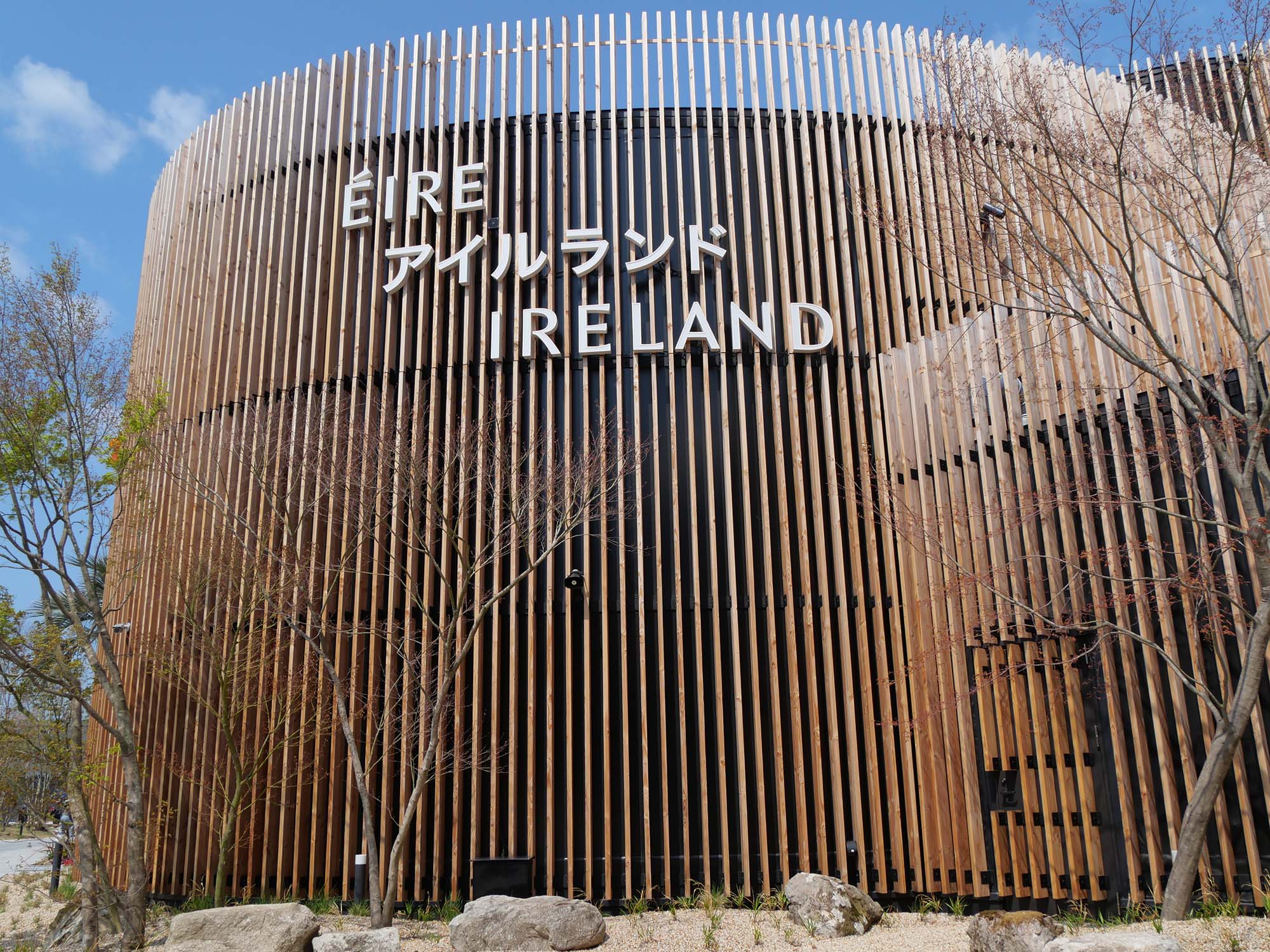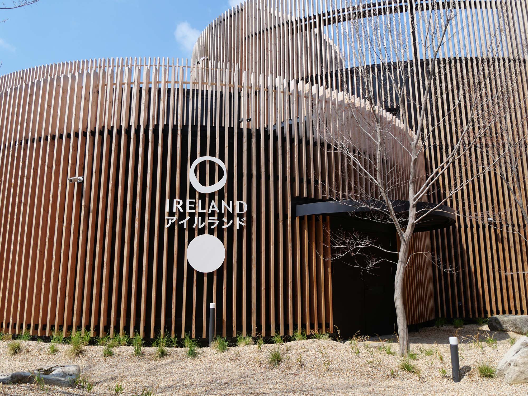 外装には、アイルランド森林公社Coillteが提供したアイルランド産ダグラスファー(ベイマツ)を使用。木材を縦格子的に丁寧に配した外壁は、隣接する会場構造物「グランドルーフ」の木材と色調や質感が調和し、アイルランドと日本双方の木工芸の伝統を想起させます。曲線を多用した形状のため、施工では高い精度が求められ、担当したTSP太陽は「曲線を美しく仕上げることが最も難しかった」と述べています。建物は2024年12月25日に竣工しました。そして万博会場の中で一番最初のパビリオン完成建築でした。