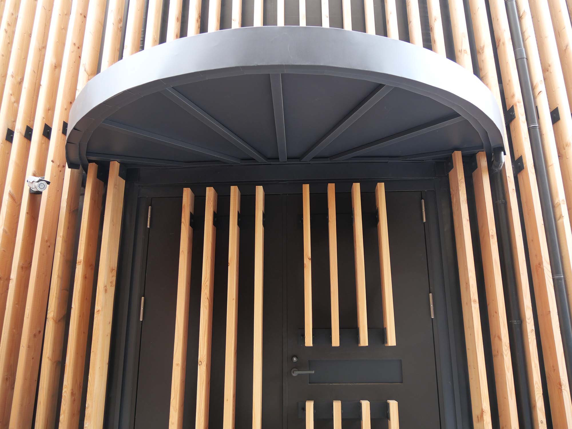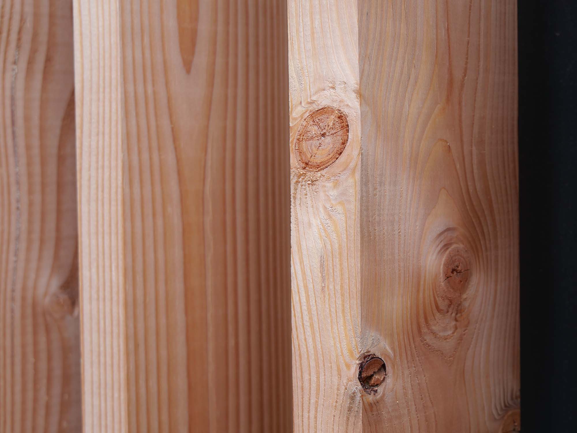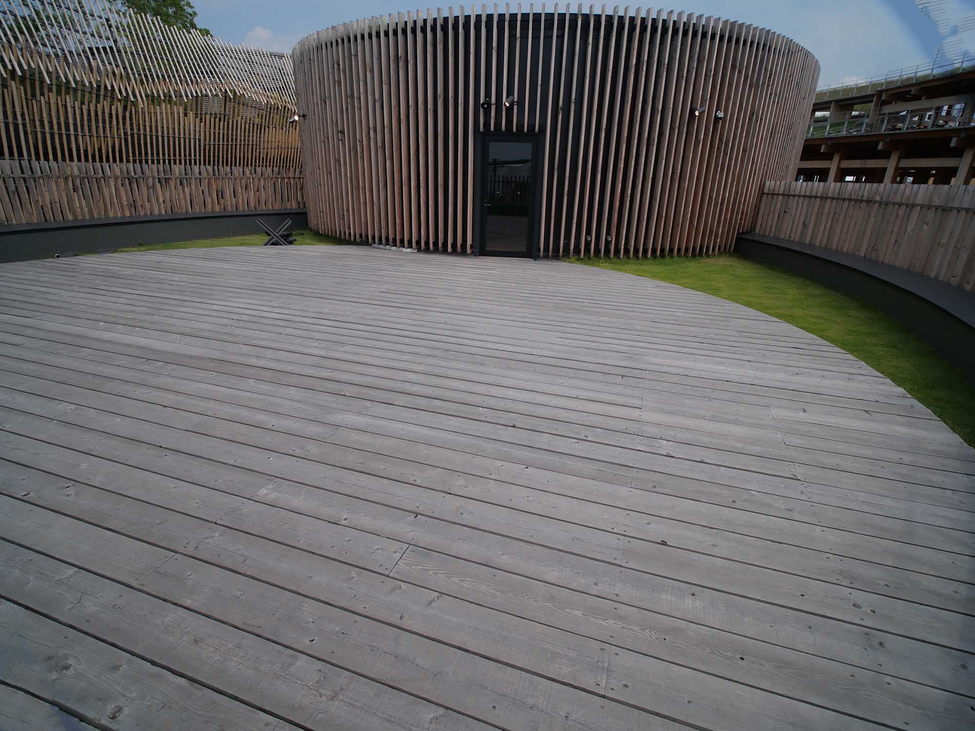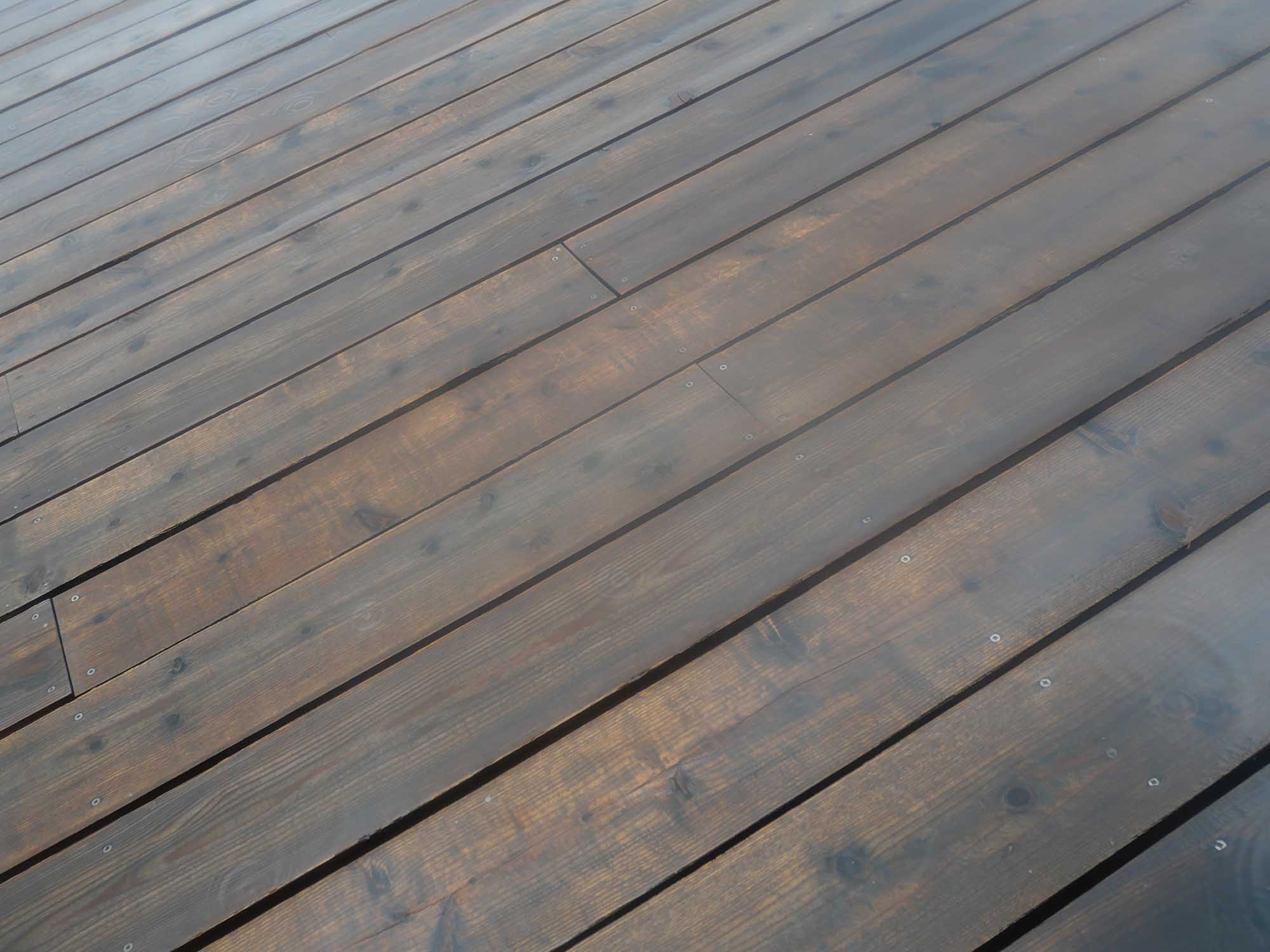 屋上のウッドデッキは杉を利用したもので、寸法や規格としては足場板と同様に製材されたものと思われる。