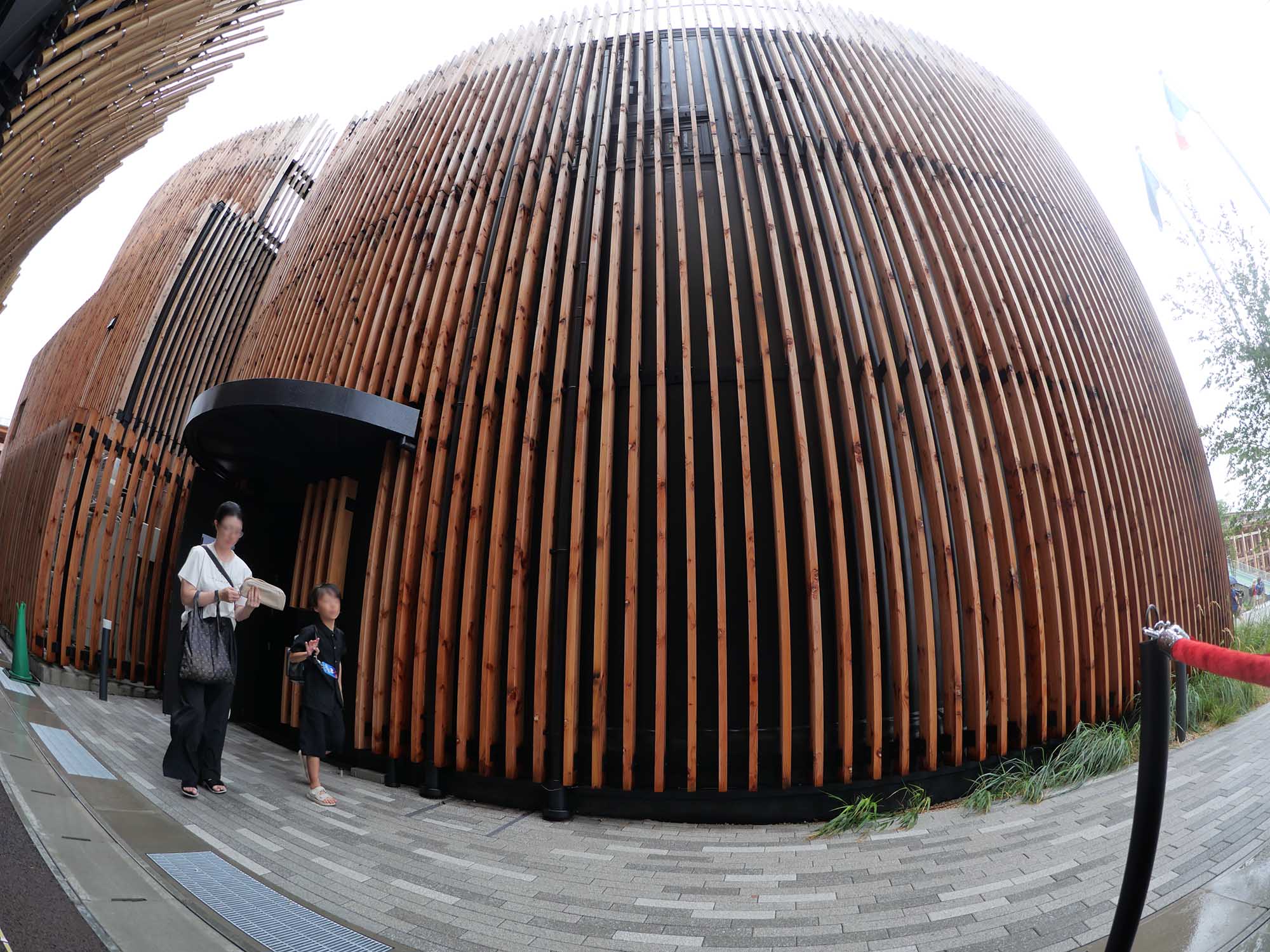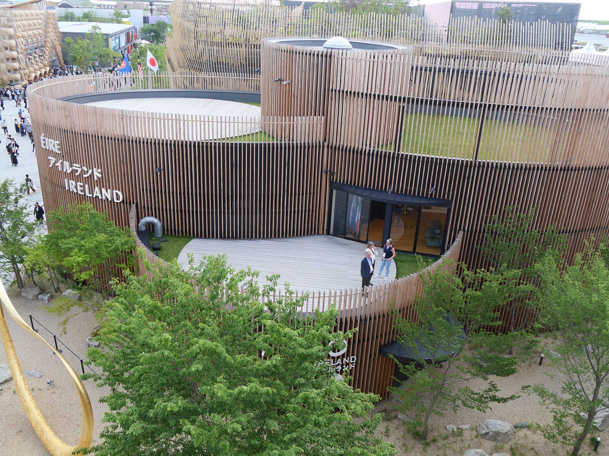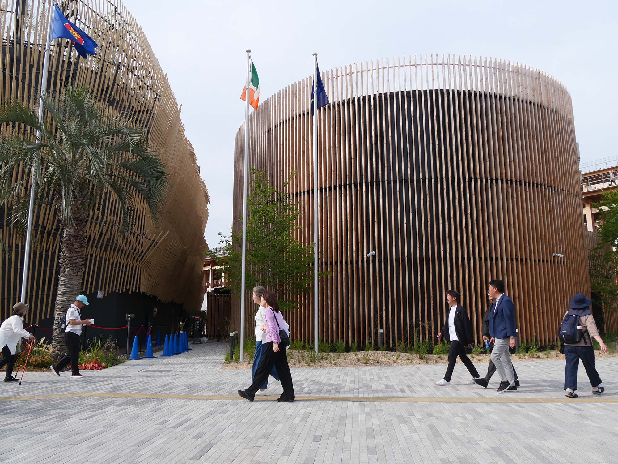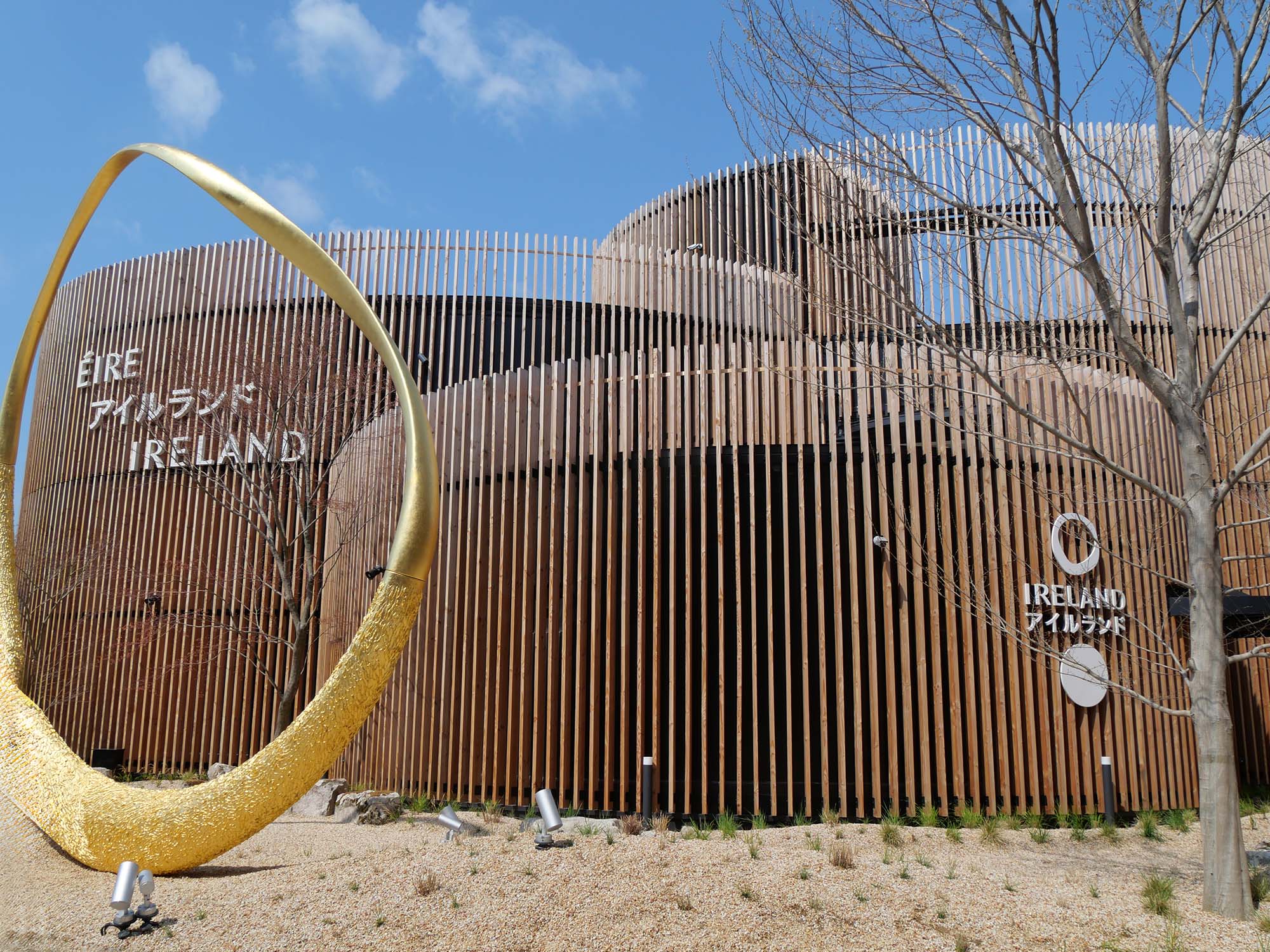 アイルランド館は、アイルランド政府公共事業局(Office of Public Works /OPW)が設計した木造パビリオン( 構造は鉄骨)で、古代ケルトの象徴「トリスケル(三重螺旋)」をモチーフとしています。三つの楕円形の建物が中央の連結空間でつながり、全体で抽象的な三脚座を立体的に表現。高さは約7.4m、延べ面積約745㎡とコンパクトながら、独特の曲線美が際立ちます。