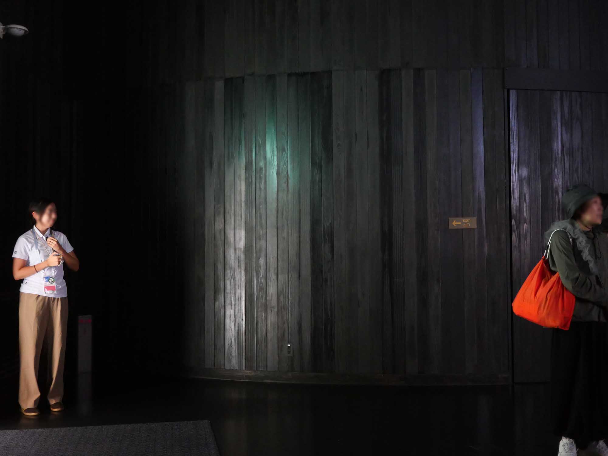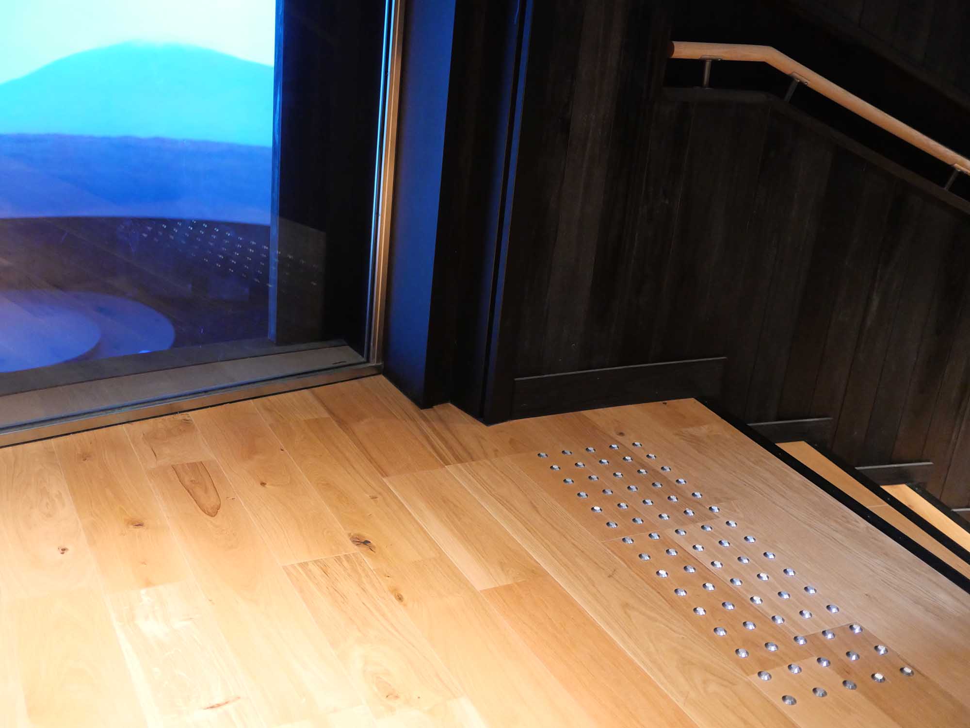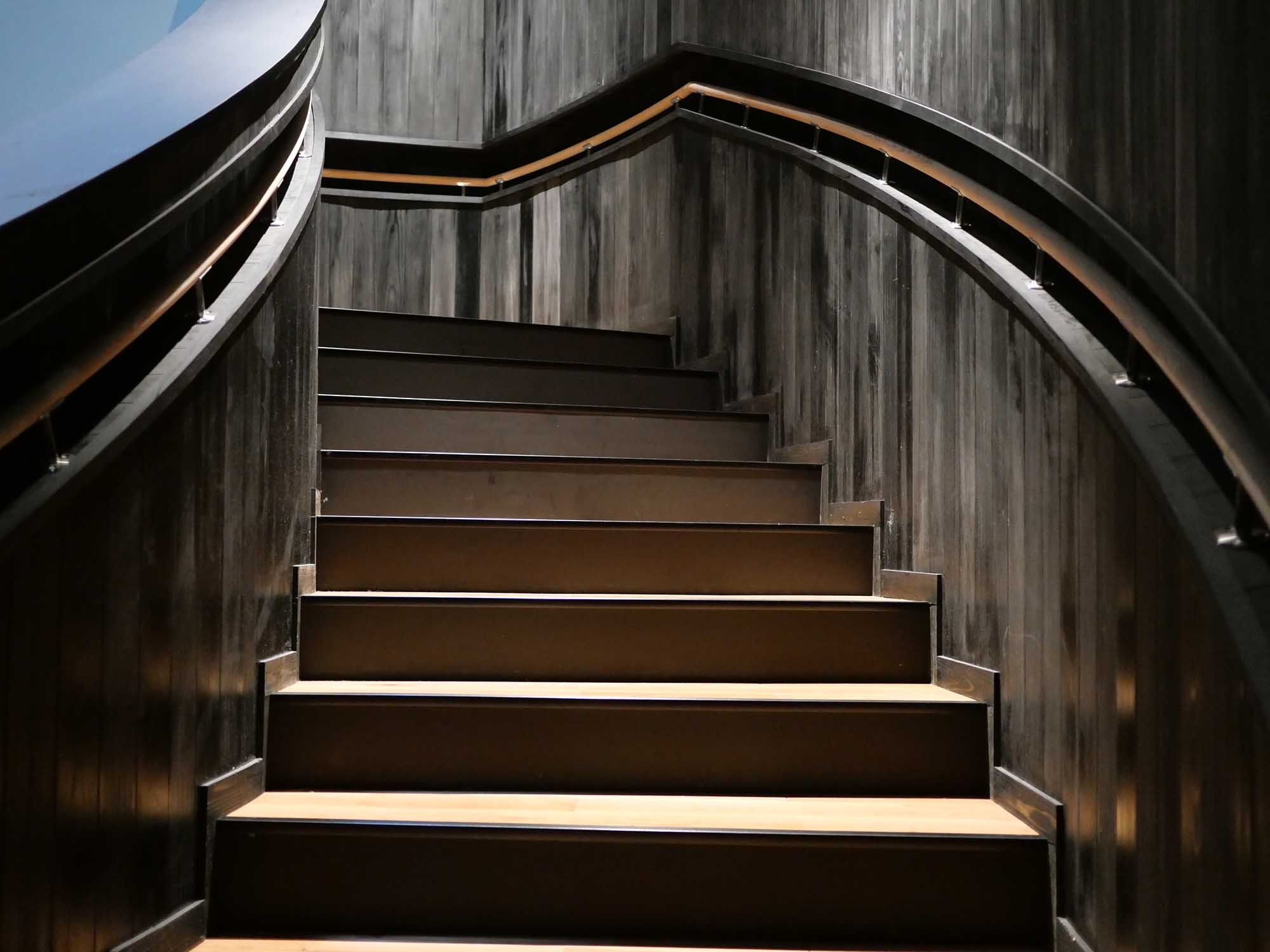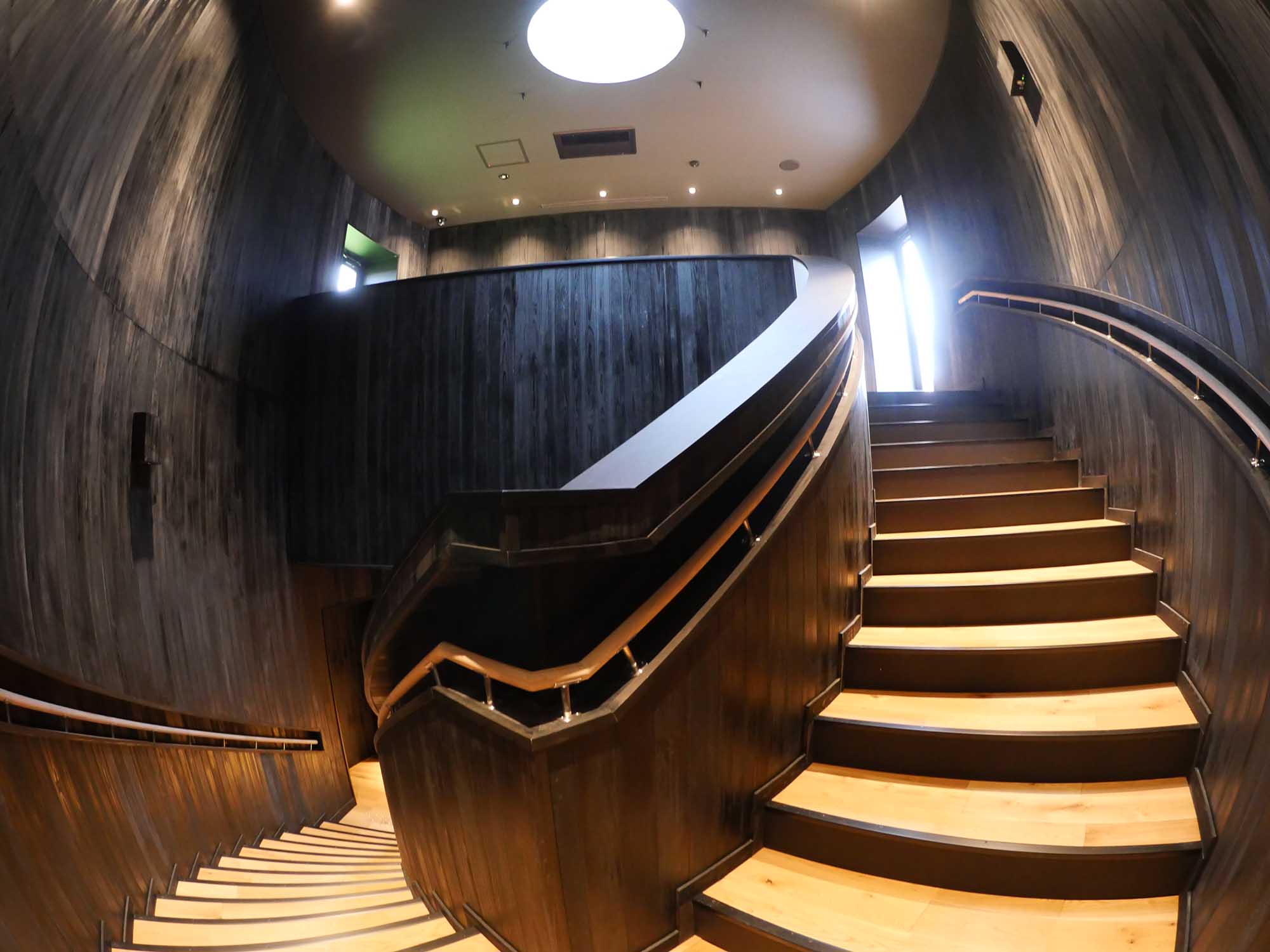 内装は独特の黒に塗装された吉野産のスギが統一的に使われています。そのため落ち着いた雰囲気を醸し出しています。2階への階段ではオーク無垢材の段板が使われています。手すりの取り付けは大工の腕の見せ所のように壁に中に埋まるように作り込みされている。他のパビリオンでは見ないもの。これは階段の幅がより広く使えることになります。