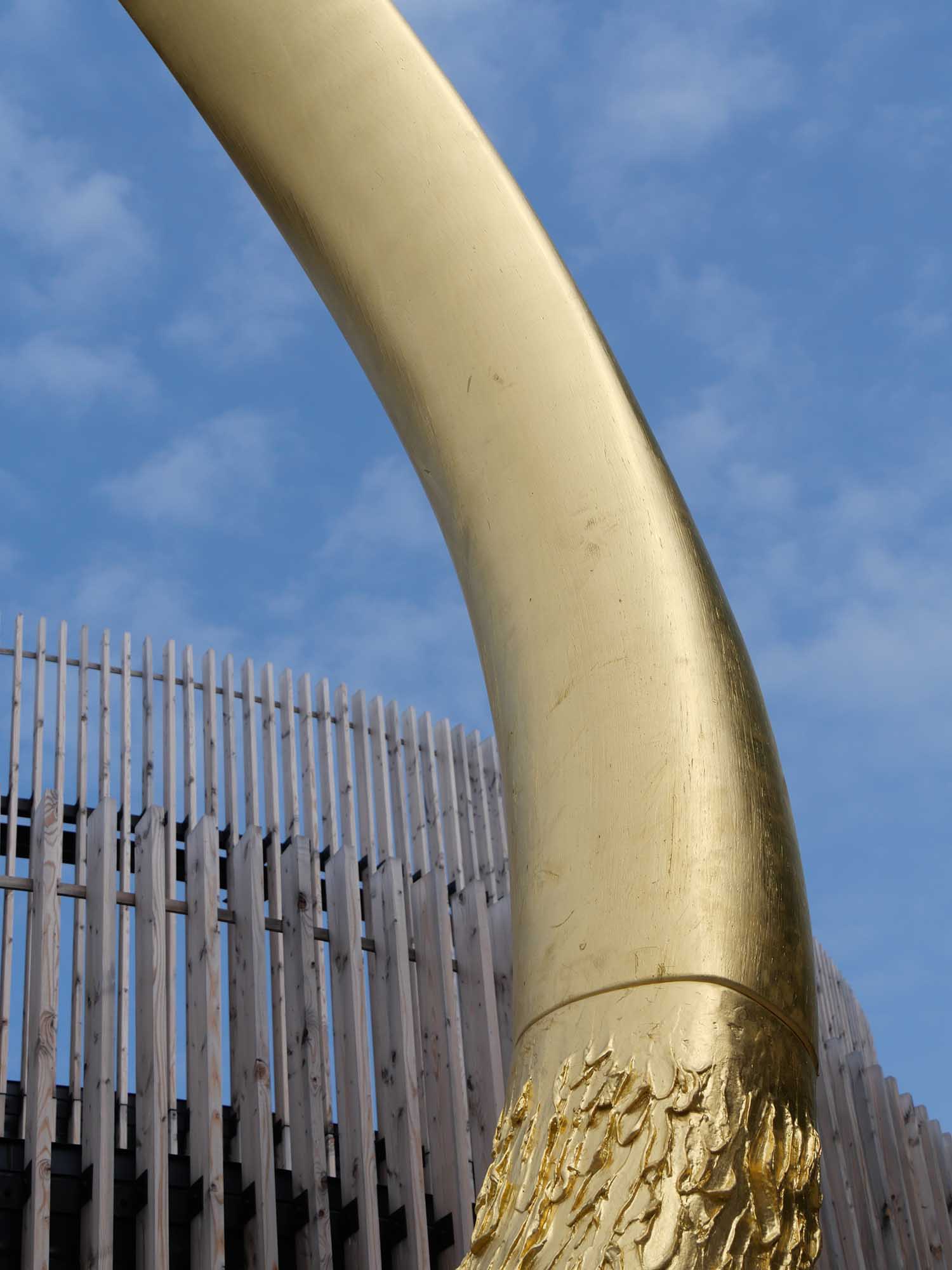 屋外には、アイルランド人造形作家ジョセフ・ウォルシュによる高さ6mの彫刻《Magnus RINN》を設置。ブロンズから積層オーク、金箔へと素材が変化する構造で、「RINN」という語が持つ「場所」「輪」「つながり」の意味を体現。アイルランドと日本の文化交流と自然との共鳴を象徴しています。