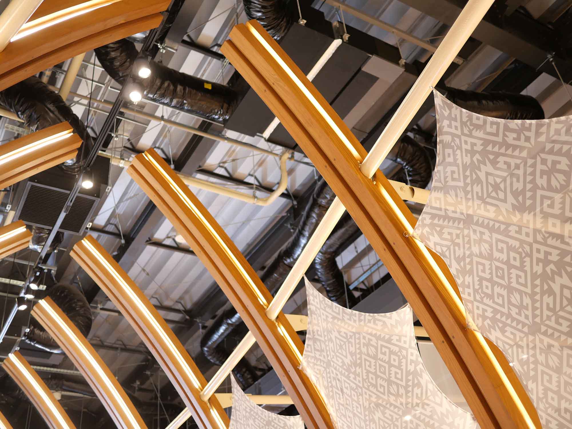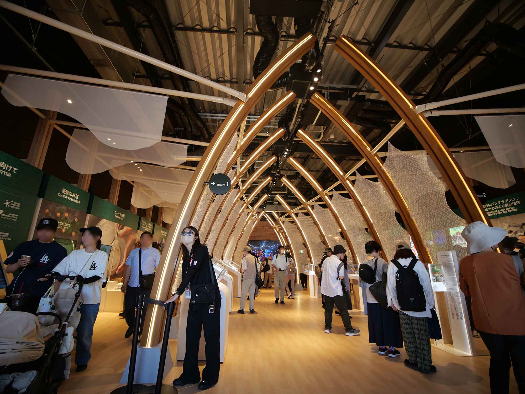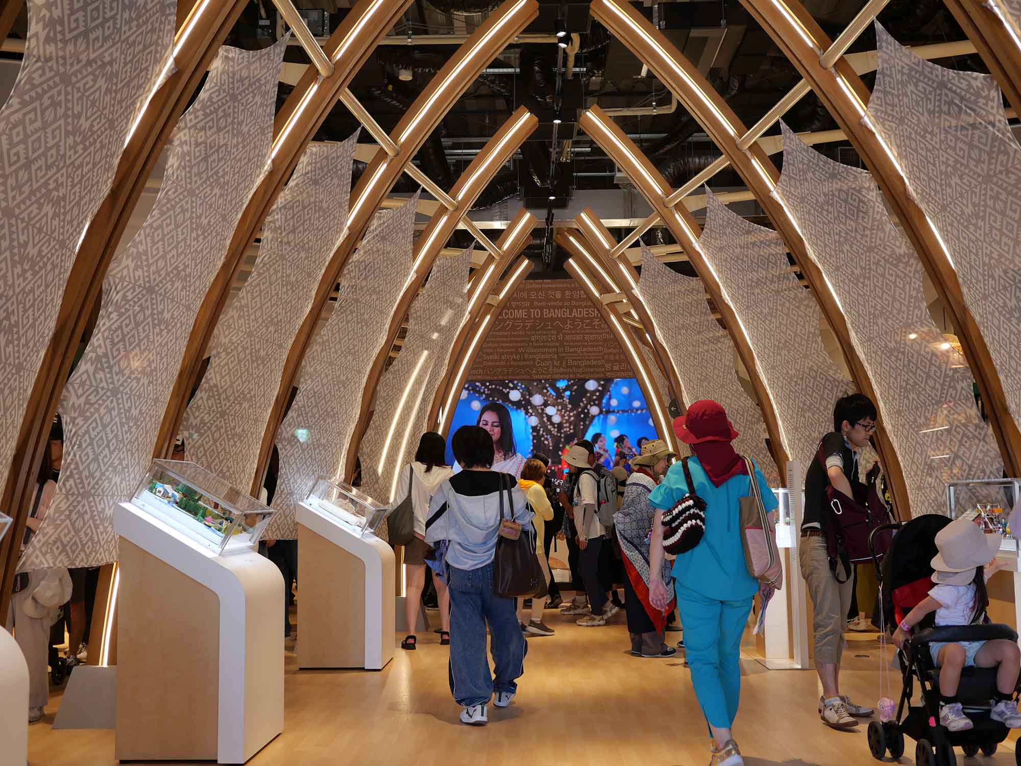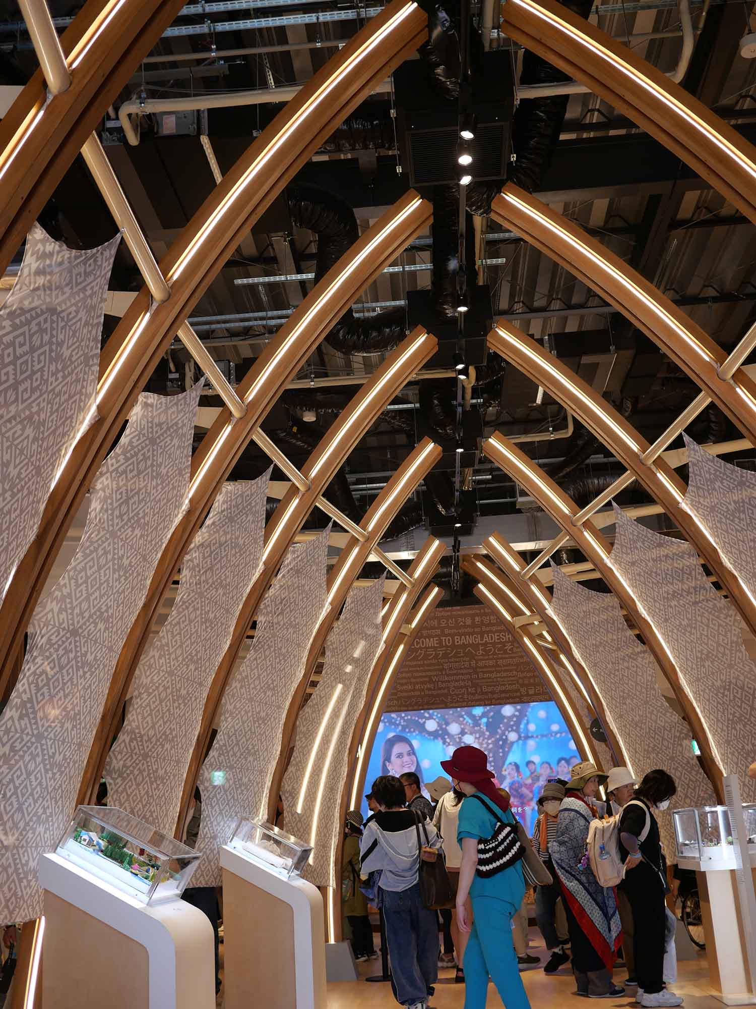バングラデシュ館は、「いのちをつなぐ:伝統とイノベーションが調和する国」をテーマに掲げ、国の豊かな文化遺産と現代の発展、そして持続可能な未来への取り組みを紹介しています。外観では幾重にも連なる木のフレームが印象的で、左右から緩やかにカーブする形状は「バングラデシュと日本など世界各国が手を合わせる」姿を象徴しています。この木造フレームは国産スギ材と思われ、オイルステイン系の塗料で仕上げられており、環境に配慮したカーボンゼロ建築としても注目されています。構造は伝統的なベンガル地方の建築様式に現代的デザインを融合させ、国土を縦横に走る河川の流れや人々のつながりを空間的に表現しています。