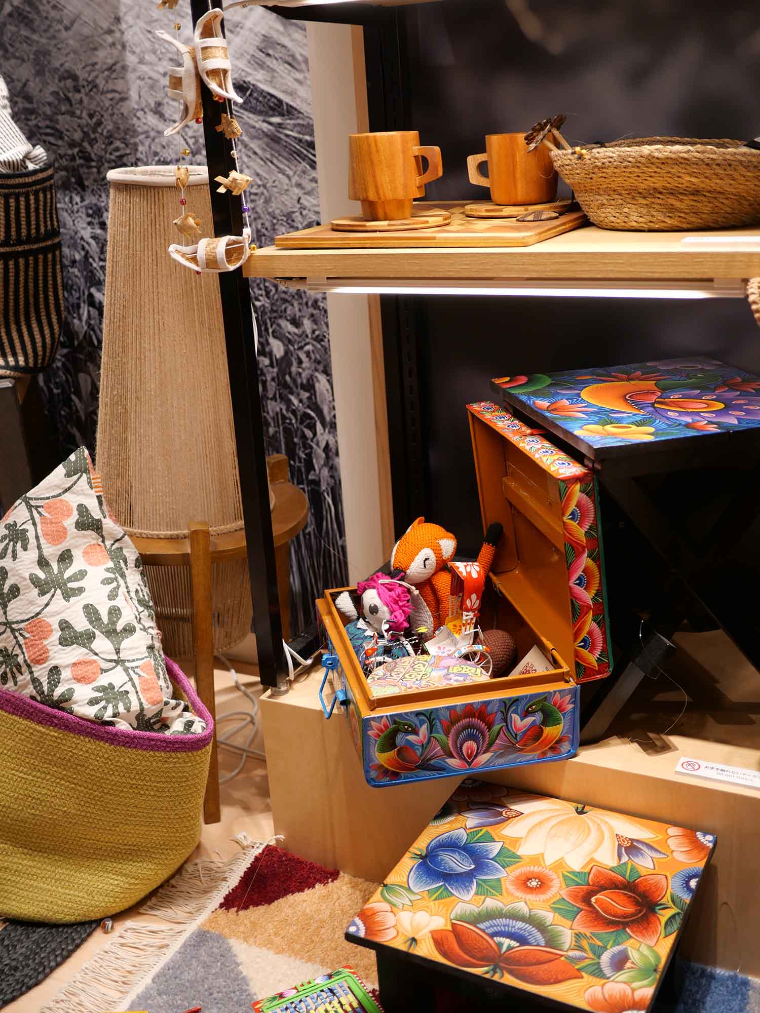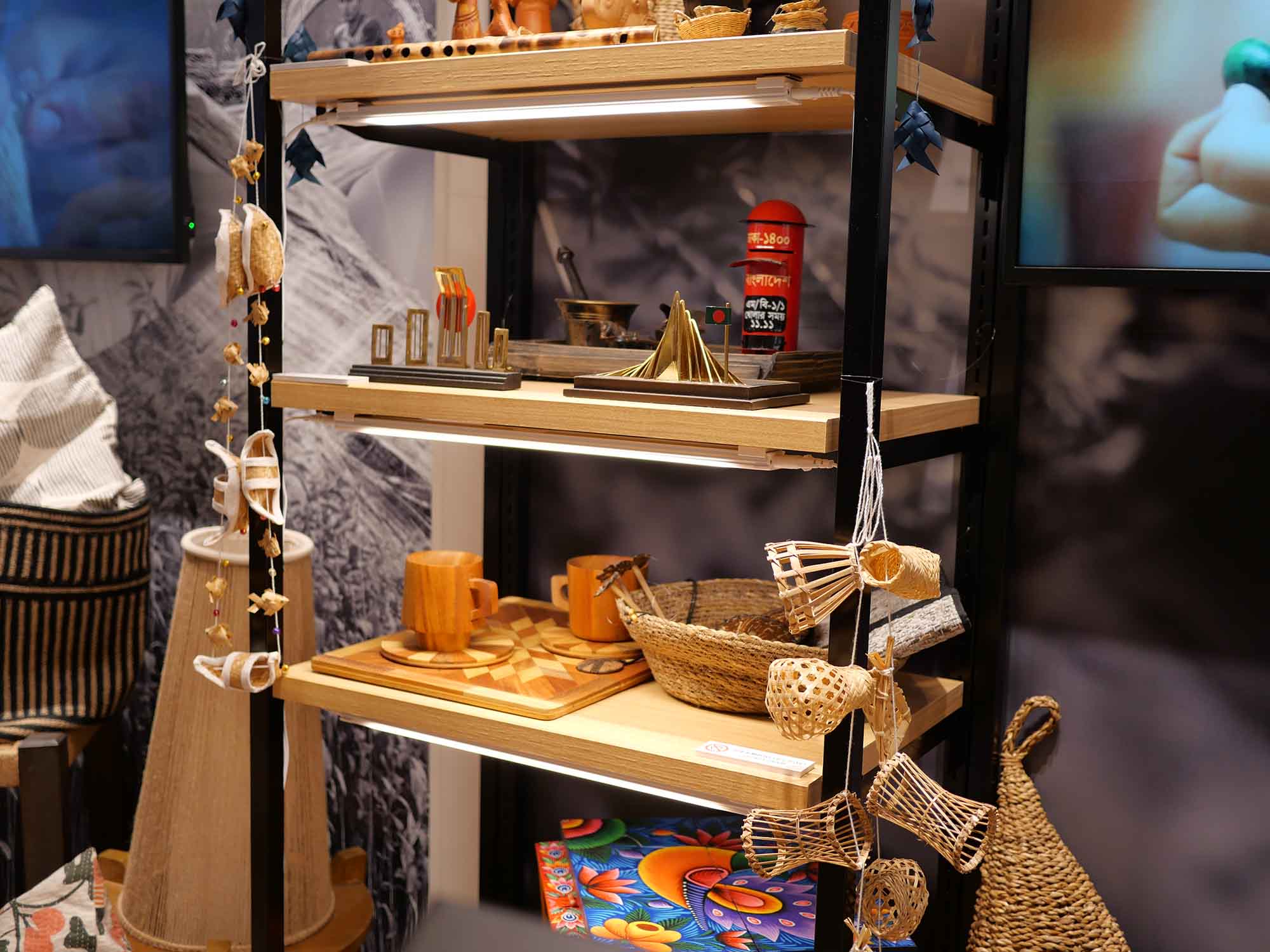 館内には、バングラデシュの繊維文化を象徴する展示が並び、手刺繍布「ノクシカタ」や伝統的な「ジャムダニ織り」、復元されたモスリンなどが来場者を迎えます。さらに、サステナブル素材として世界的に注目される「ジュート(ゴールデンファイバー)」製品や、高品質のレザー、アパレル、製薬、農業など、同国の主要産業や技術革新を紹介しています。展示の一角では、職人による手織りの実演や液晶画面を用いた地形・産業紹介、そして河川や農村の生活を再現したミニチュア模型なども設けられ、伝統と近代化が共存するバングラデシュの姿を体感できるようになっています。