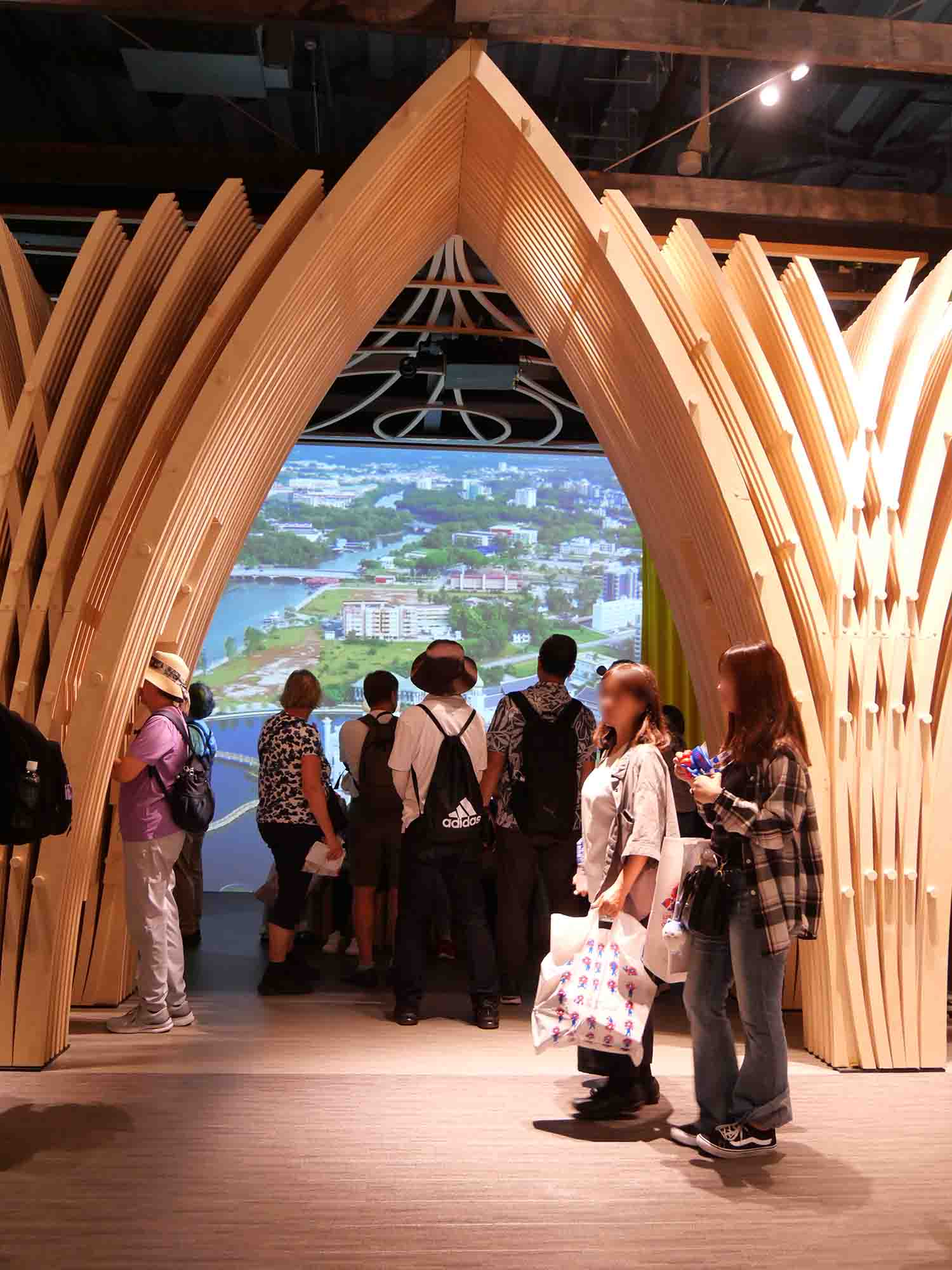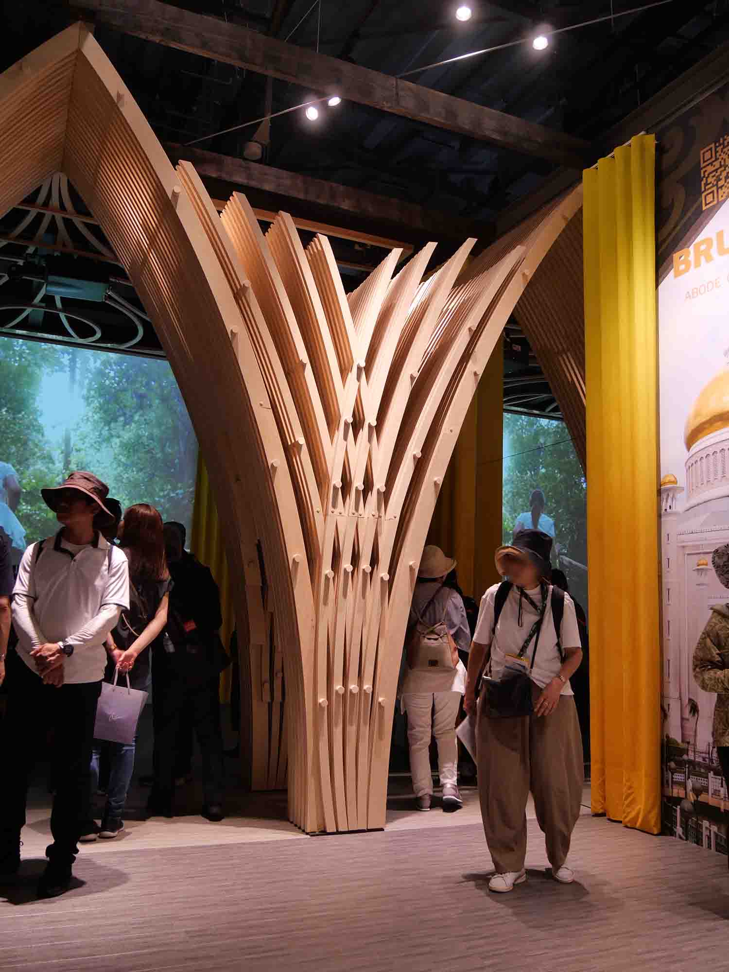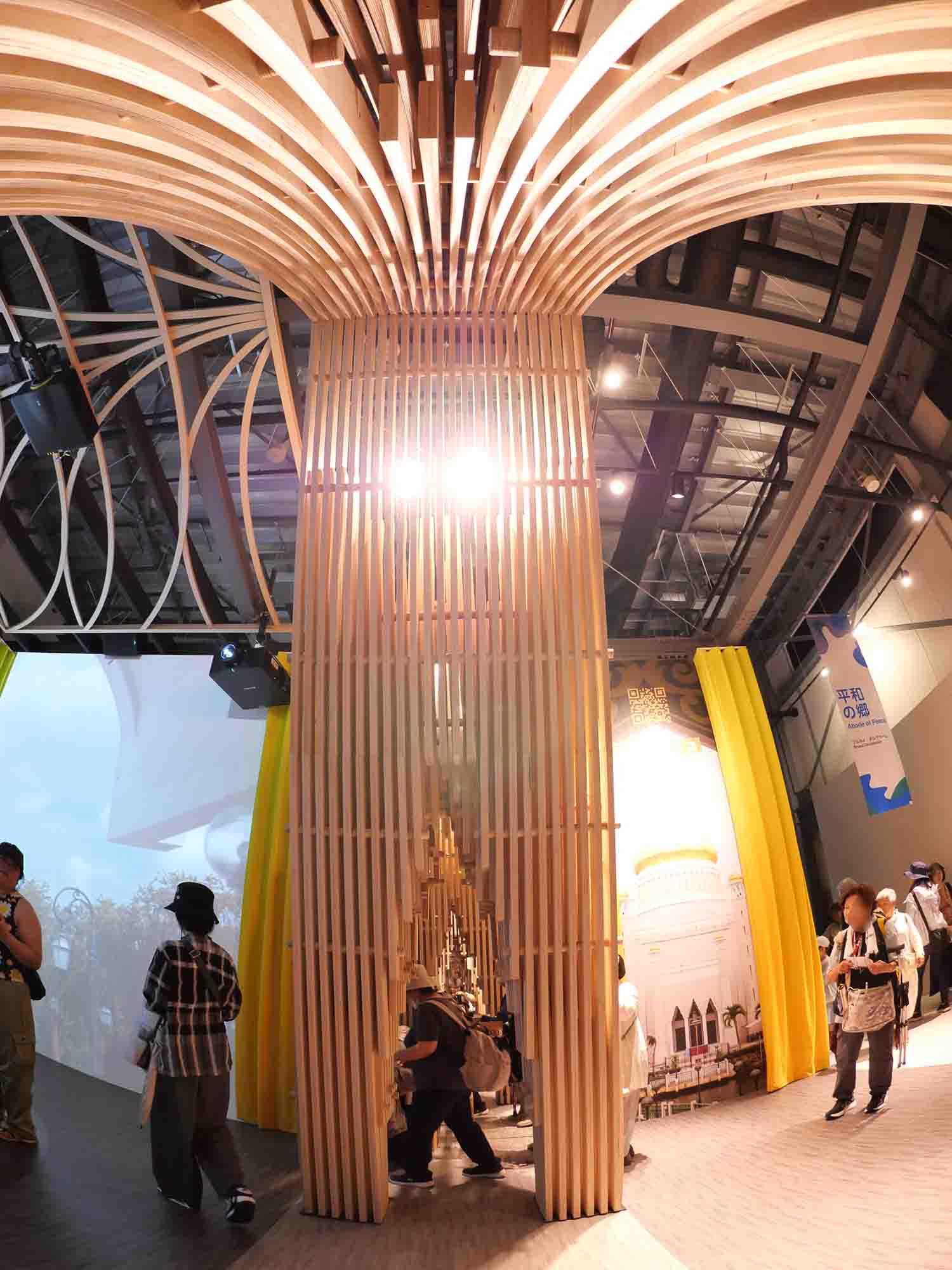 ボルネオ島(ブルネイ)の文化と穏やかな暮らしを紹介する小規模パビリオンです。国土の約70%が熱帯雨林に覆われ、「平和の郷」として知られています。映像と木質デザインを組み合わせ、休憩もできる落ち着いた空間になっています。なお世界で3番目に大きい島、インドネシアではカリマンタン島と呼びます。