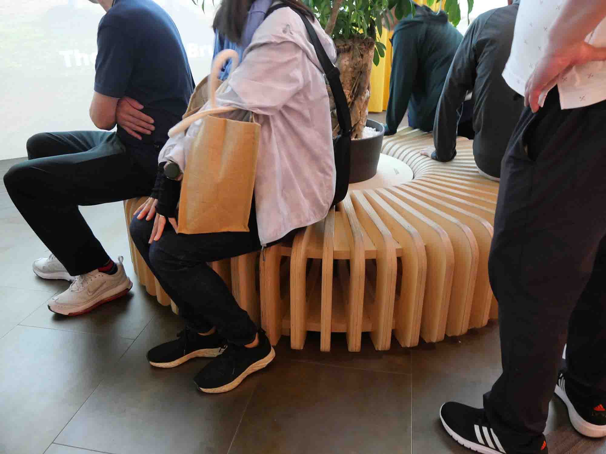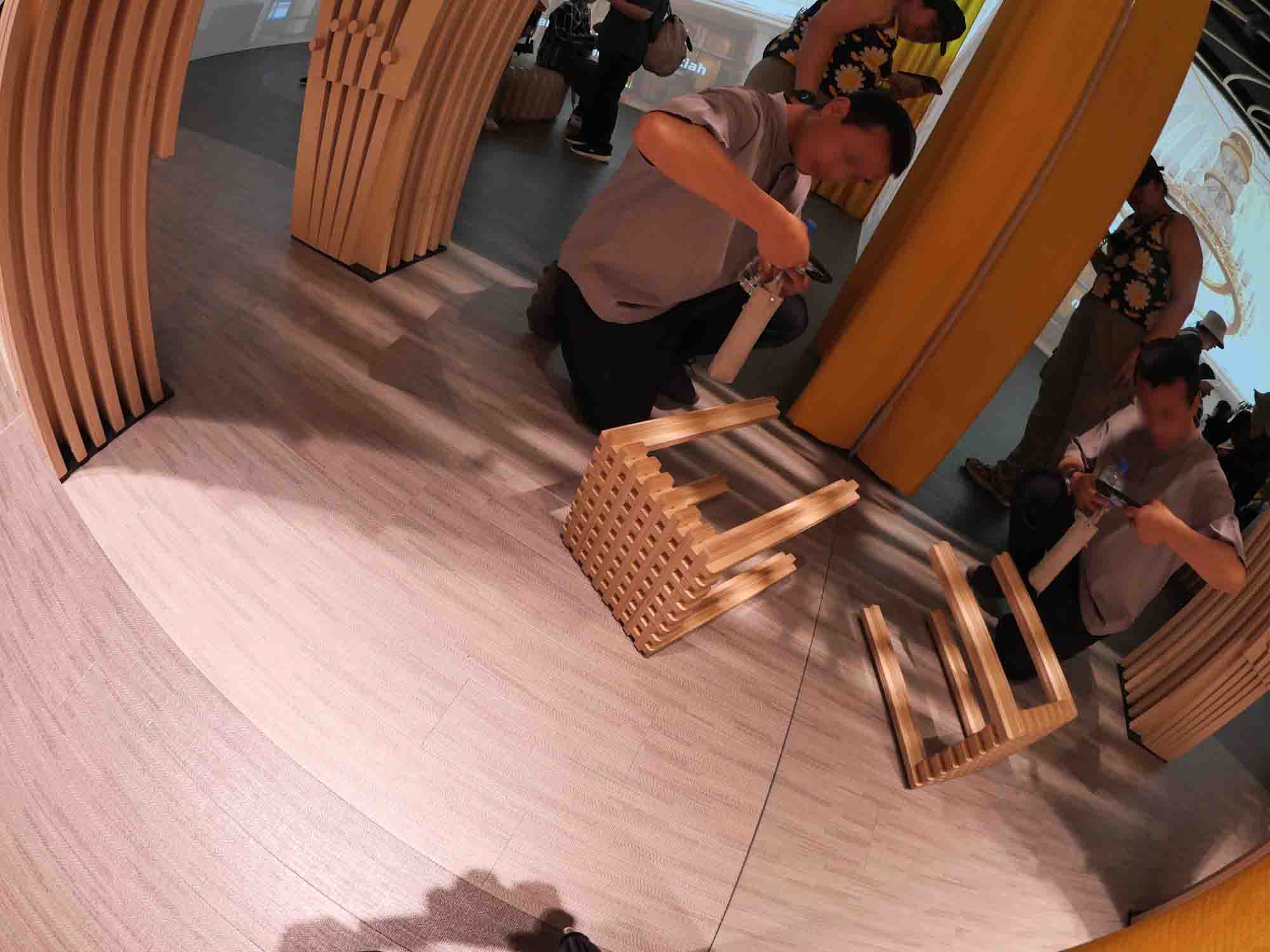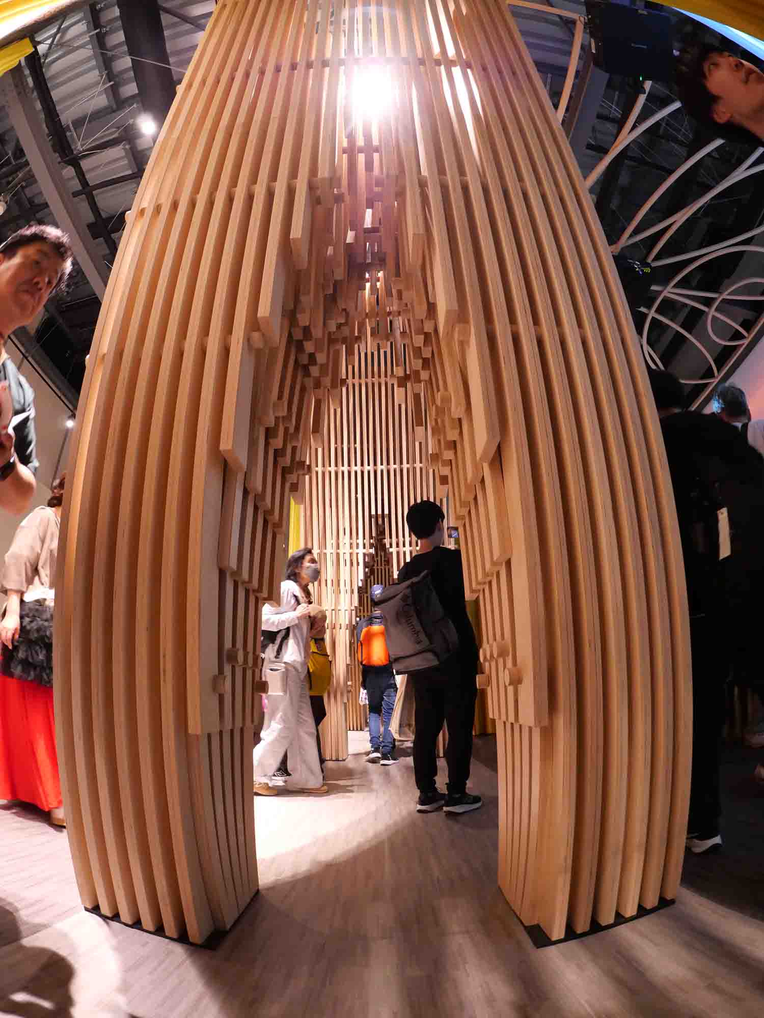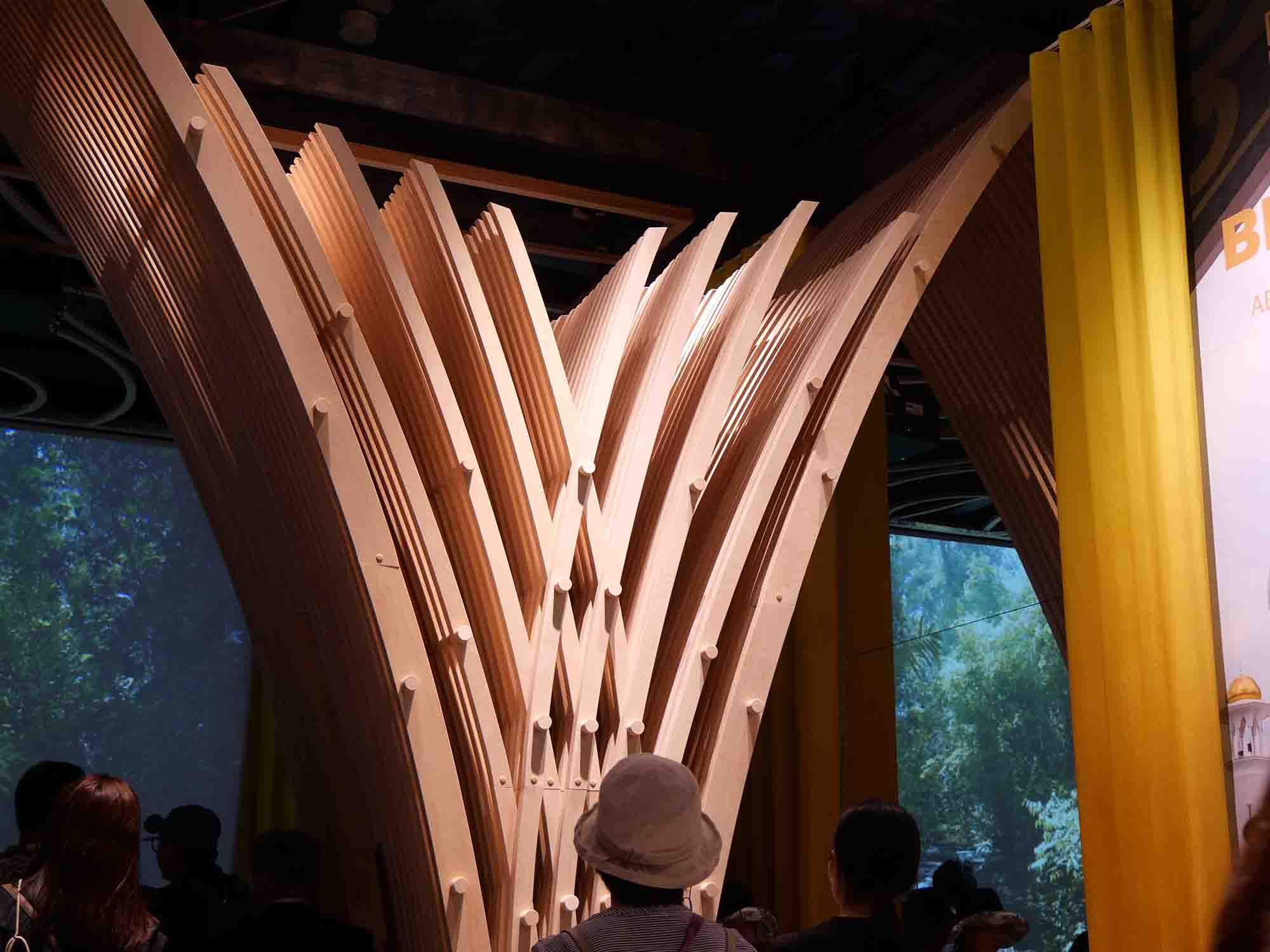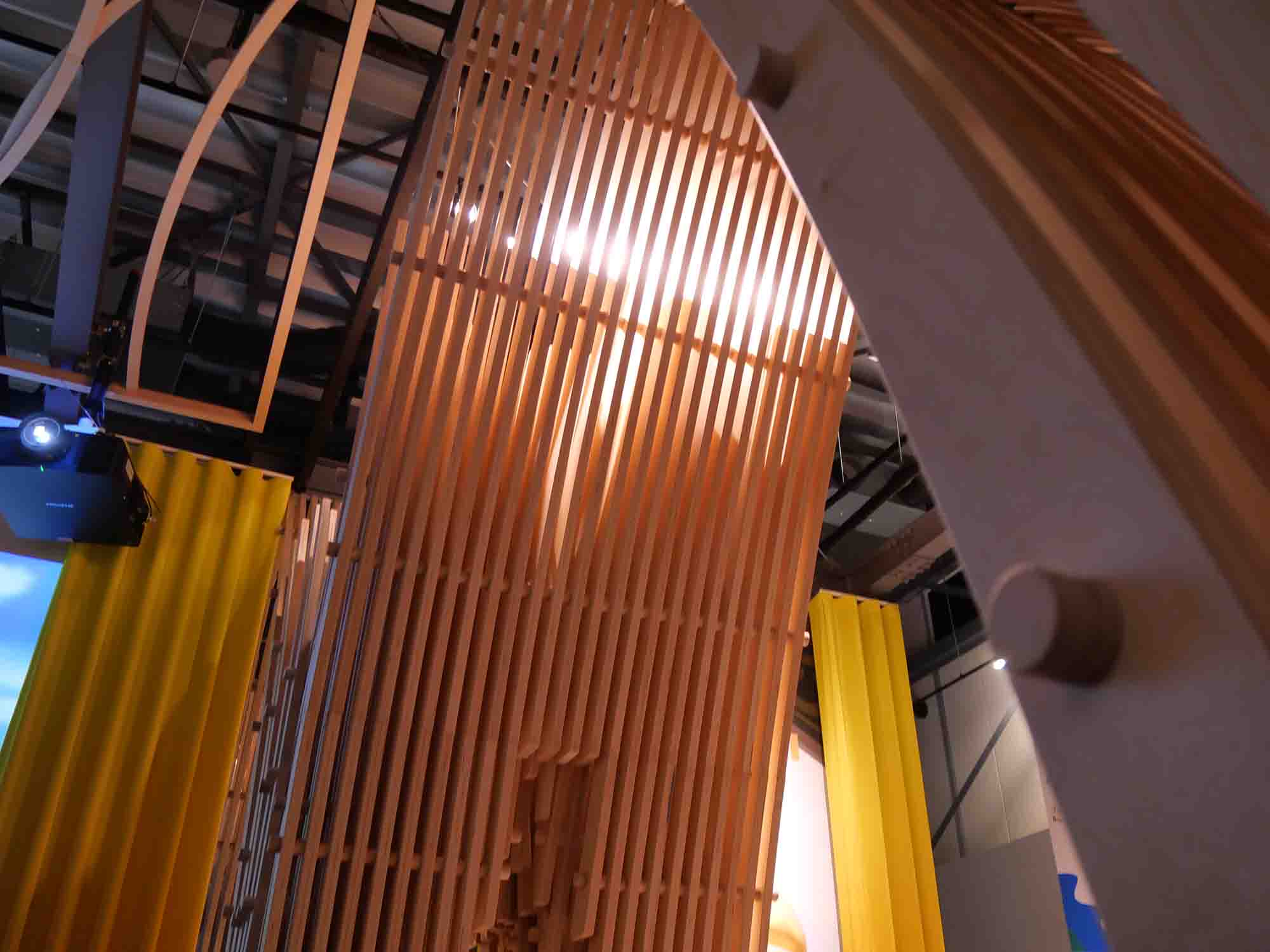 内部の木質部分はすべて白樺合板(Birch plywood)です。アーチや格子、棚などは、CNC加工で数百枚の白樺合板をスラット状に切り出し、組み合わせて形作られています。