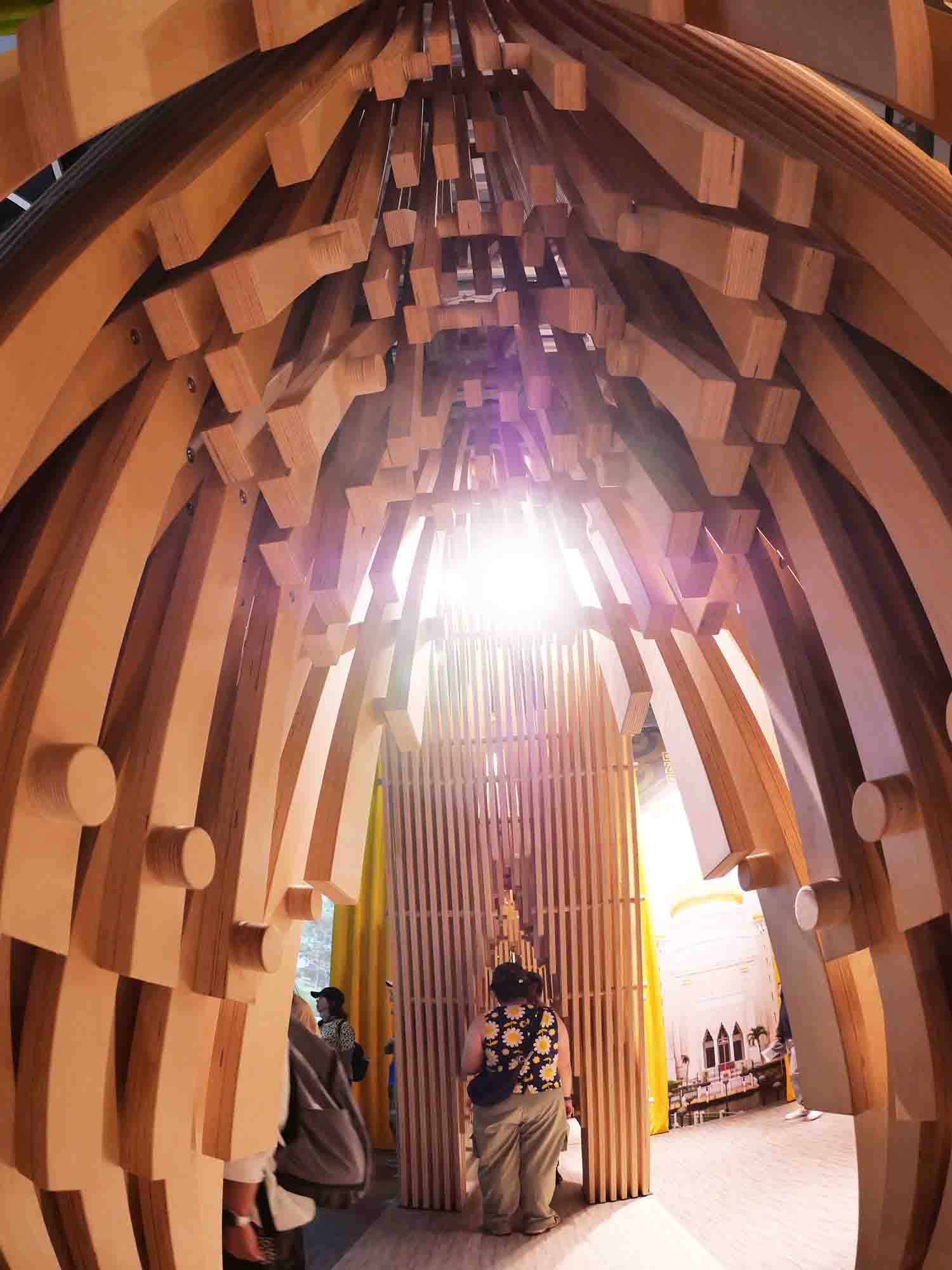 木製アーチのフォトゾーン 白樺合板の格子アーチと鏡によって空間が伸びて見えます。「王宮と大阪の街をつなぐ橋」をイメージしています。