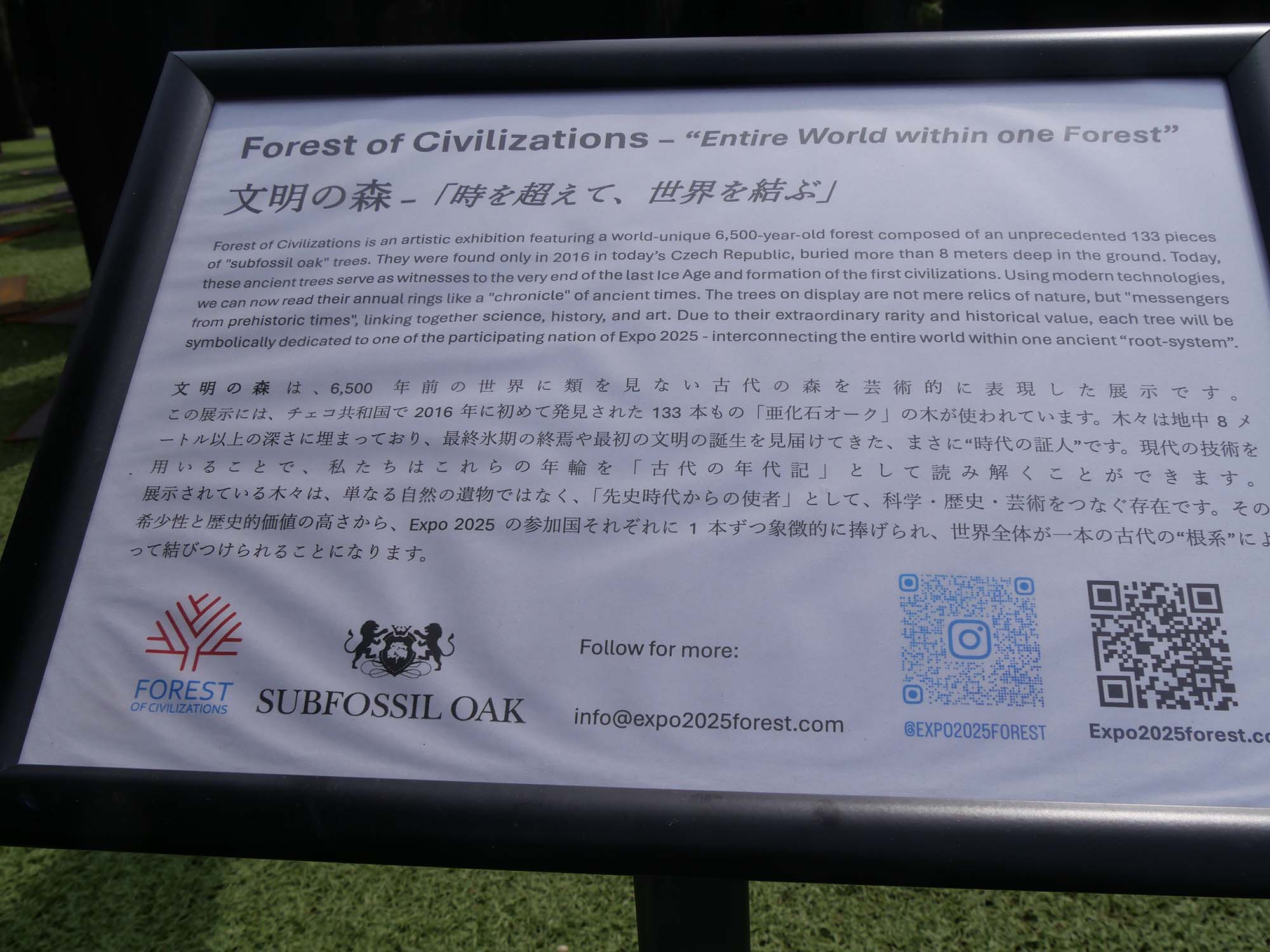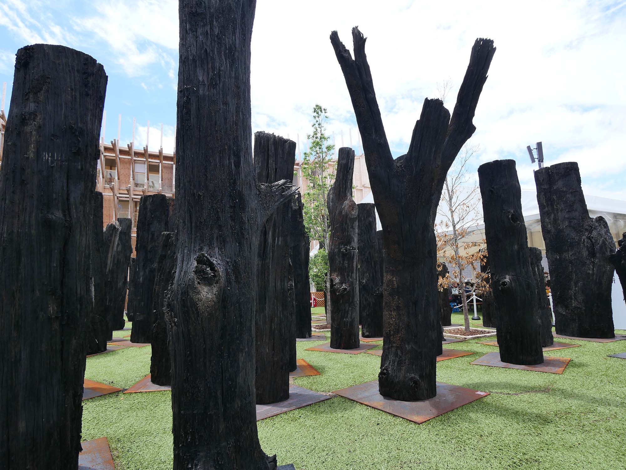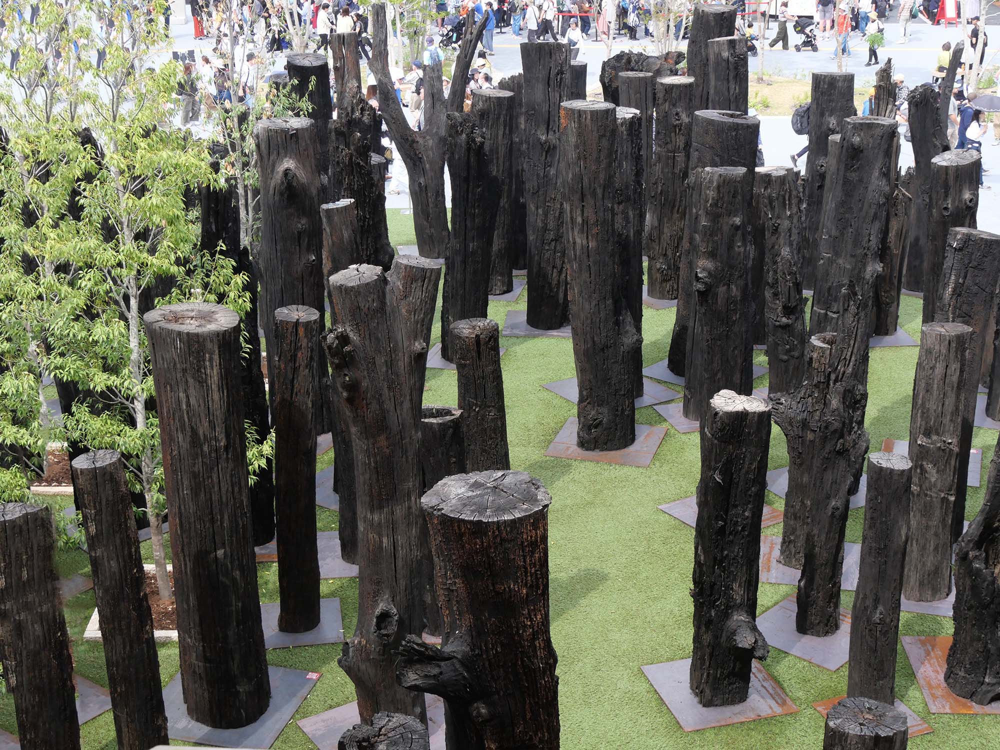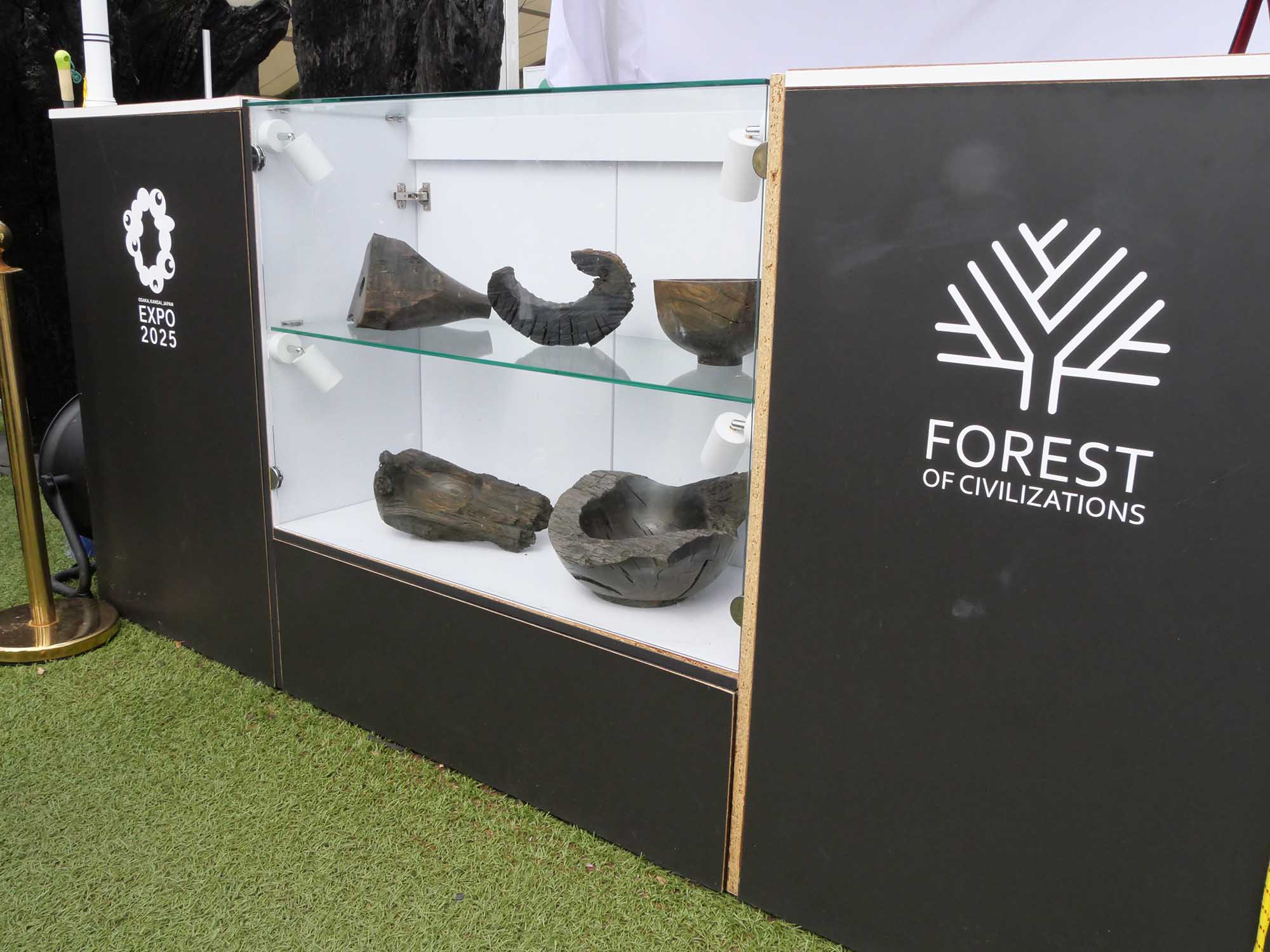 「文明の森(Forest of Civilizations)」は、チェコの企業 Subfossil Oak s.r.o. による展示です。約6500年前のオークの亜化石(ボグオーク)133本を使用し、1本ずつが2025年万博の参加国に捧げられています。