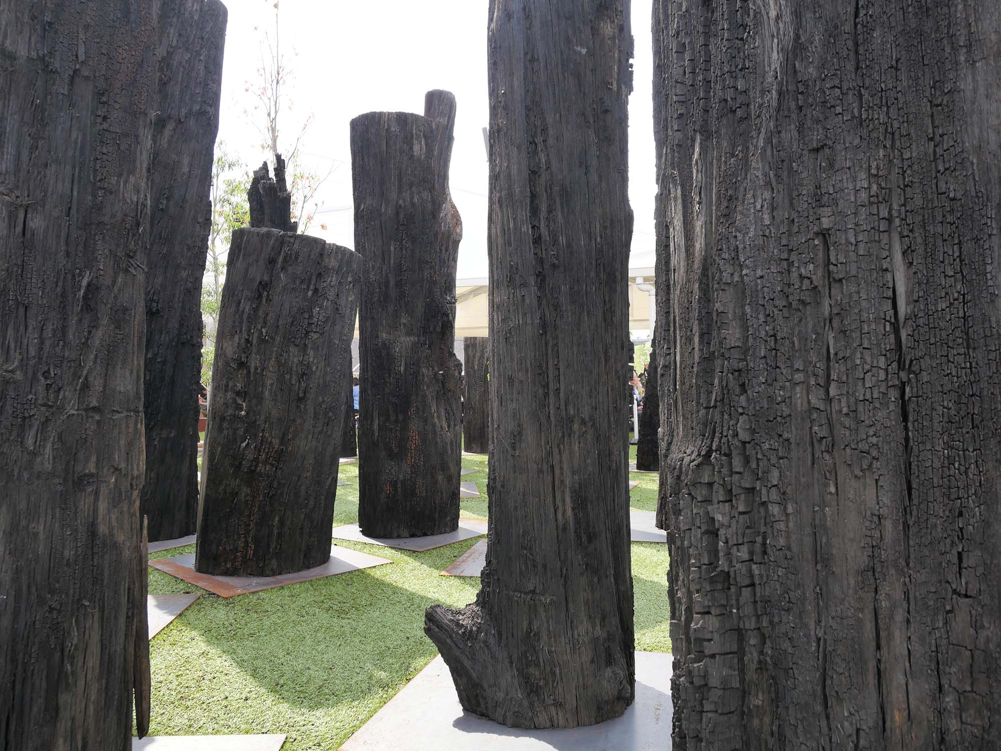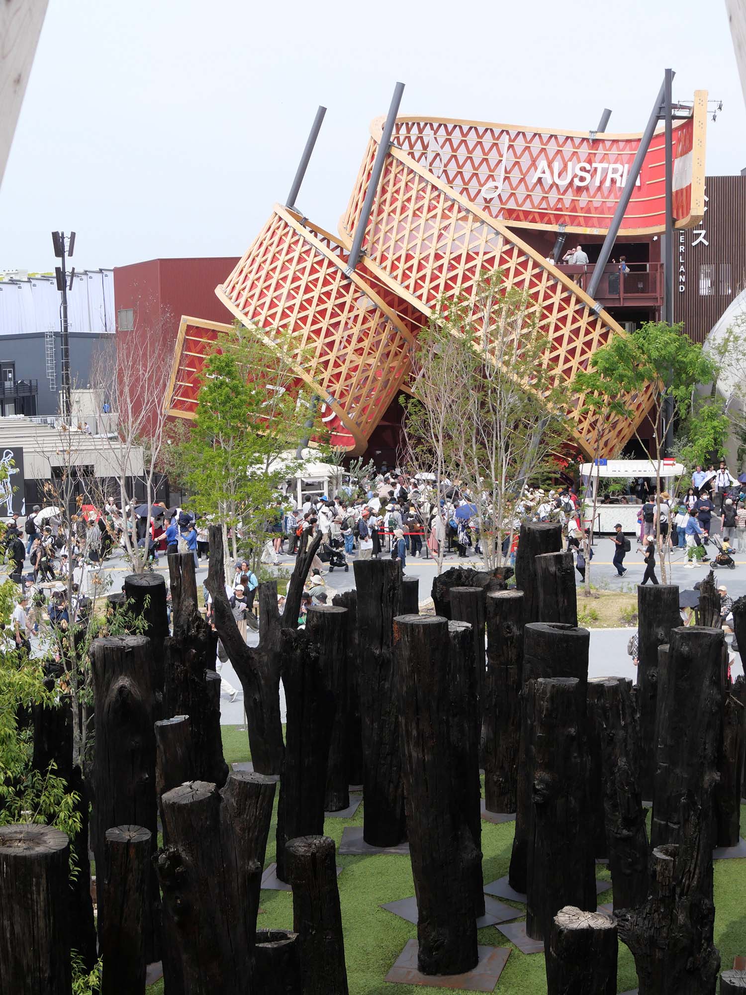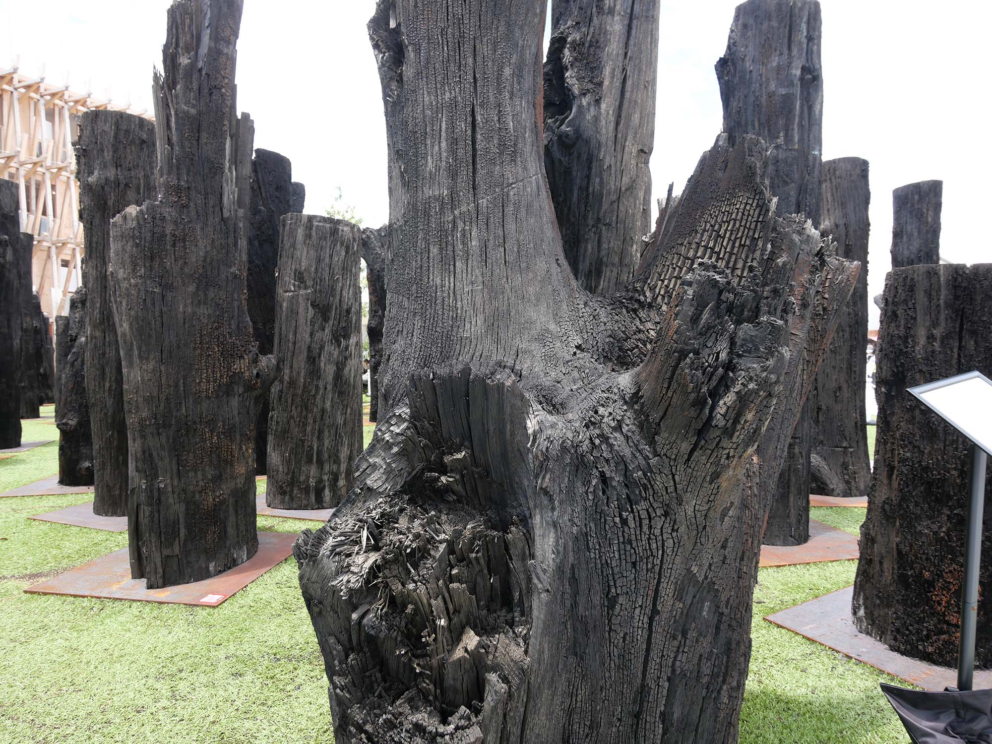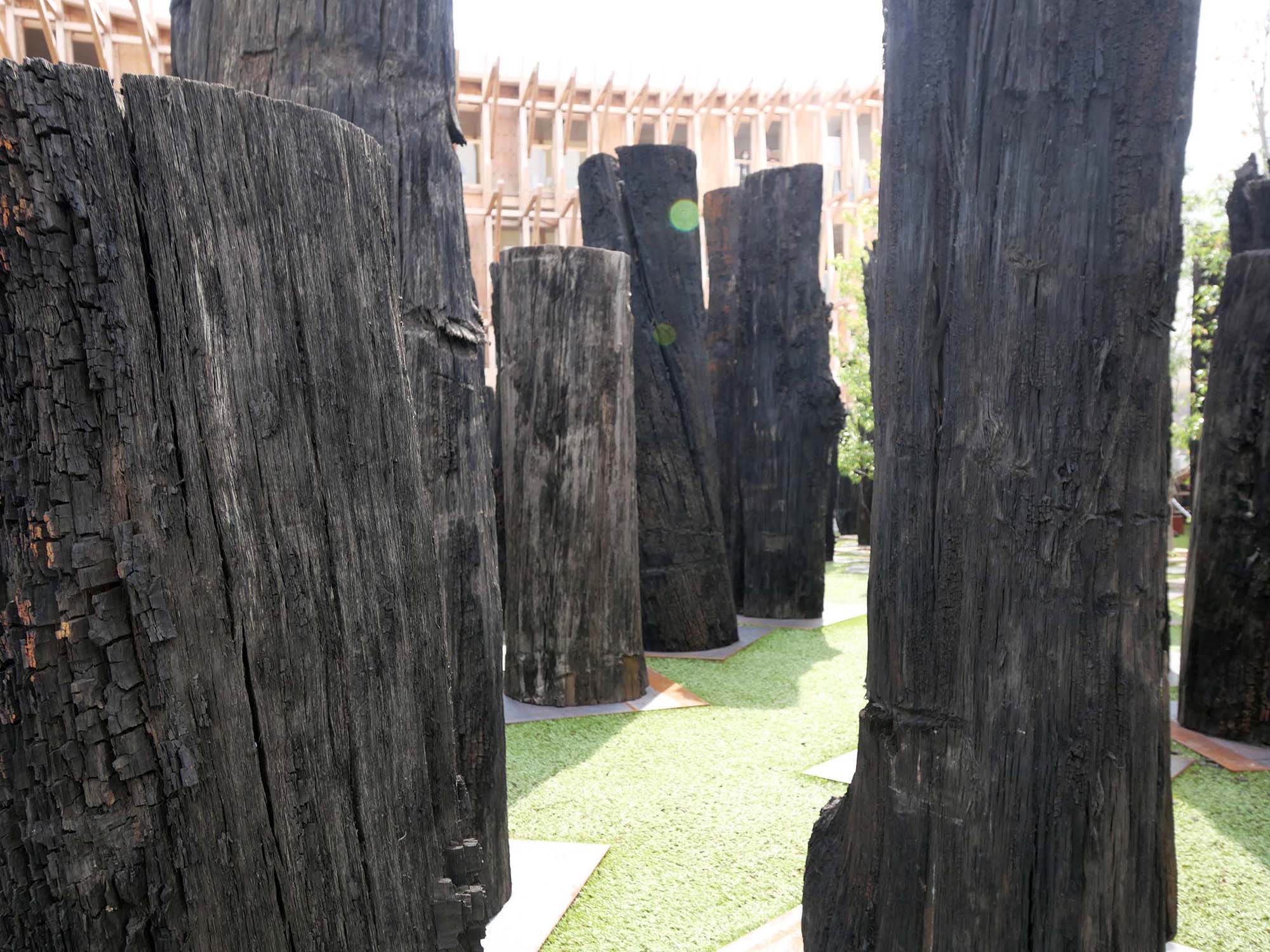 「文明の森(Forest of Civilizations)」は、チェコの企業 Subfossil Oak s.r.o. による展示です。約6500年前のオークの亜化石(ボグオーク)133本を使用し、1本ずつが2025年万博の参加国に捧げられています。