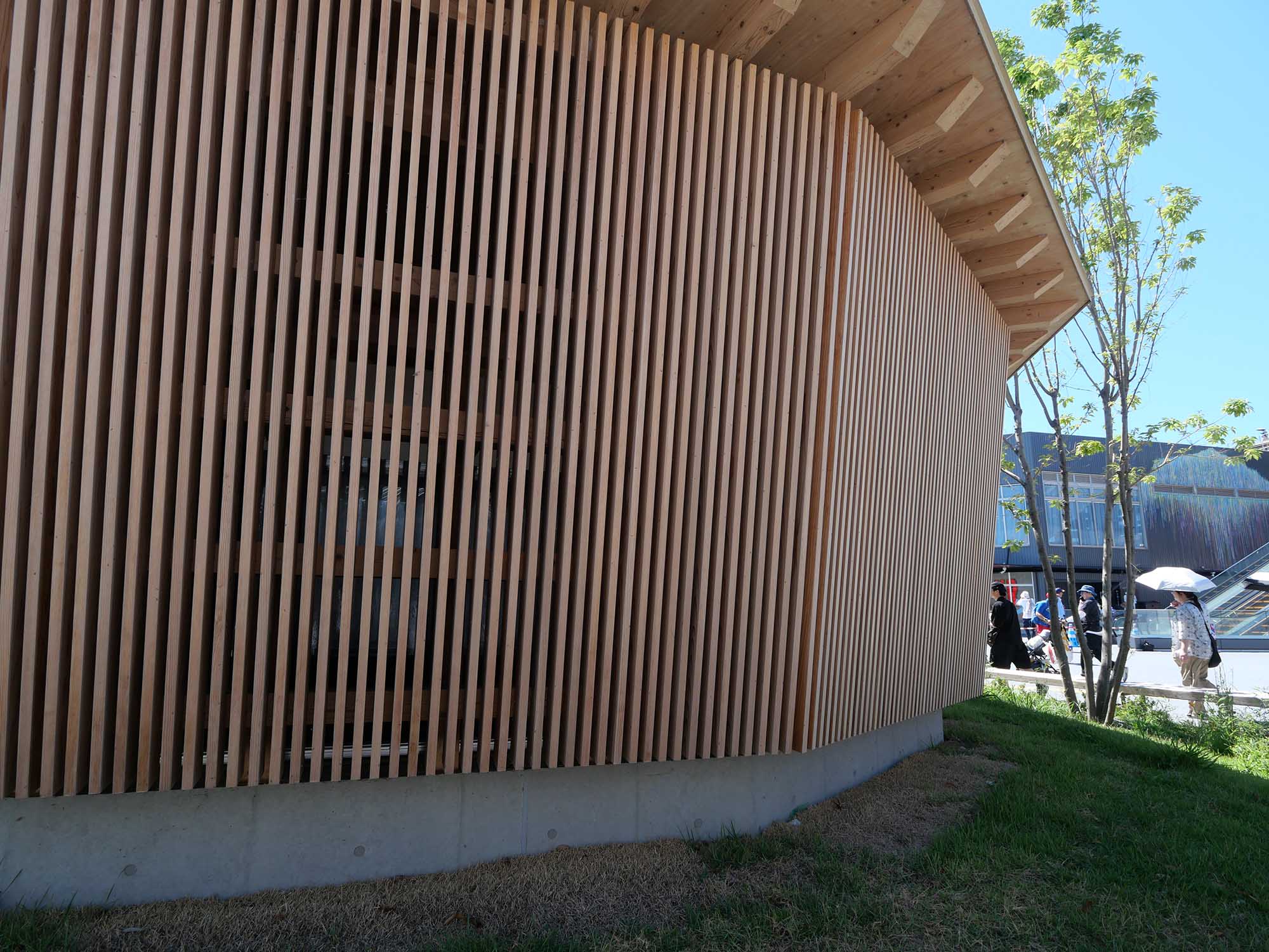 屋根には緑色の太陽光パネルを搭載し、周囲の植栽や大屋根リングの景観と調和するようデザインされています。夜には梁の上に仕込まれたオレンジ色の照明が柔らかに灯り、昼間とは違った雰囲気を楽しめます。