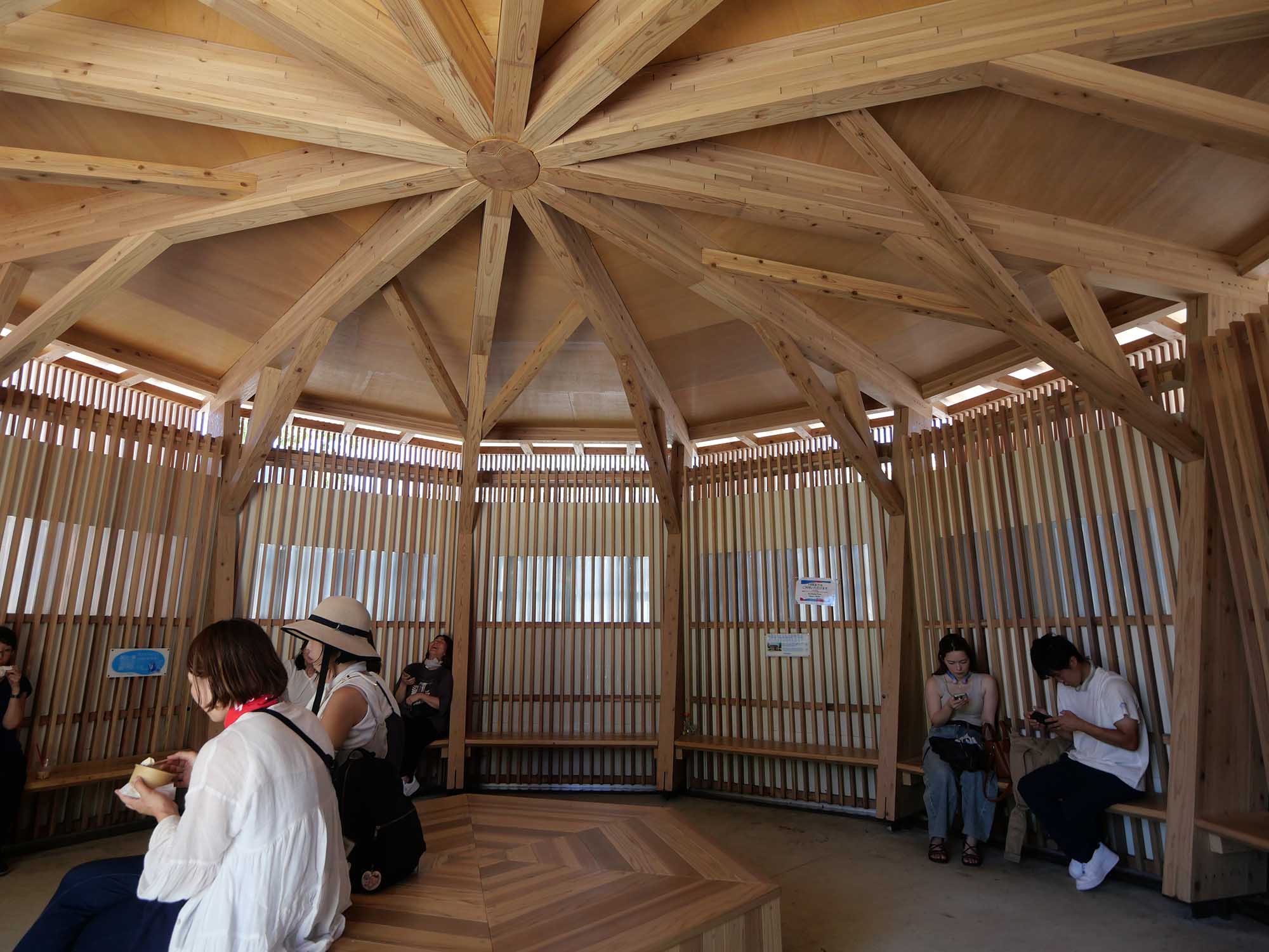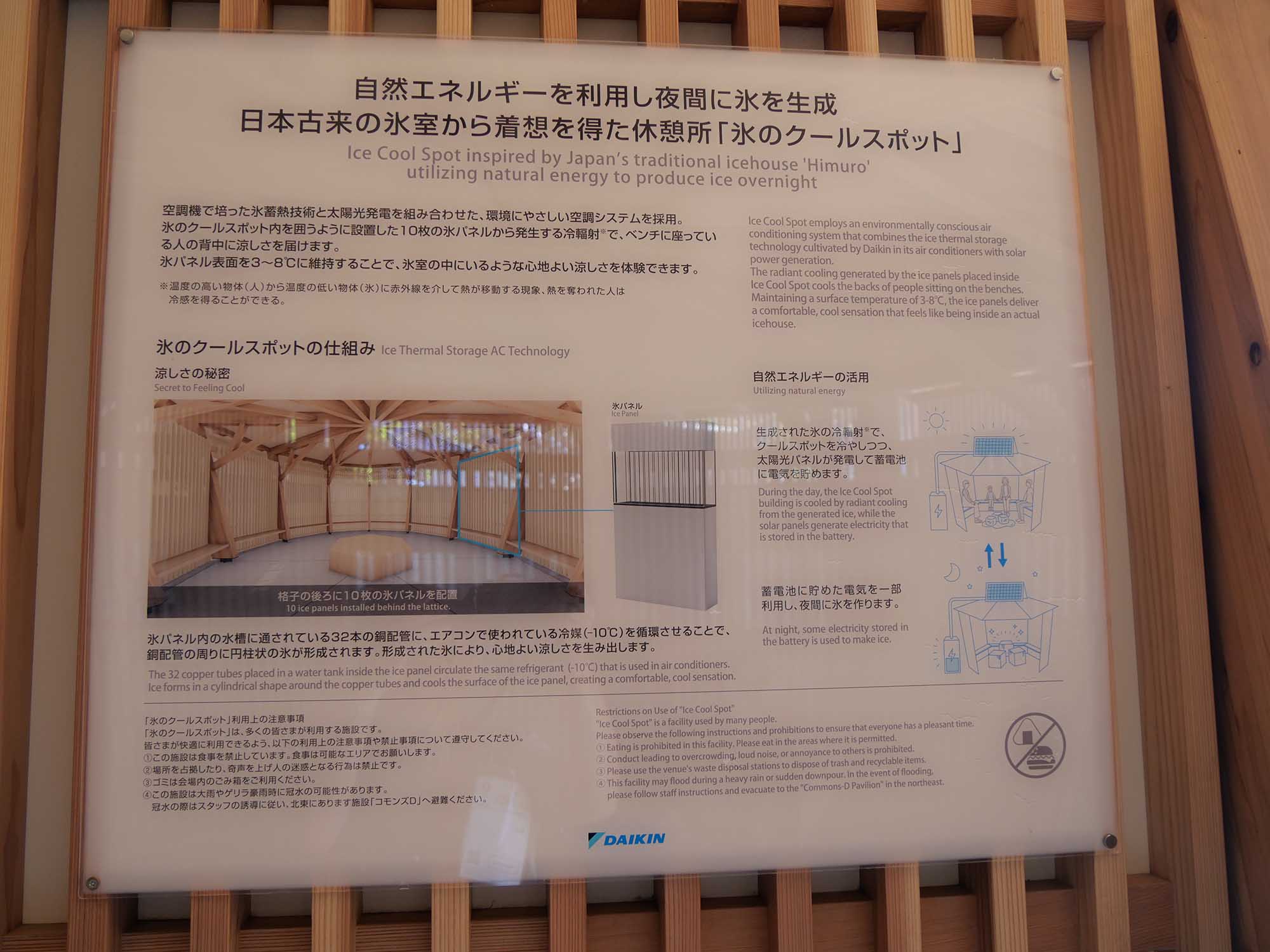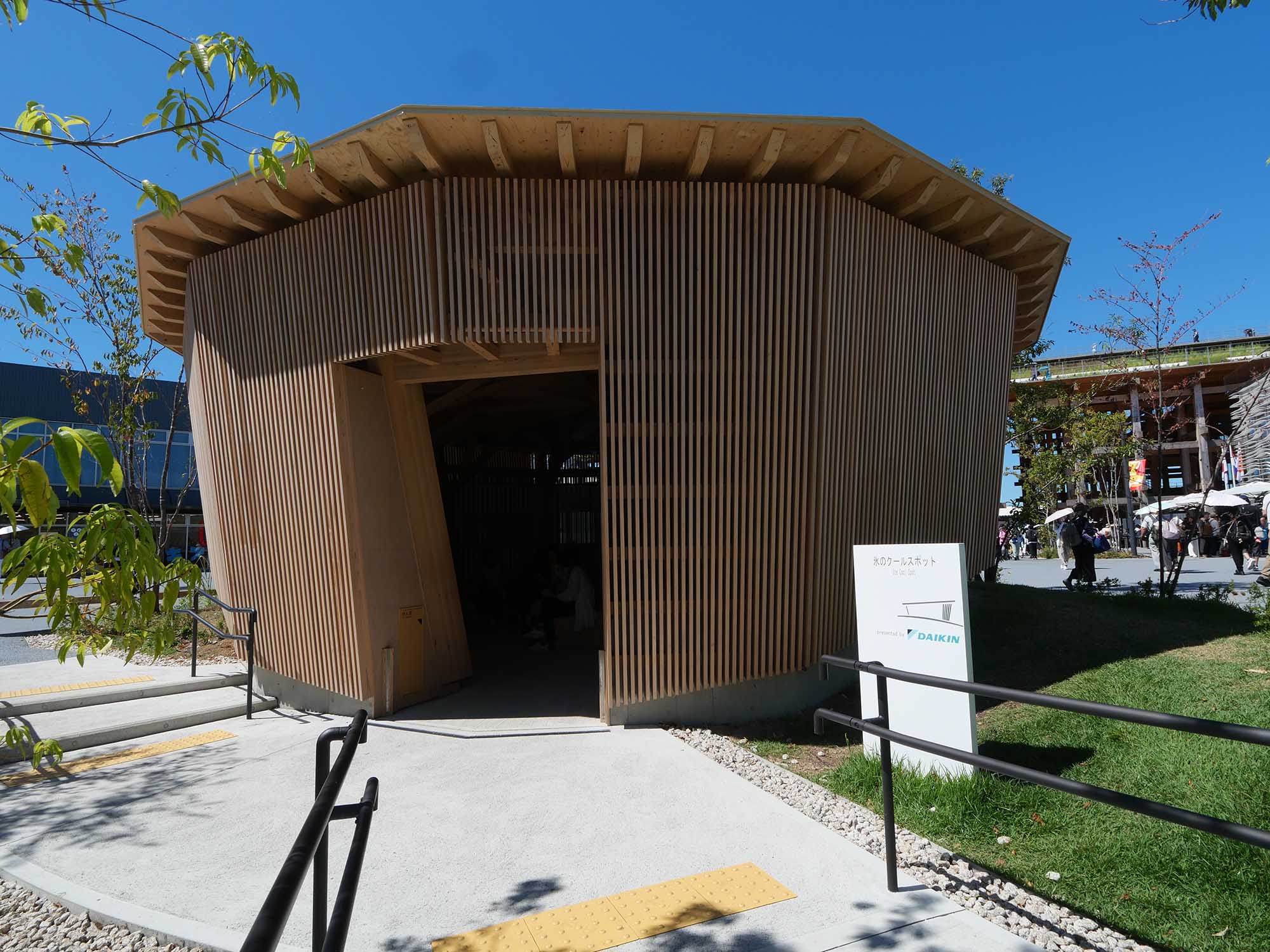 私の訪問10回目くらいのこと、8月の暑い日でした。オランダ館の近くを歩いていると、木材の縦格子が印象的な粋な建物が目に入りました。歩き疲れて足も痛く、座れる場所を探していましたが、どのベンチも満員です。せめて日陰に…と思い、その建物に入ってみました。入口をくぐった瞬間、まるで氷室に足を踏み入れたかのような涼しさ! 驚いて見れば、ダイキン工業が提供する休憩所「氷のクールスポット」でした。本当にありがたく、忘れられない体験となりました。以下、資料をもとに概要をまとめます。