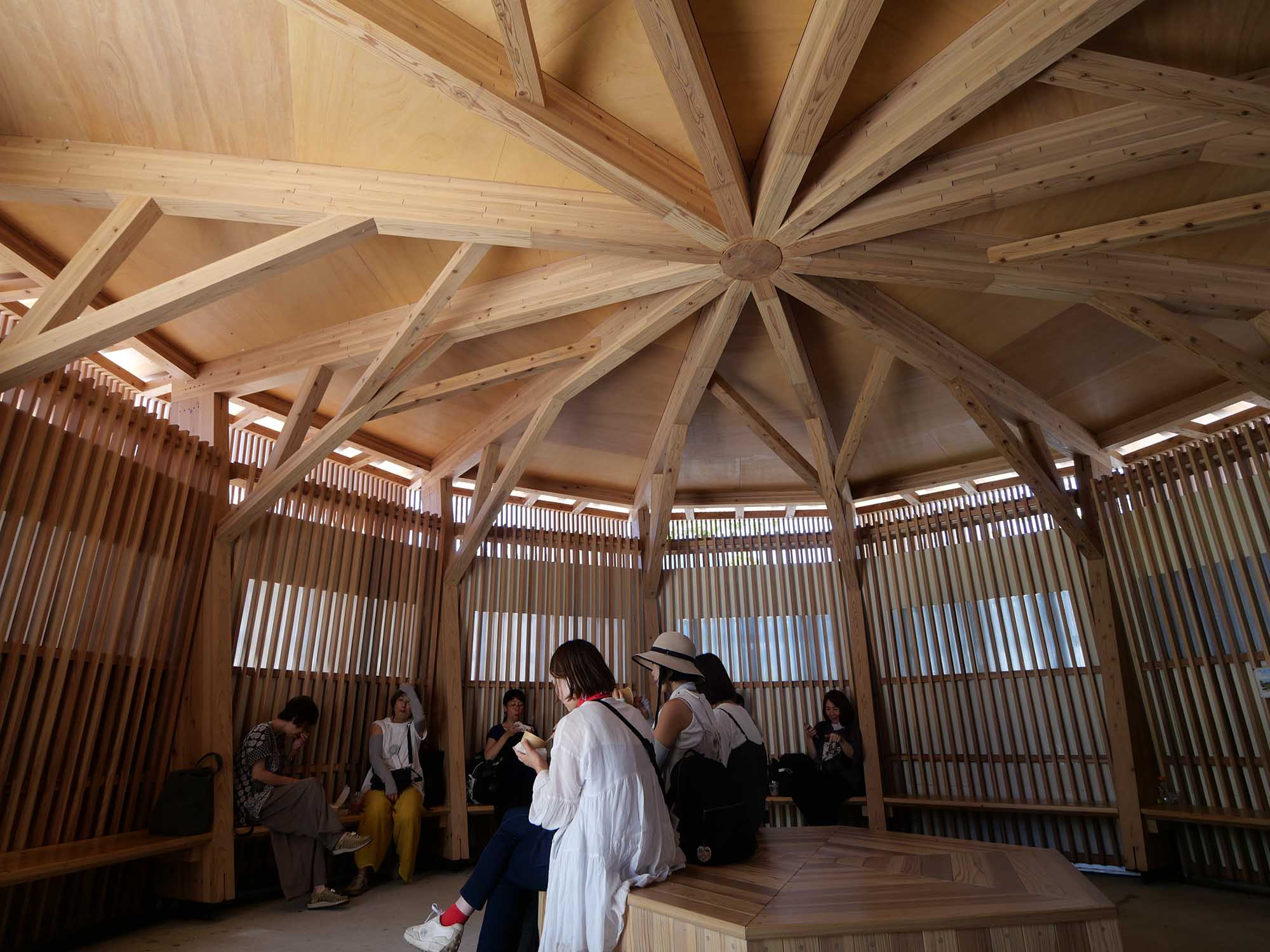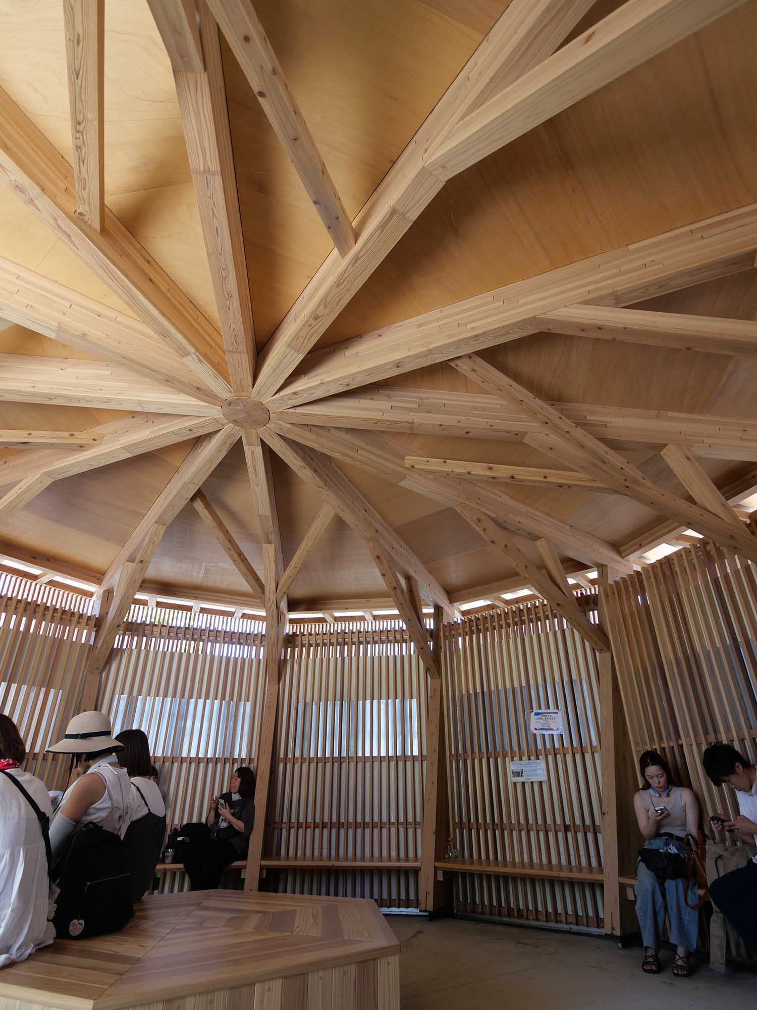「氷のクールスポット」は、オランダ館前の「進歩の広場」に設けられた木組み格子の休憩所です。木陰に入ったような心地よさを生む秘密は、建物の壁に組み込まれた「氷のパネル」。このパネルは表面温度を3~8℃に維持し、まるで氷室の中にいるかのような涼しさを実現しています。壁側のベンチに座ると、背中にほんのりと冷気が伝わってくる仕組みです。