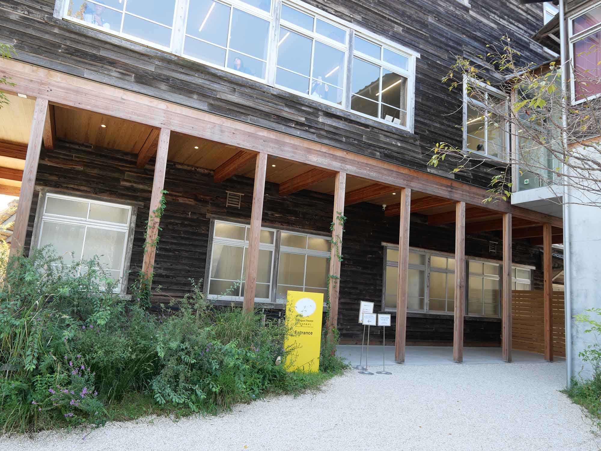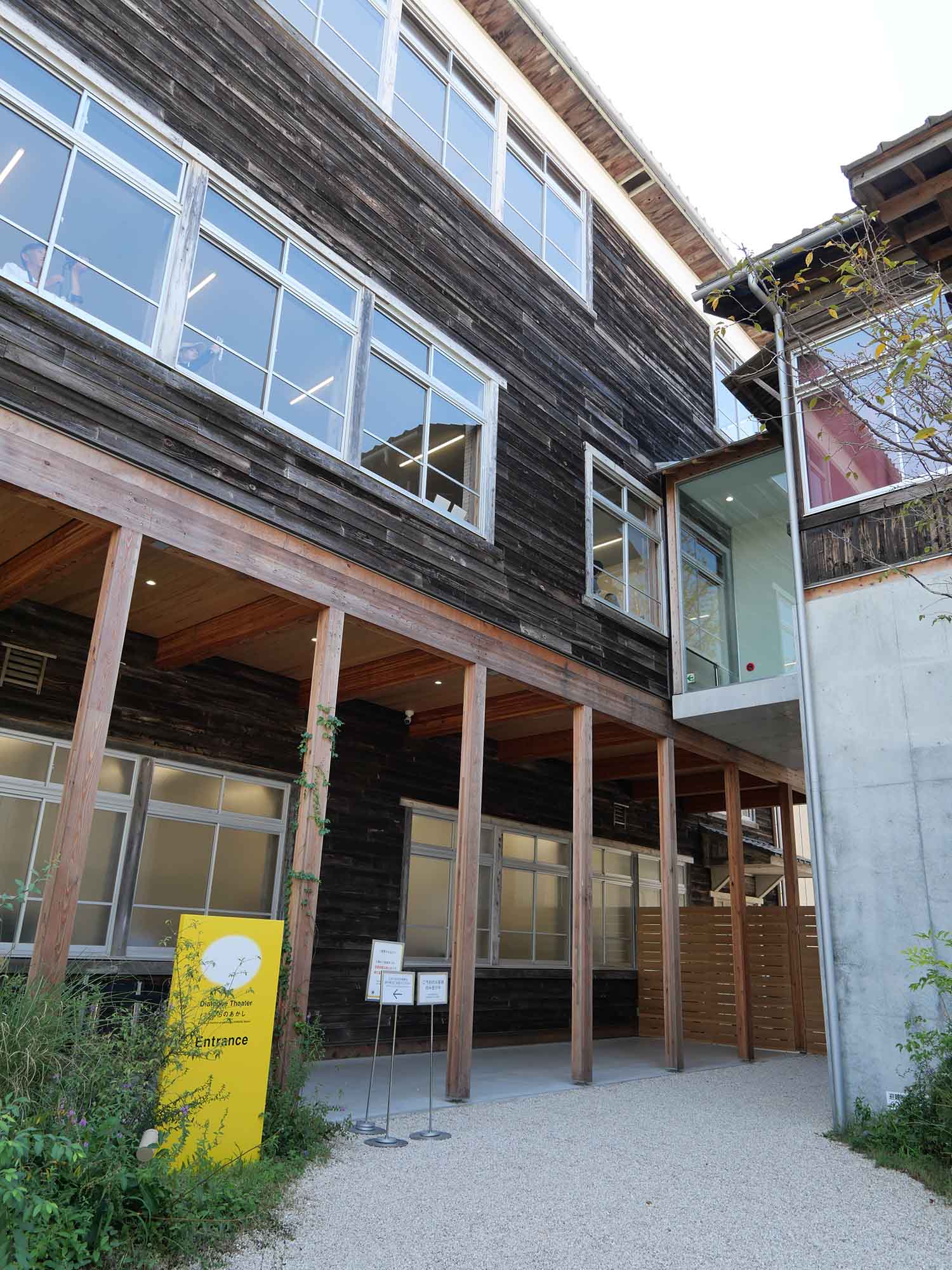 対話シアター棟はRC造の土台(高さ約4m)の上に木校舎を載せ、天井高約7mの遮音シアターを実現。屋根には苔むした既存瓦を再利用し、