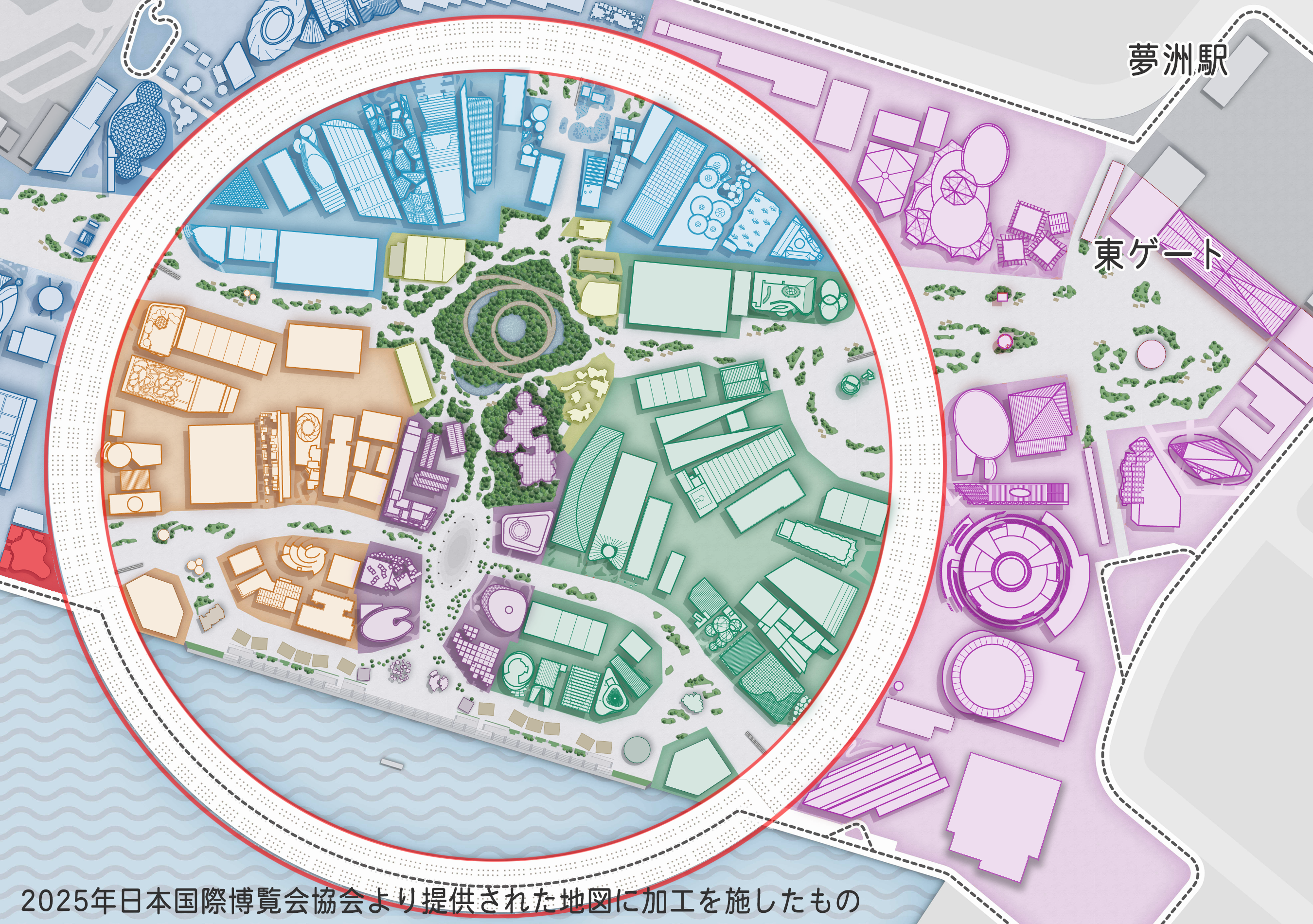 トイレや授乳室、カームダウンルームなど多様な利用者に配慮したインクルーシブな構成で、色分けや配置によって直感的に利用しやすい設計としています。手作業によるテキスタイルや木の内装など、人の温もりを感じる素材を組み合わせることで、万博の体験の合間に光や風、素材の感触を楽しみながら休める場となることが目指されています。