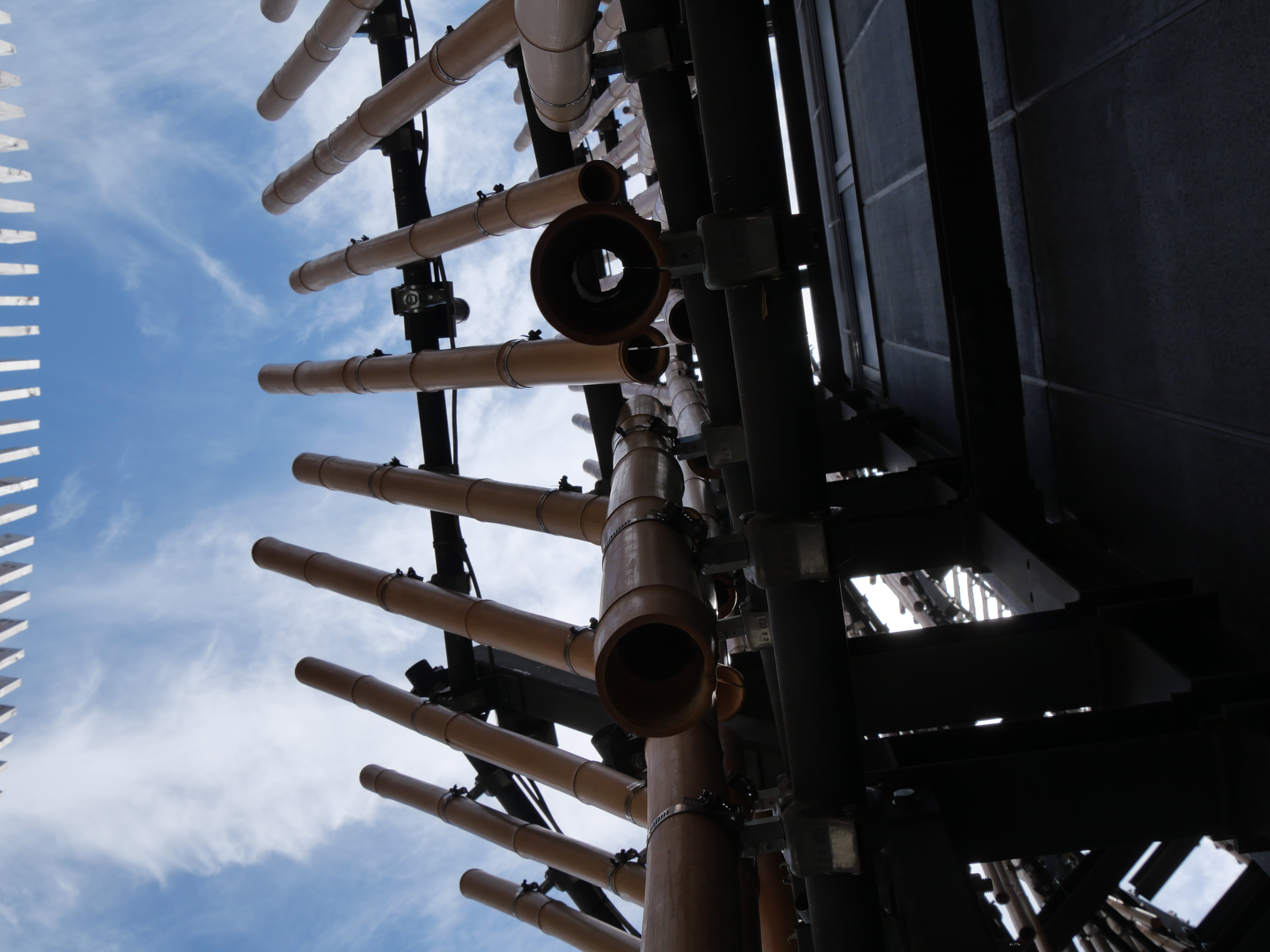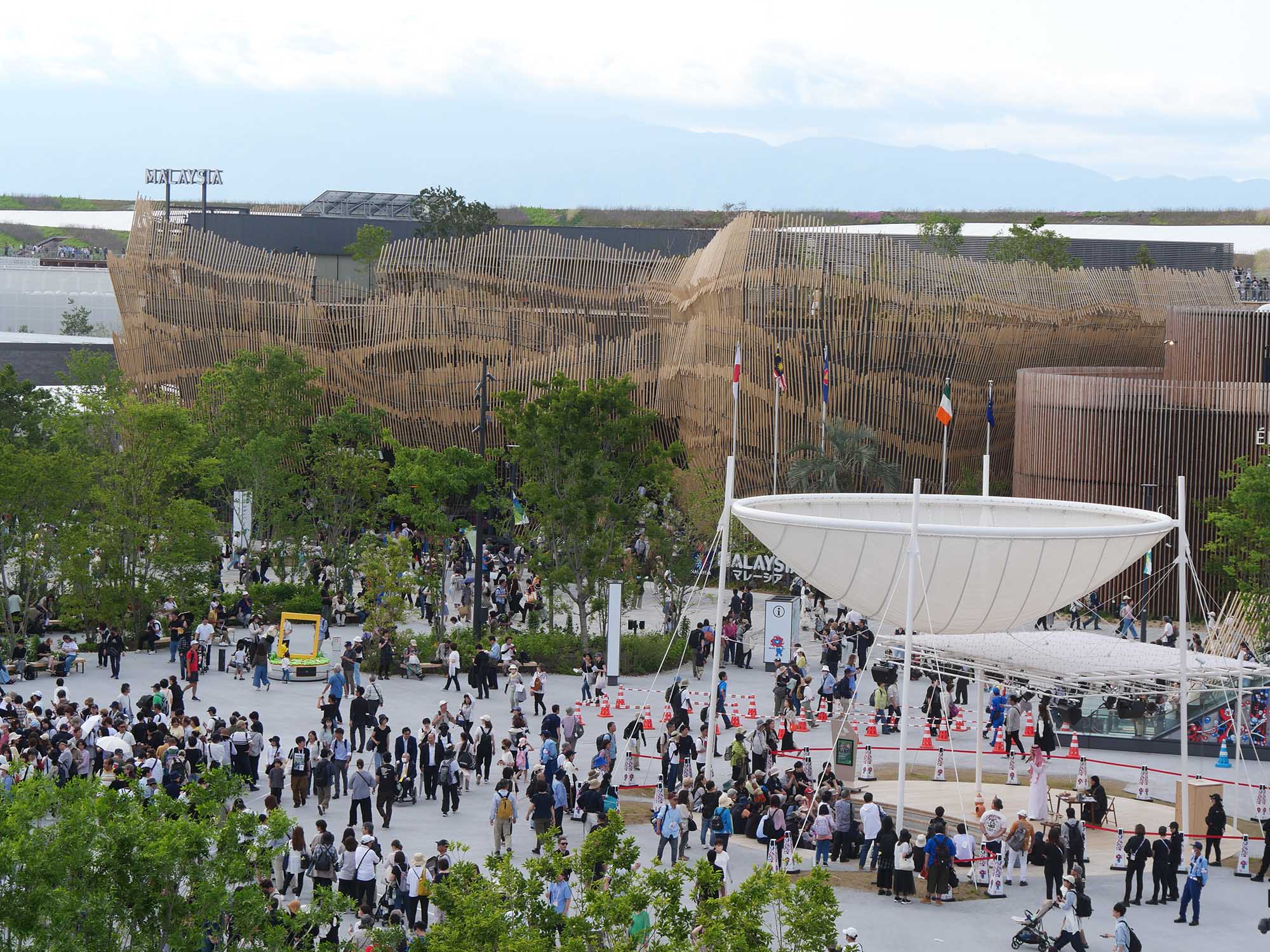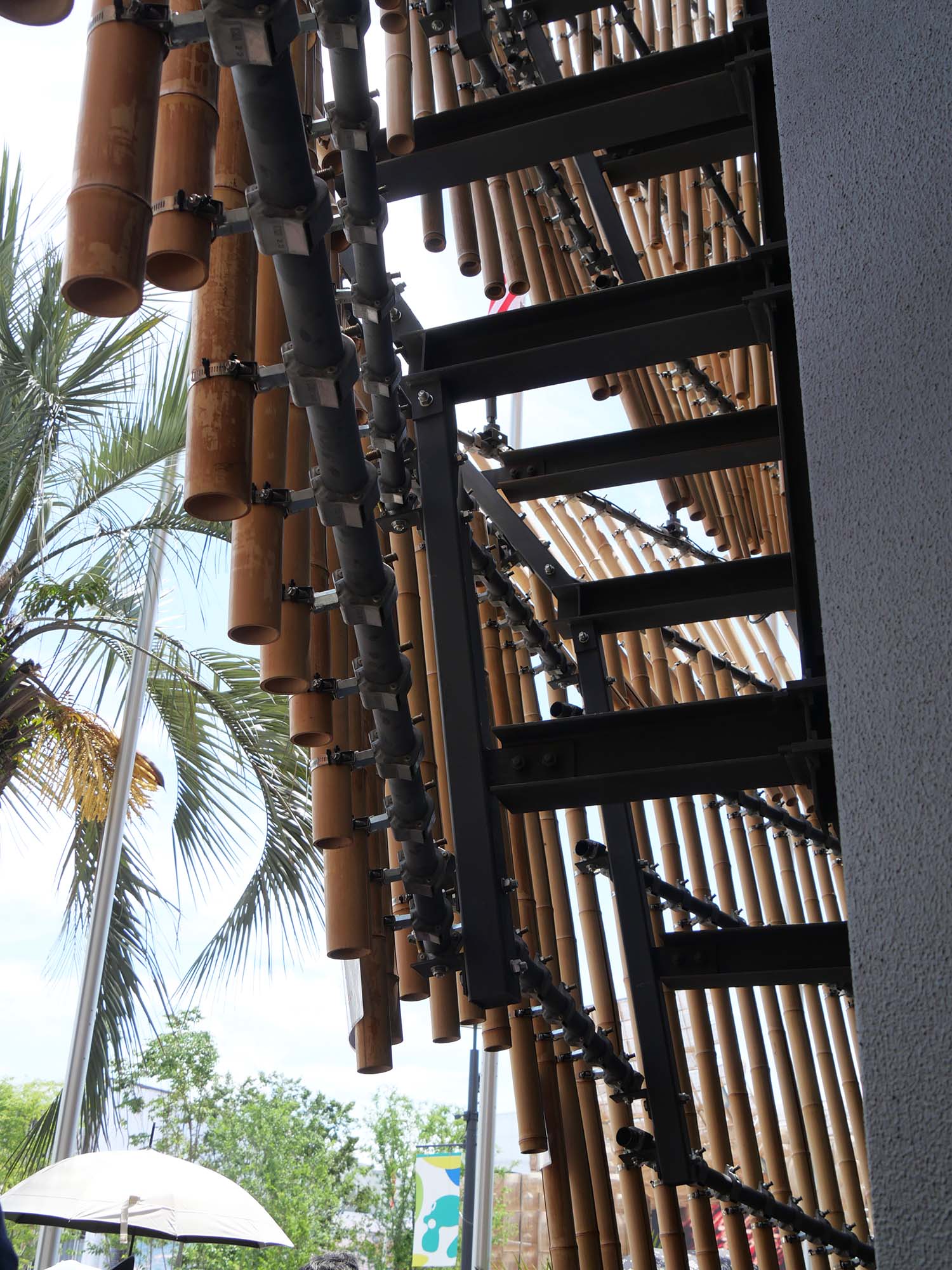 テーマは「Interwoven/編み込む」。民族・宗教・文化の多様性が交差するマレーシアの姿を、自然素材である竹を用いて表現しています。最大の特徴は、約5,000本の竹を立体的に編み込んだ、伝統織物「ソンケット」をモチーフにしたファサードです。竹の外装は、まるで柔らかな布のように風と光を受け止め、マレーシアの自然と文化の融合を象徴しています。