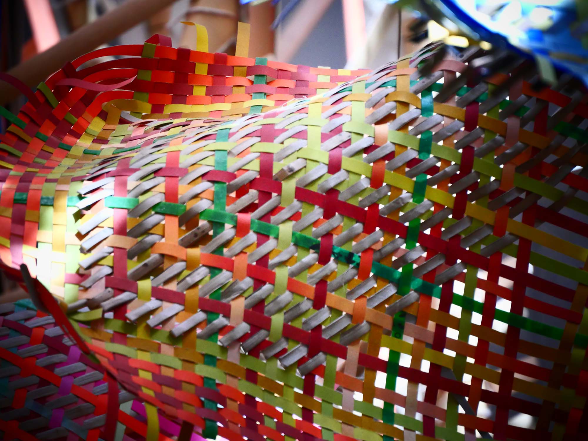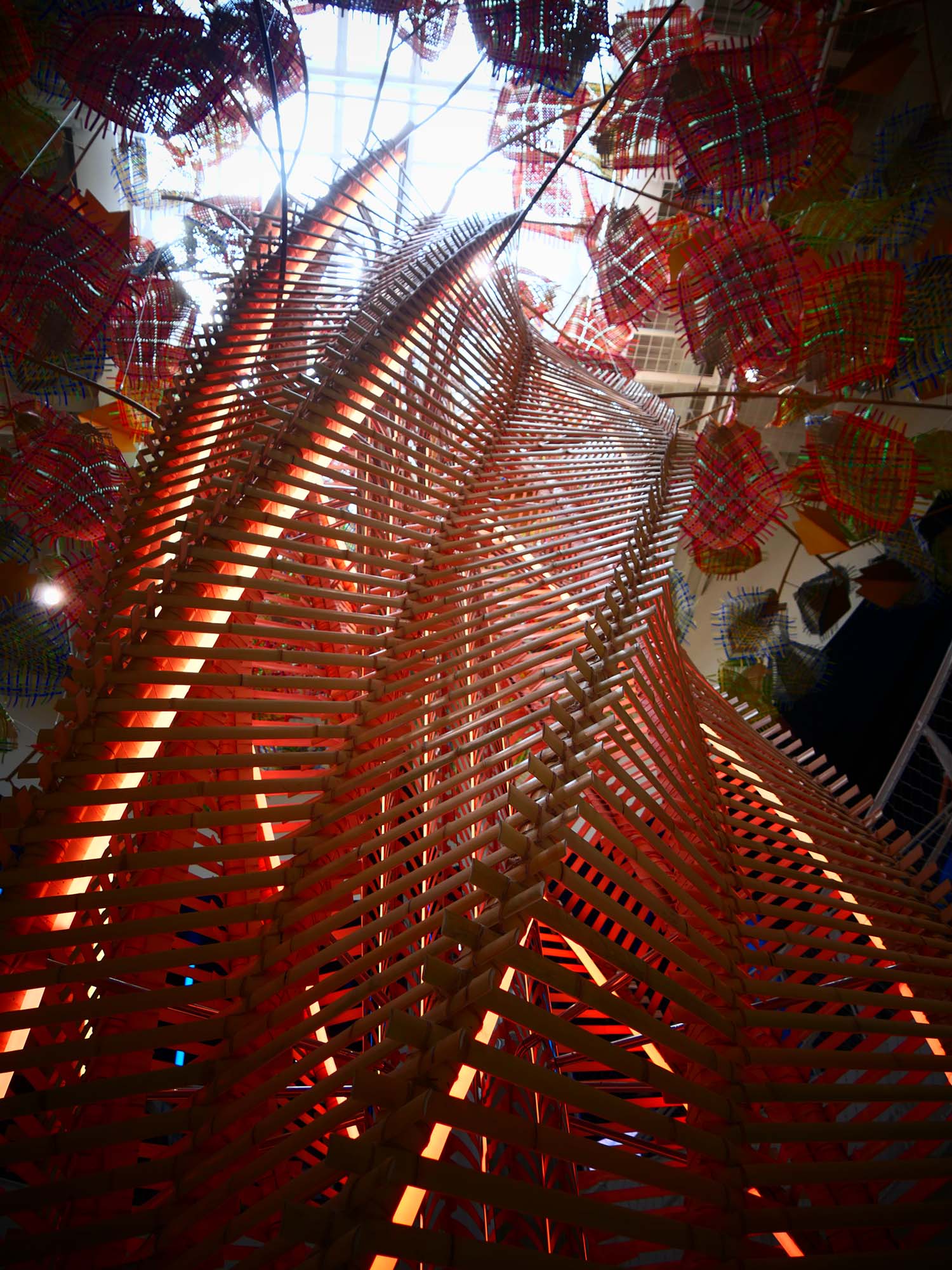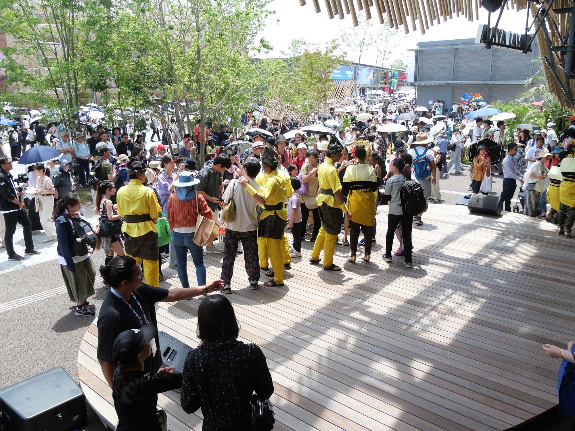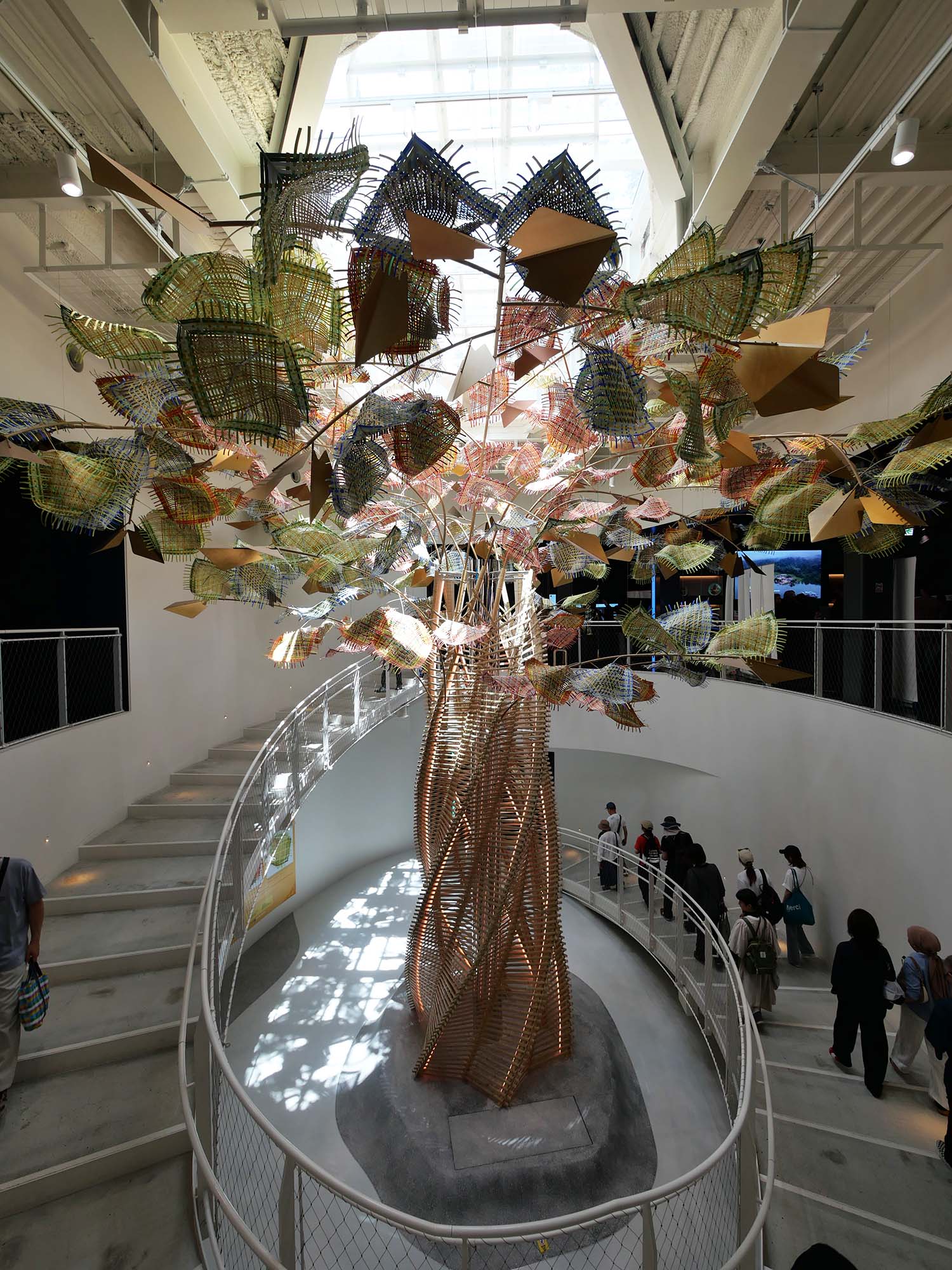パビリオンの中央には、竹と籐で構成された彫刻作品「ハーモニーの木」が設置されています。一枚一枚の葉は、地元の職人による手編みで制作されており、持続可能な天然素材と手仕事の融合、そしてマレーシアの調和の精神が体現されています。
