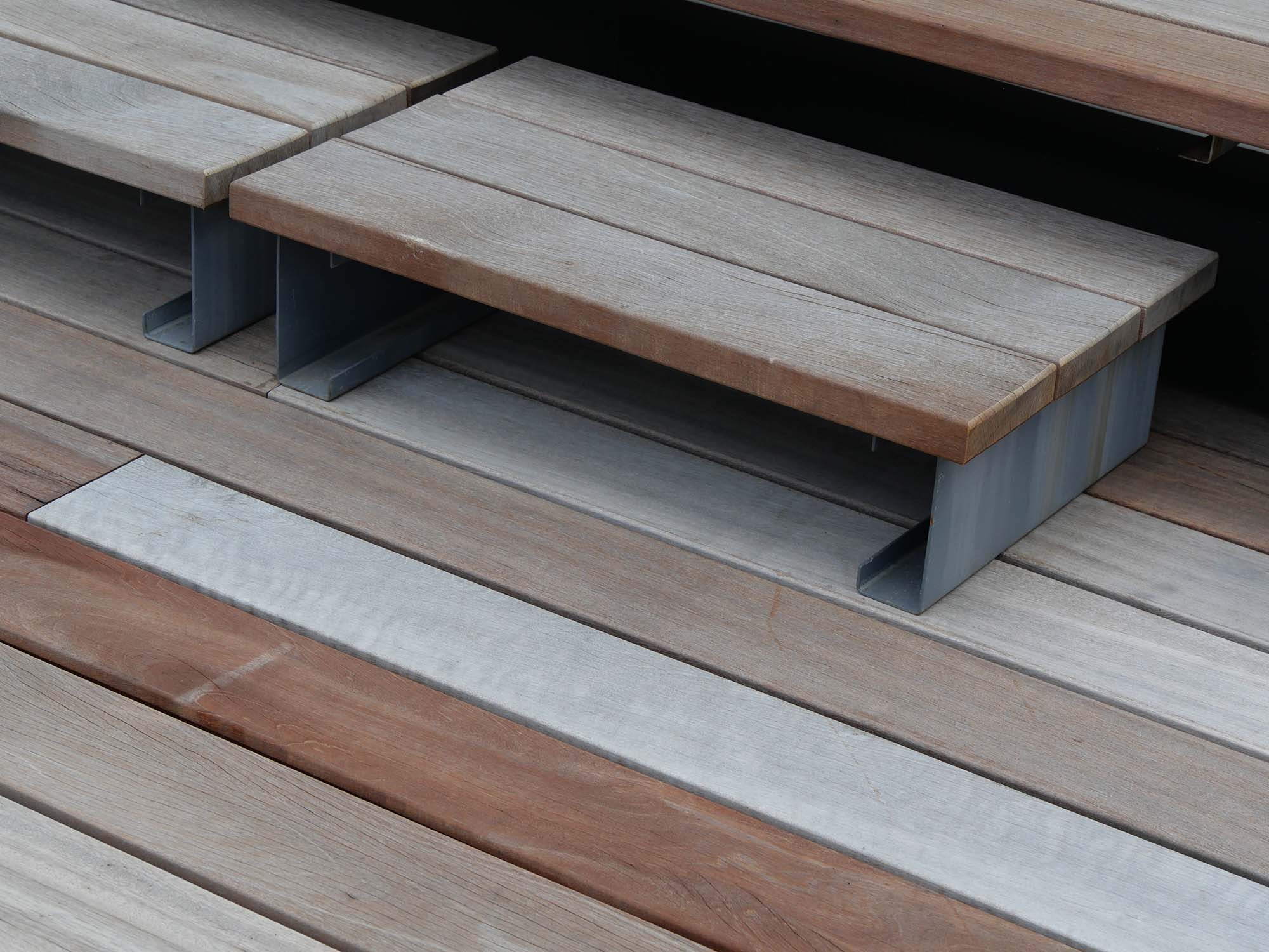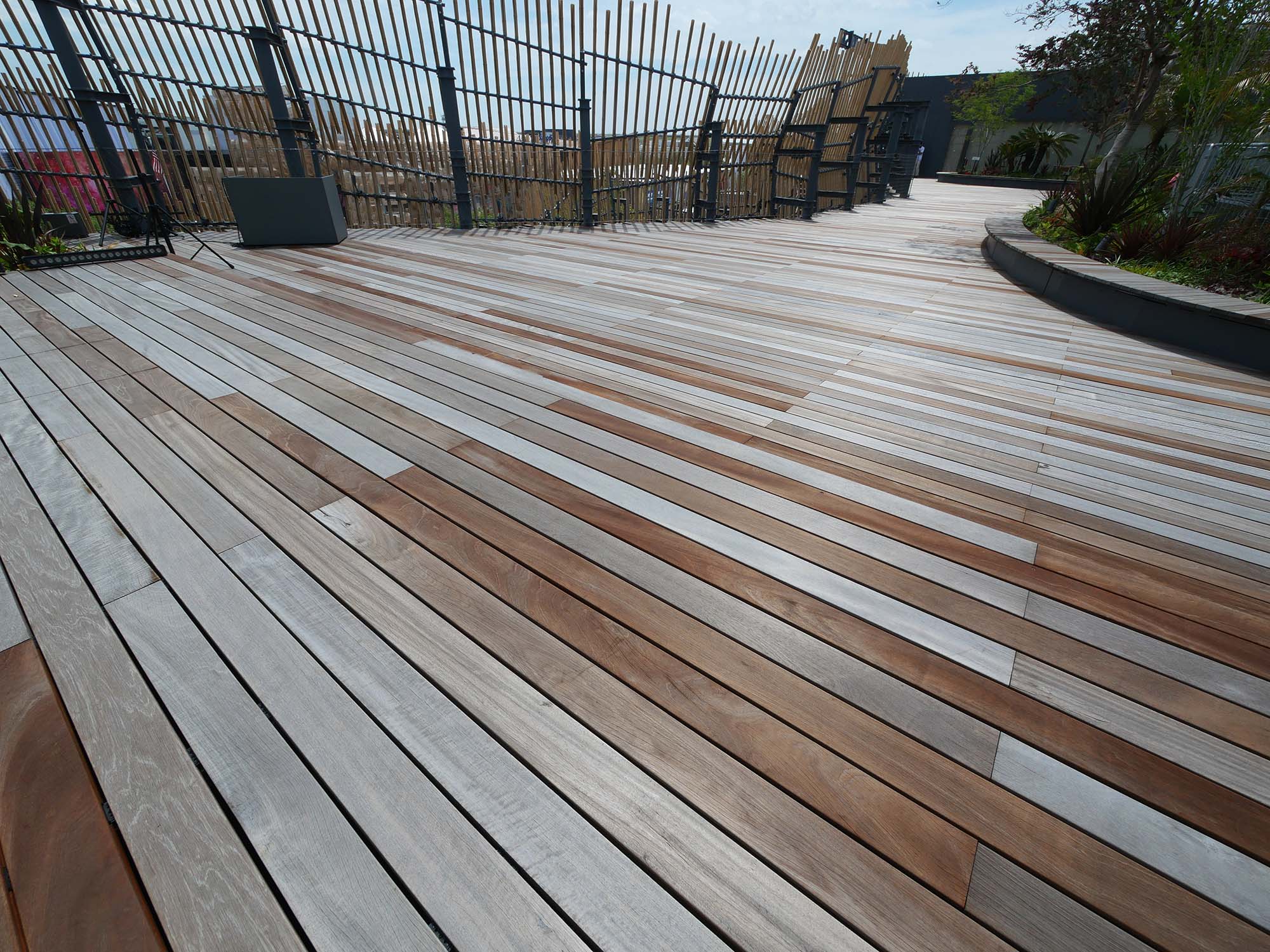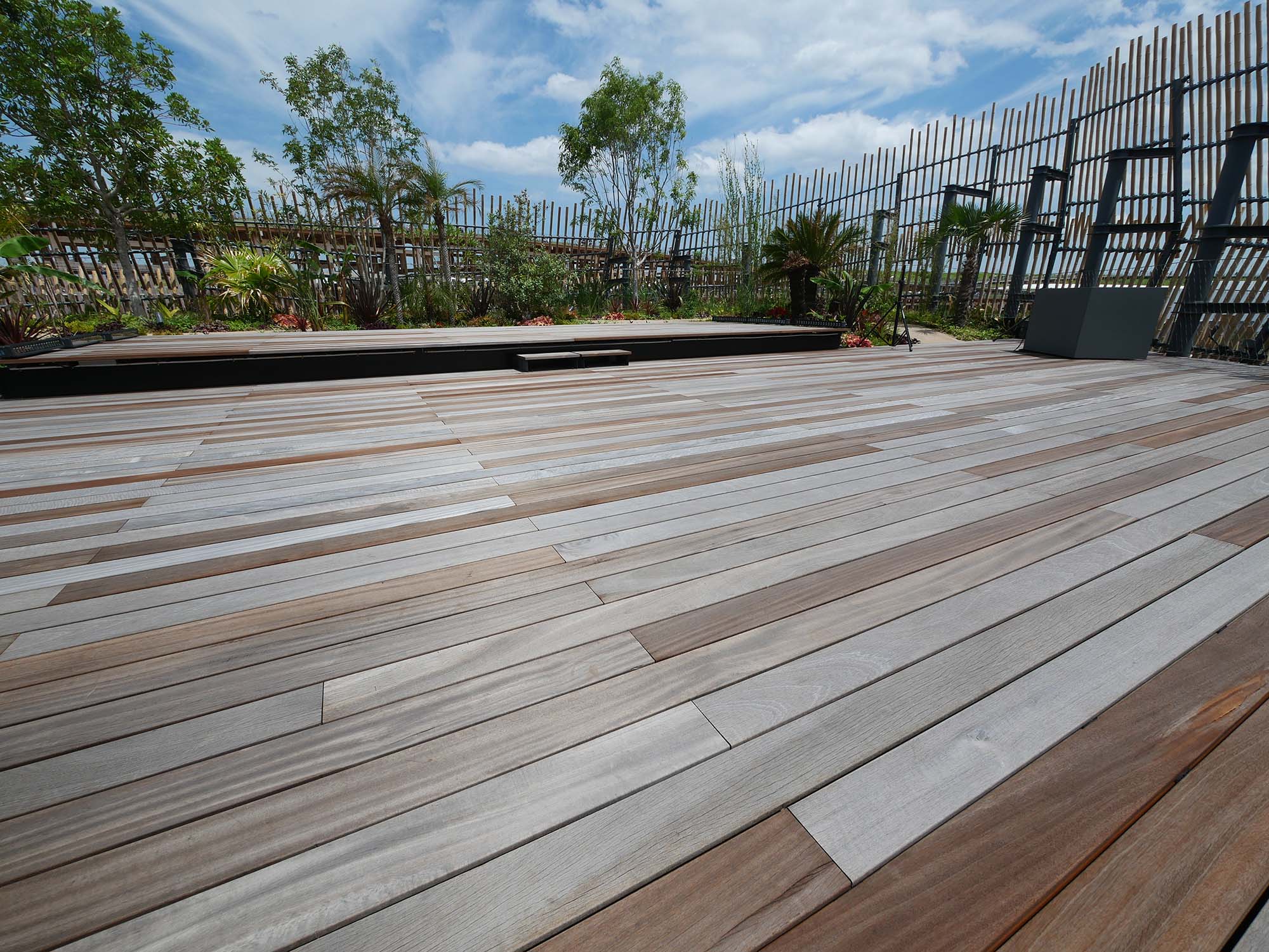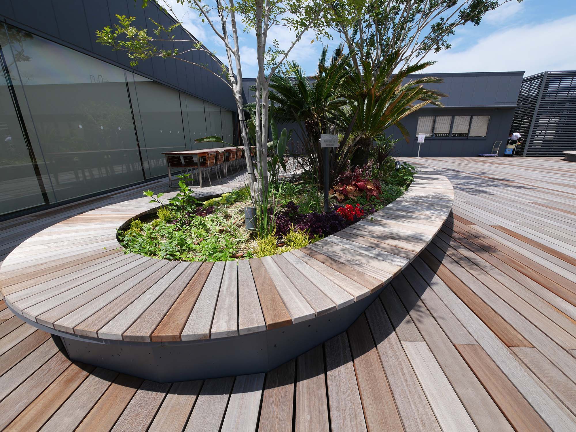 建物は鉄骨造・地上3階建てで、屋上には緑豊かなガーデンテラスがあり、床材にはマレーシア産のセランガンバツ材が使用されています。訪問者が自然の中でひと休みできる癒しの空間となっています。