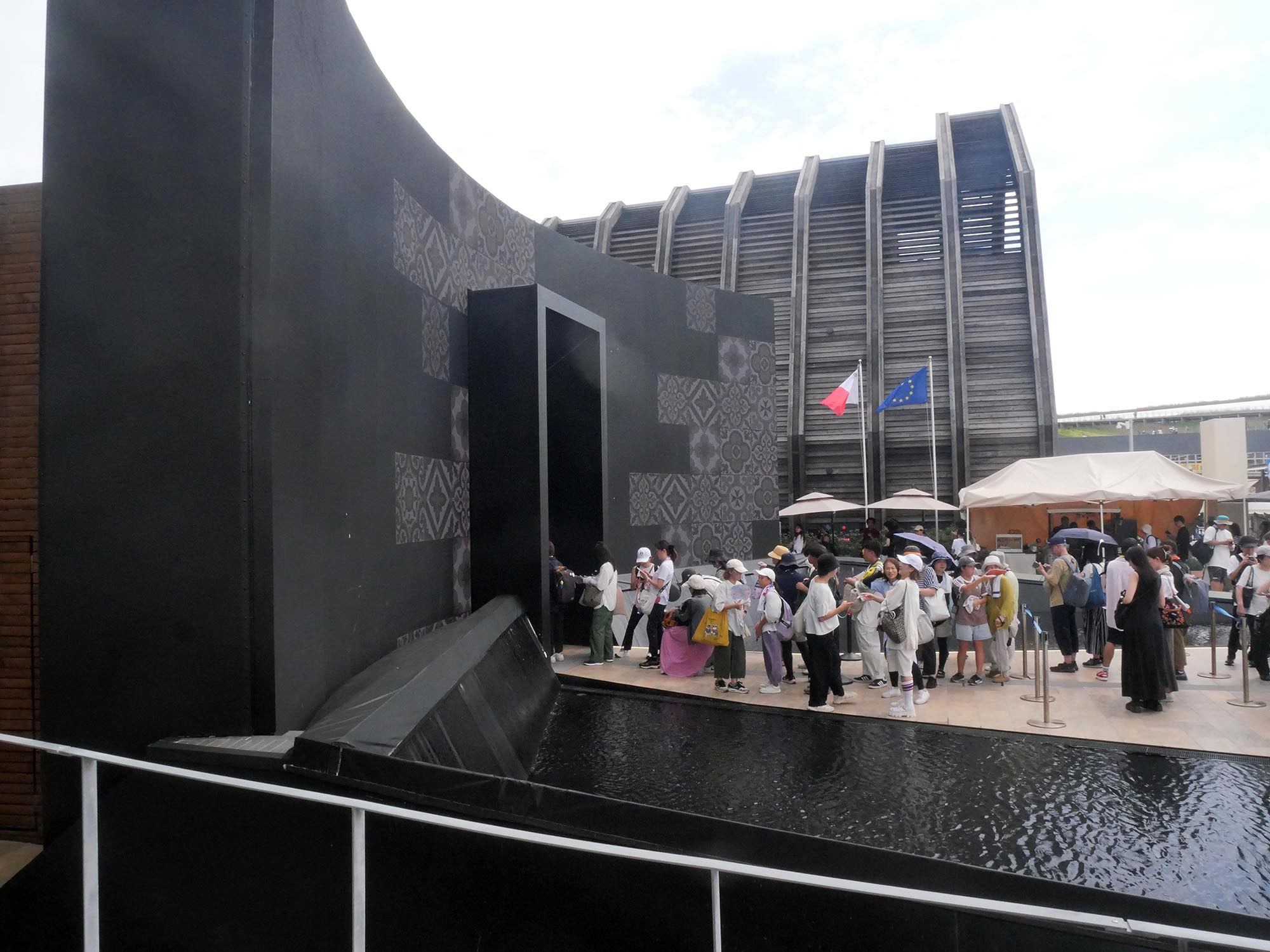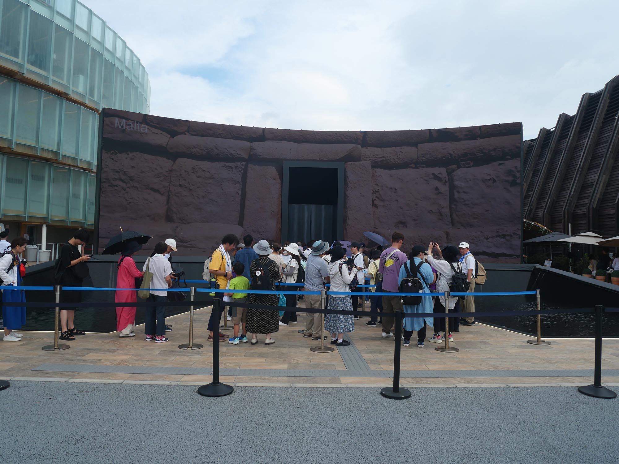 マルタ館は、地中海の島国・マルタの豊かな歴史と文化、そして未来への創造力を伝えるパビリオンです。外観は「時のゲートウェイ」と呼ばれる大型ディスプレイが印象的で、遺跡や海、街並みなどマルタを象徴する風景がダイナミックに映し出されます。水に囲まれた細い入口は、来館者を海の洞窟へ導くような雰囲気を演出しています。