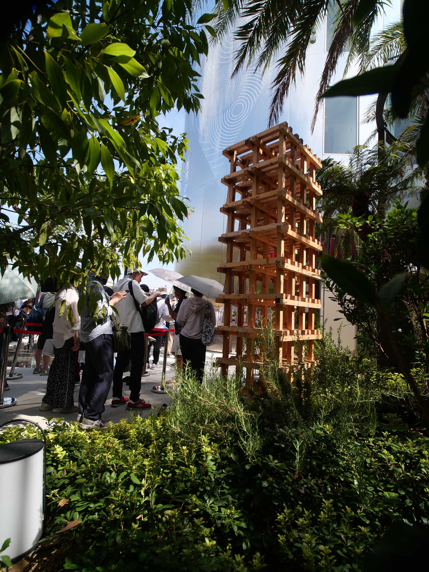 また、入口近くに設置された木製の井桁組みのモニュメントは、重厚で存在感があり、自然素材の力強さを感じさせます。
