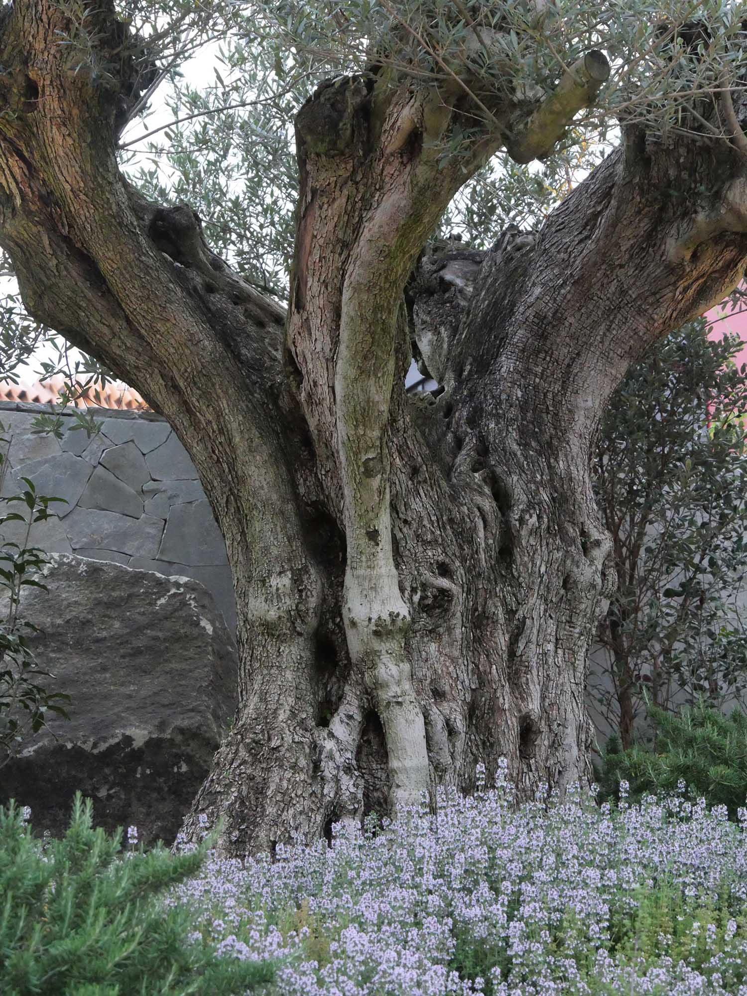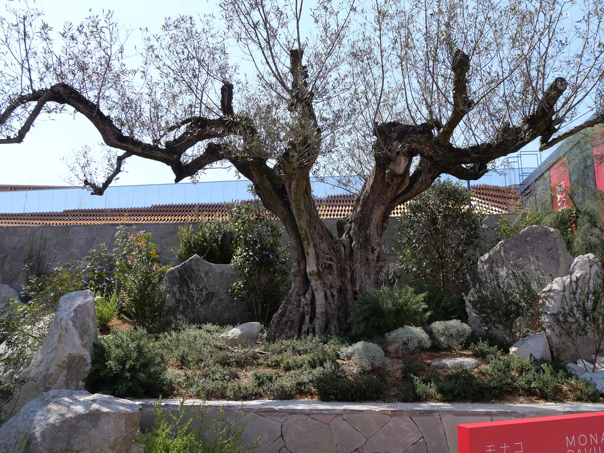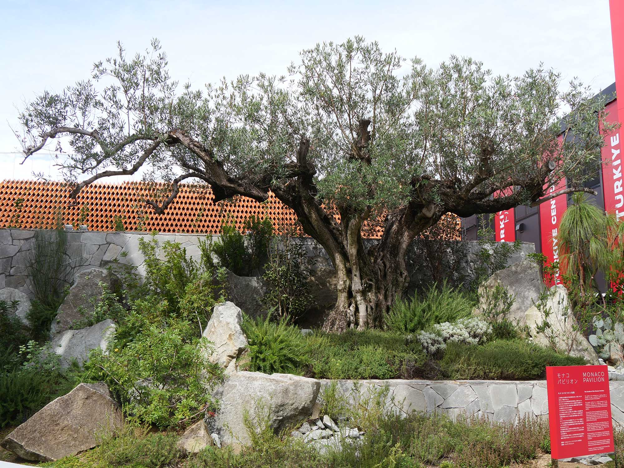 庭園の中心には、モナコから特別に運ばれてきた樹齢500年のオリーブの古木があります。フランス館の樹齢1300年のオリーブには及びませんが、枝ぶりは見事で、まるでモナコの歴史と誇りを象徴するようです。