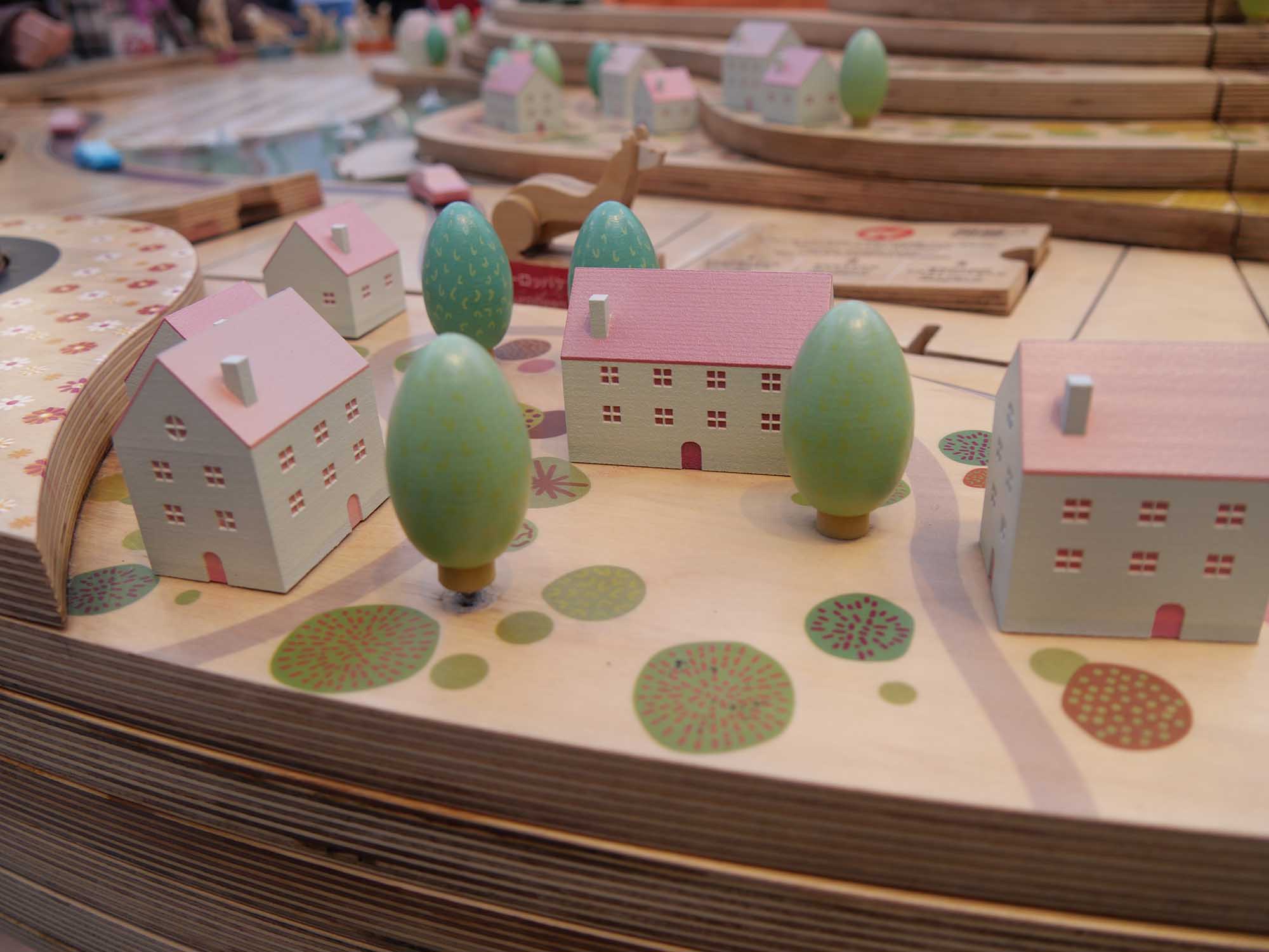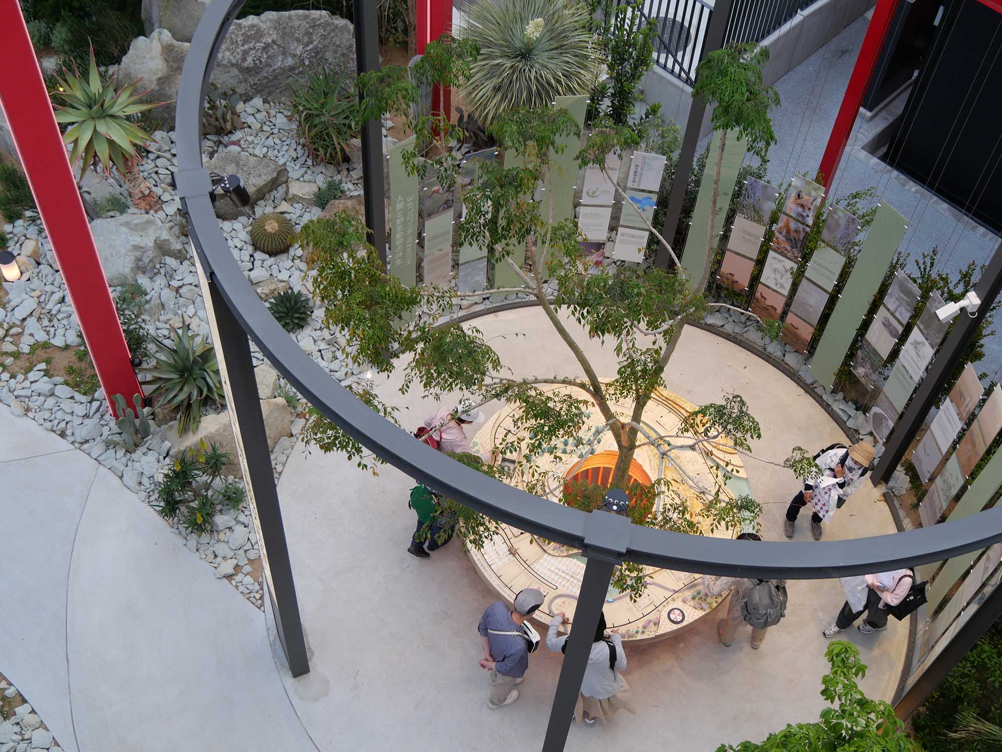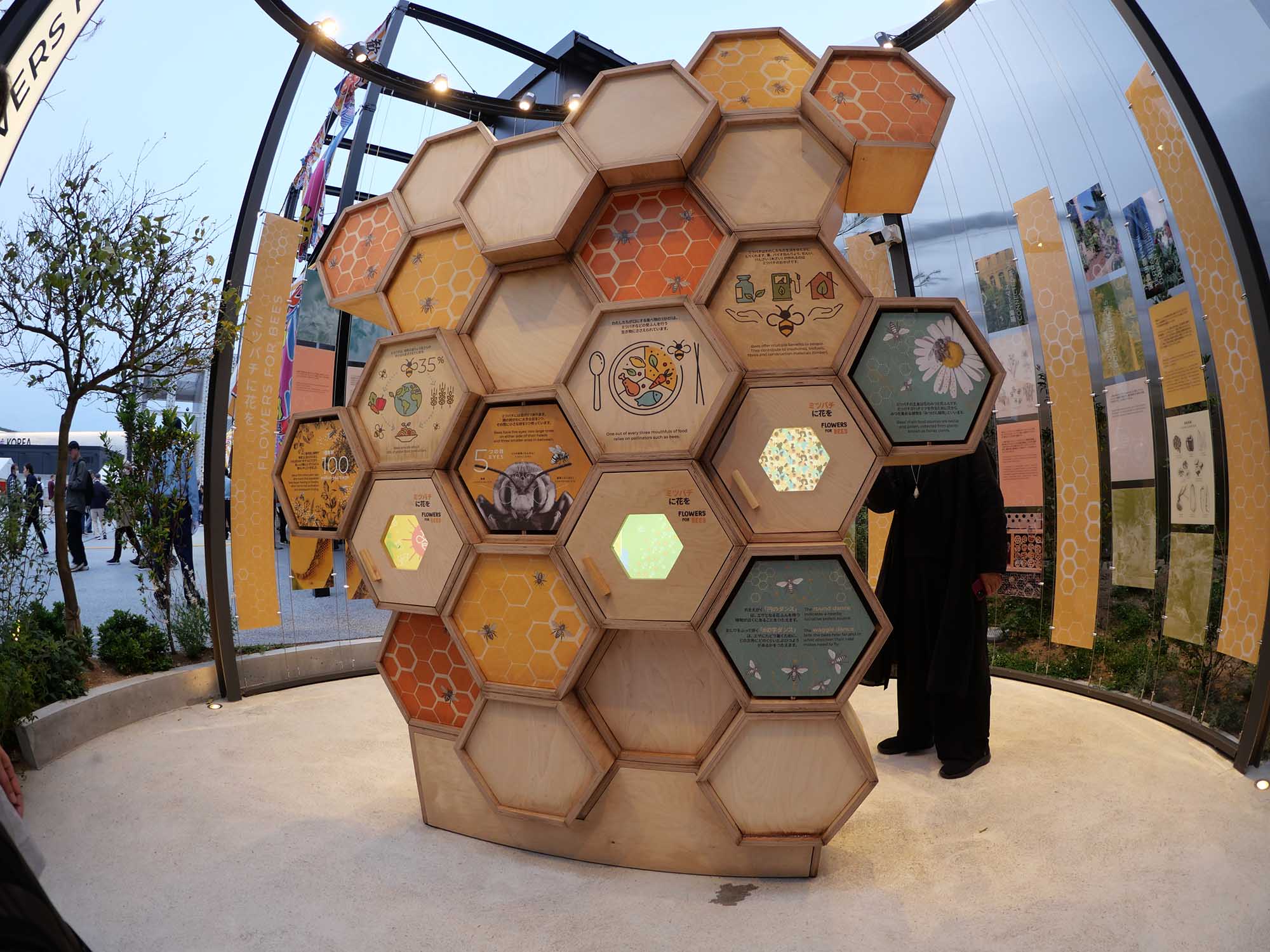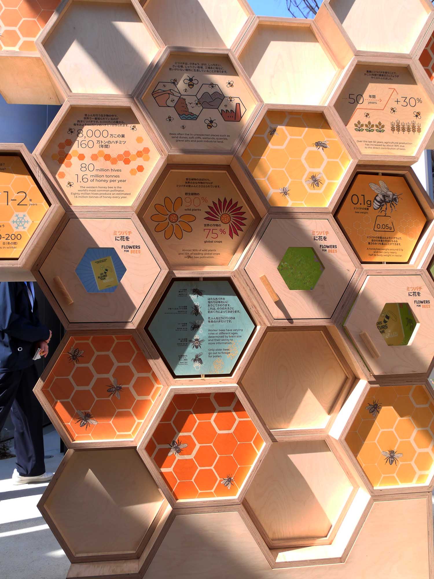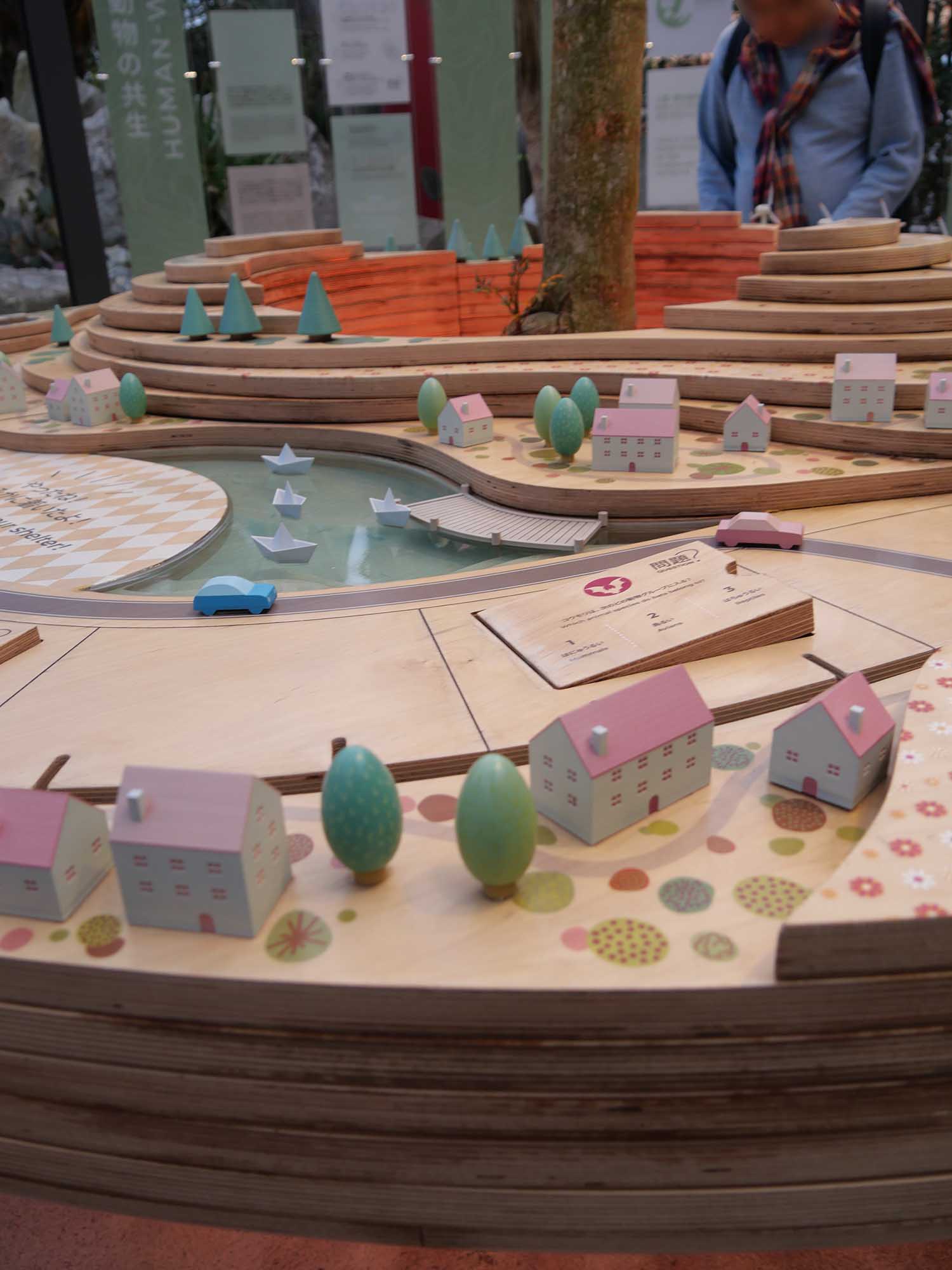 建物を抜けると、庭園が広がります。日本の庭園と地中海の風景を融合したような造りで、水辺や草木に囲まれ、穏やかな空気が流れています。そこには、かわいらしい木製の大型ボードゲームや、ミツバチの解説板が設けられており、環境と生き物のつながりを楽しみながら学べます。