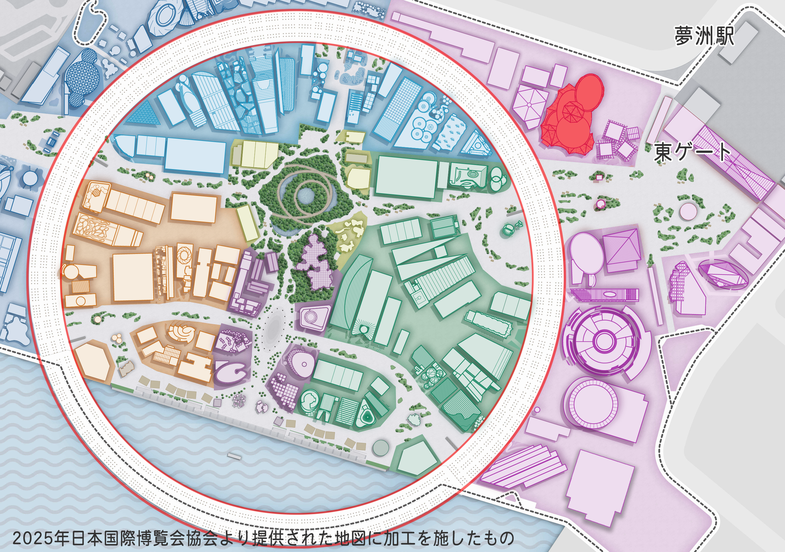 未来に向けたヘルスケアや都市生活の姿、iPS細胞をはじめとする再生医療の可能性を発信する、開催地・大阪を代表するパビリオンです。夢洲駅に近い北東エリアに位置し、鉄道で来場する人々を最初に迎える“会場の顔”のひとつとなっています。