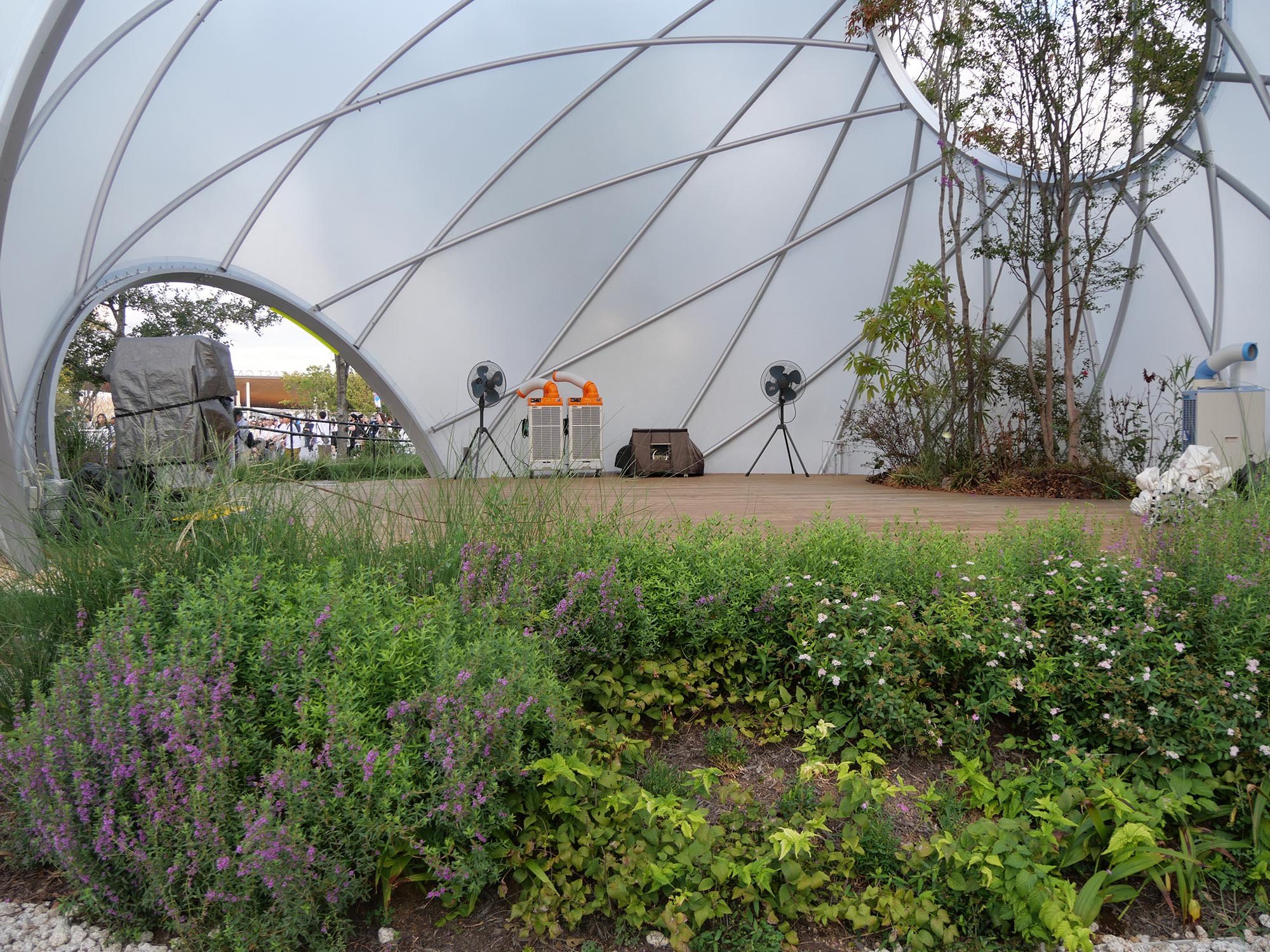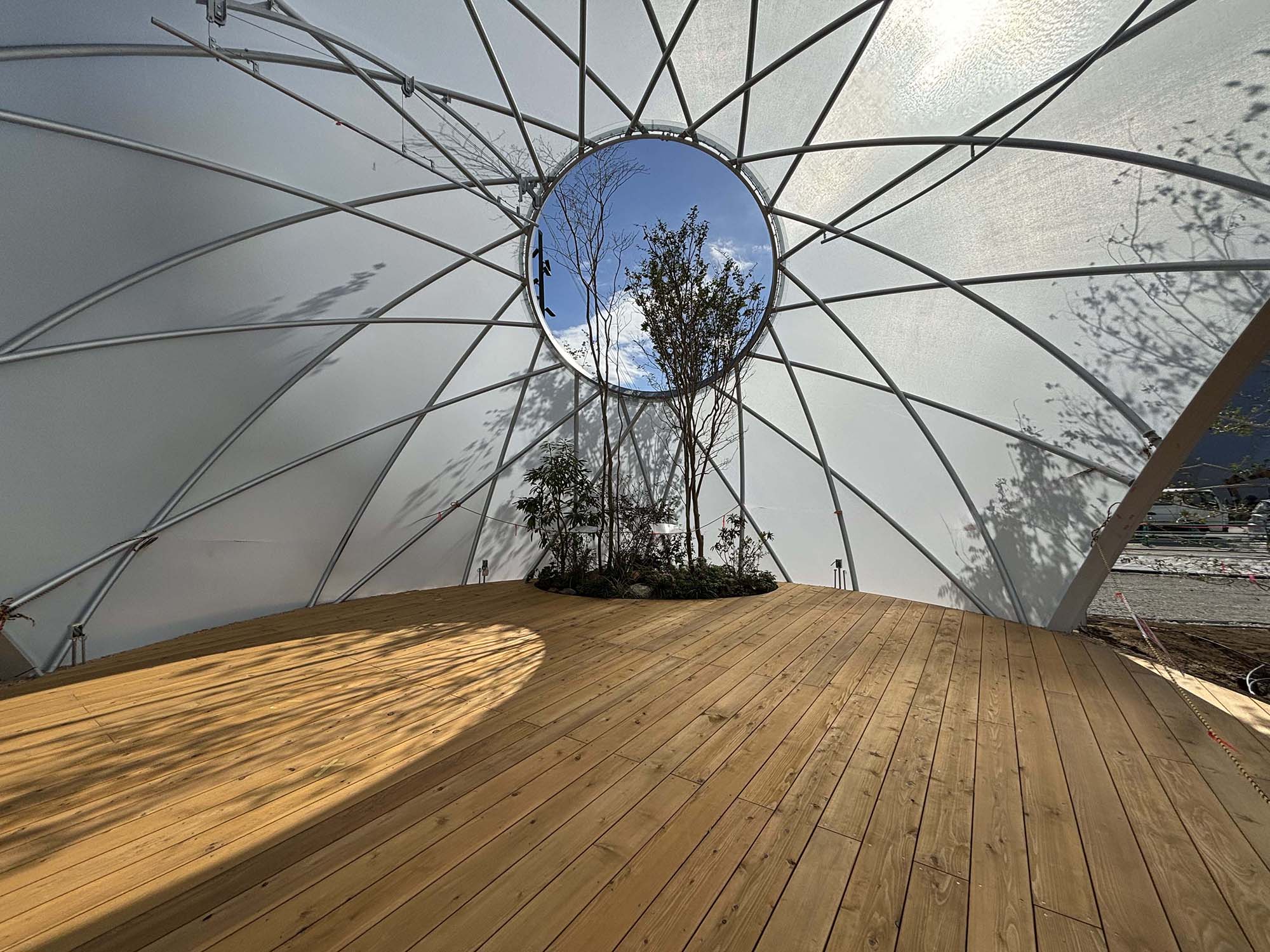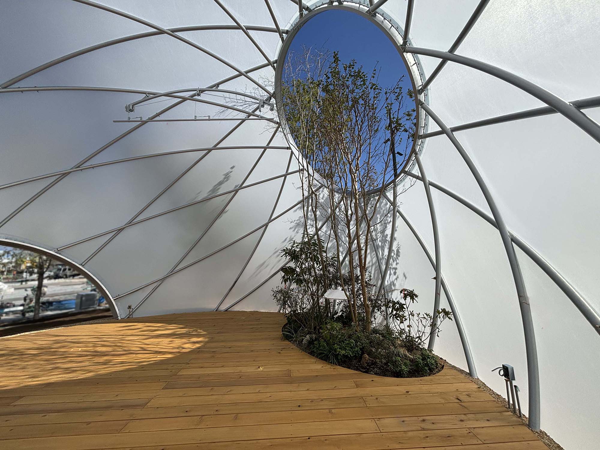 ・ドーム内には開口部があり、樹木や草花が外へと伸び、自然と人間が共存する未来像を象徴しています。樹木の選定もすばらしいものです。