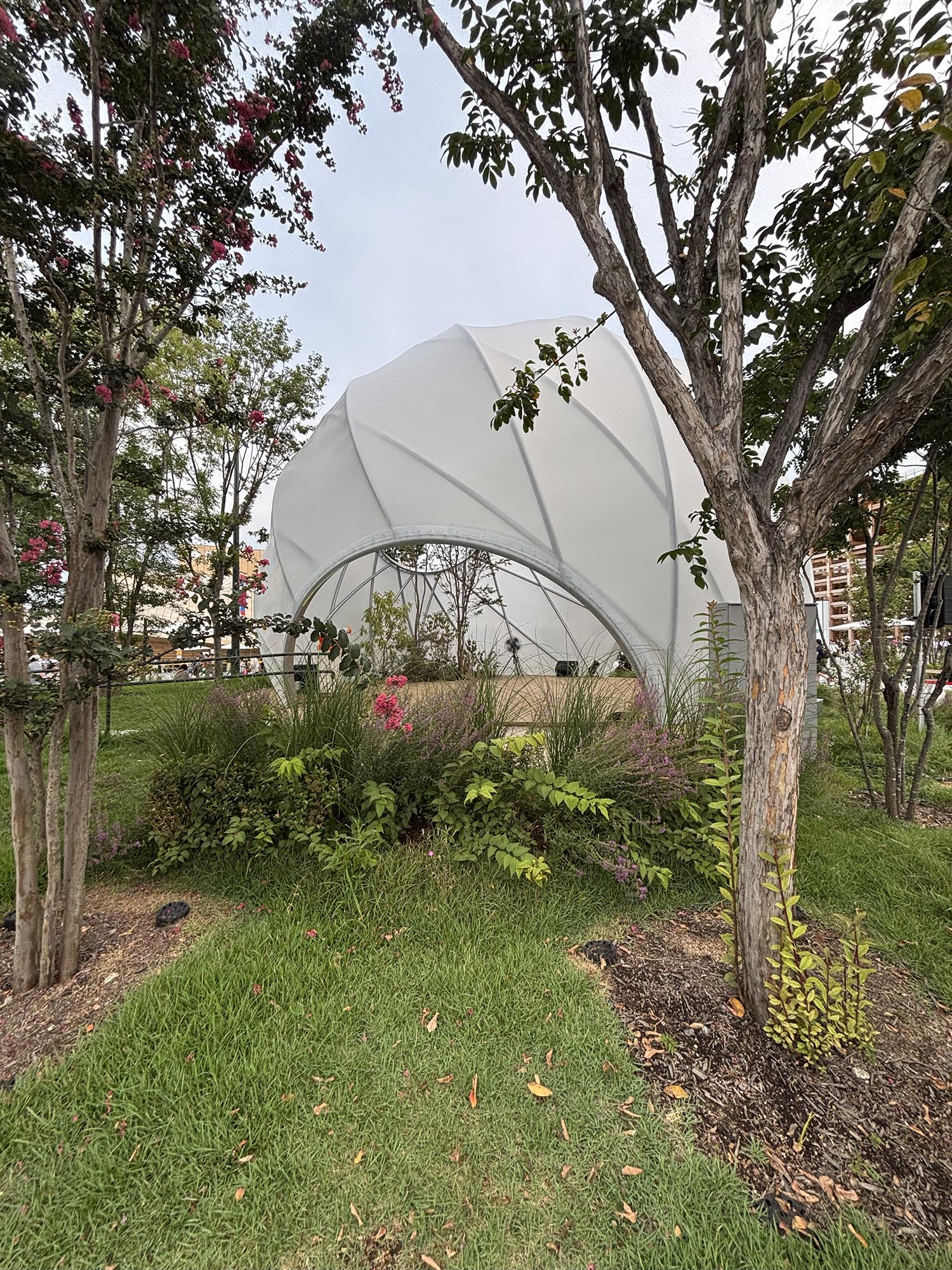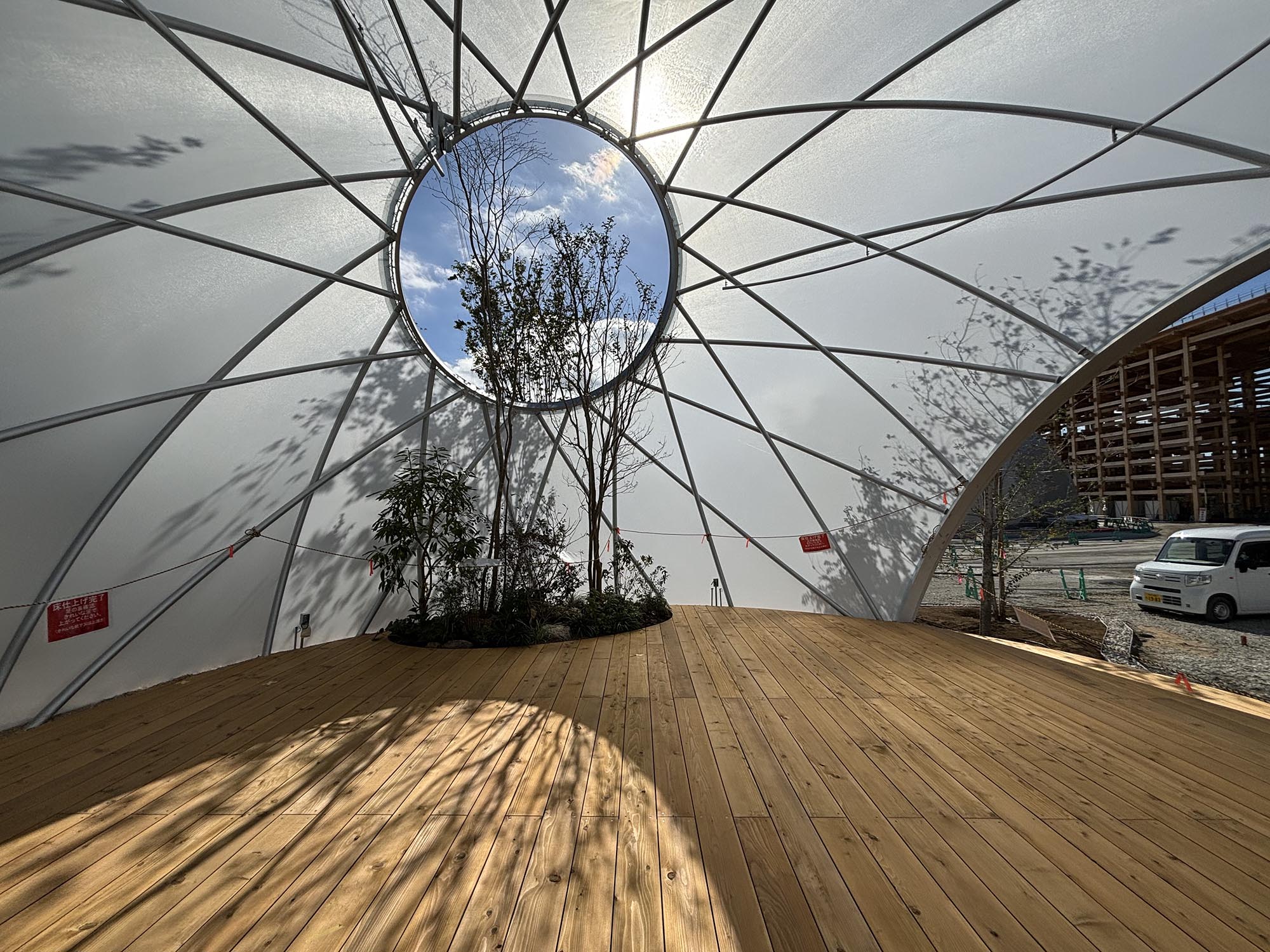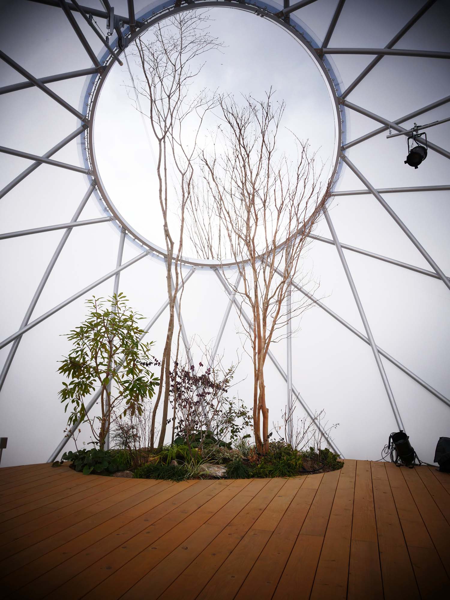 ・ドーム内には開口部があり、樹木や草花が外へと伸び、自然と人間が共存する未来像を象徴しています。樹木の選定もすばらしいものです。
