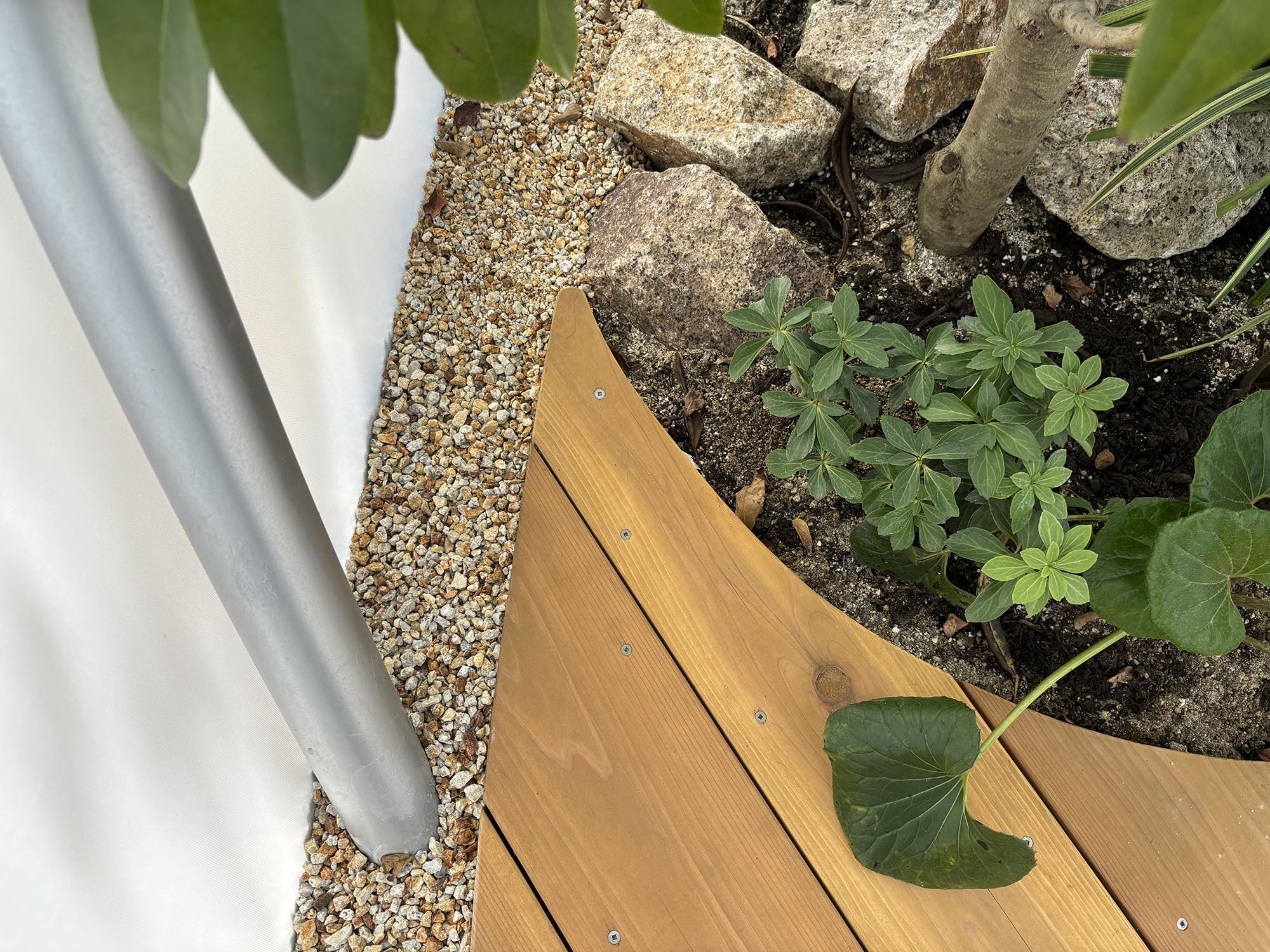 工事全体は富山県の株式会社岡部が受注し、当社は同社からウッドデッキ部の施工を任されました。萬代基介建築設計事務所からの直接依頼によって進められたことも、当社にとって大きな誇りです。