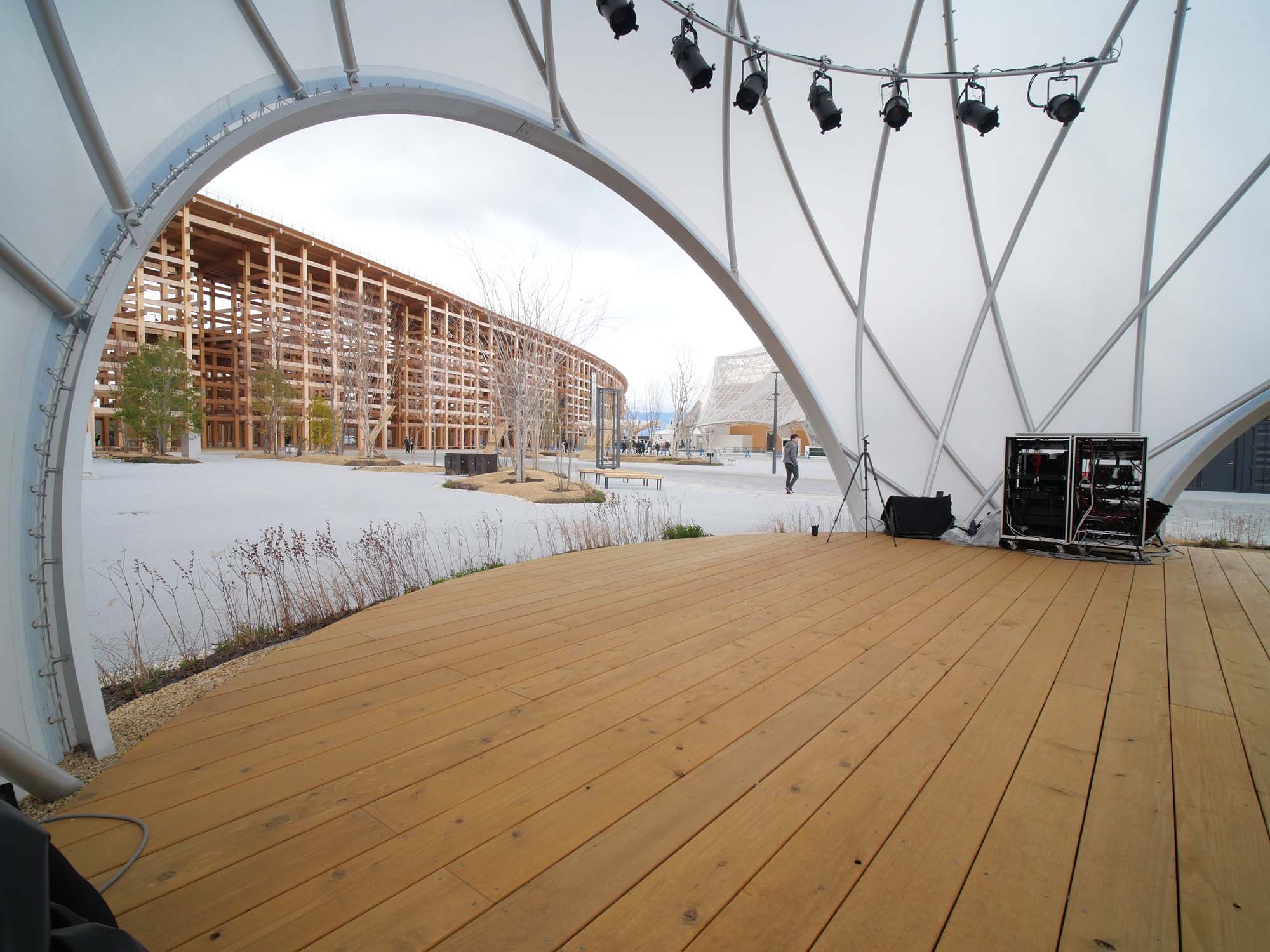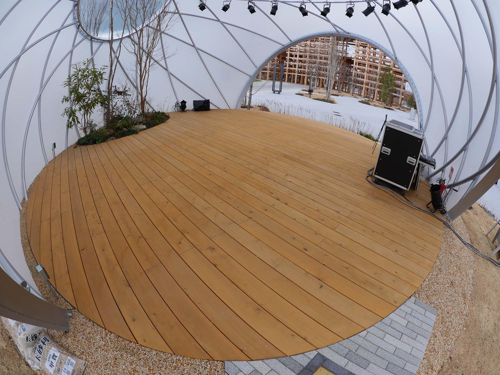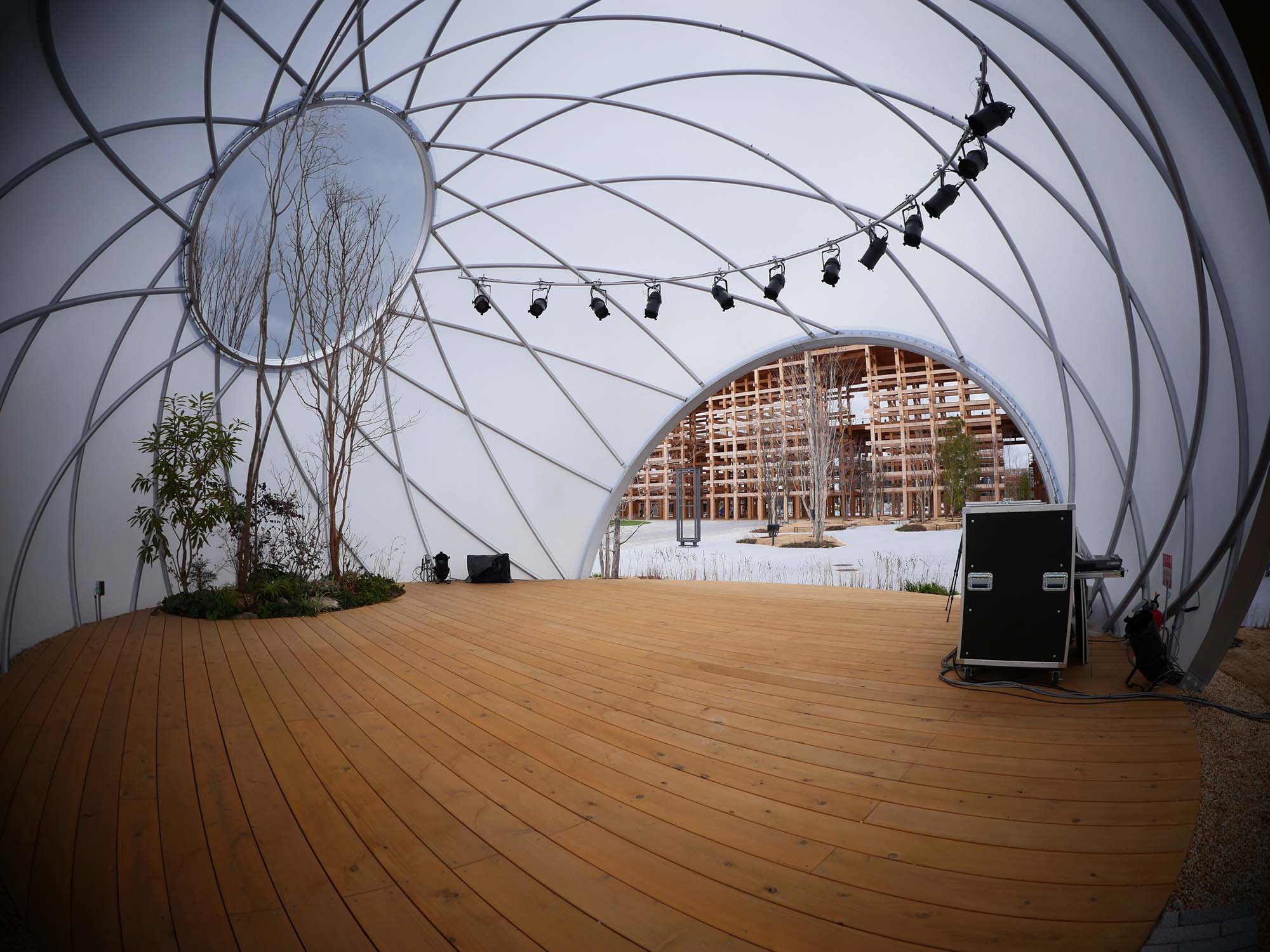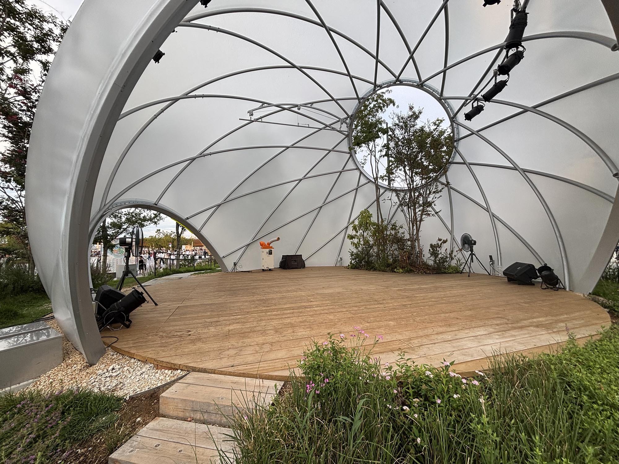 このステージは、シンプルかつ最小限のリングフレームで構成されるドーム建築です。