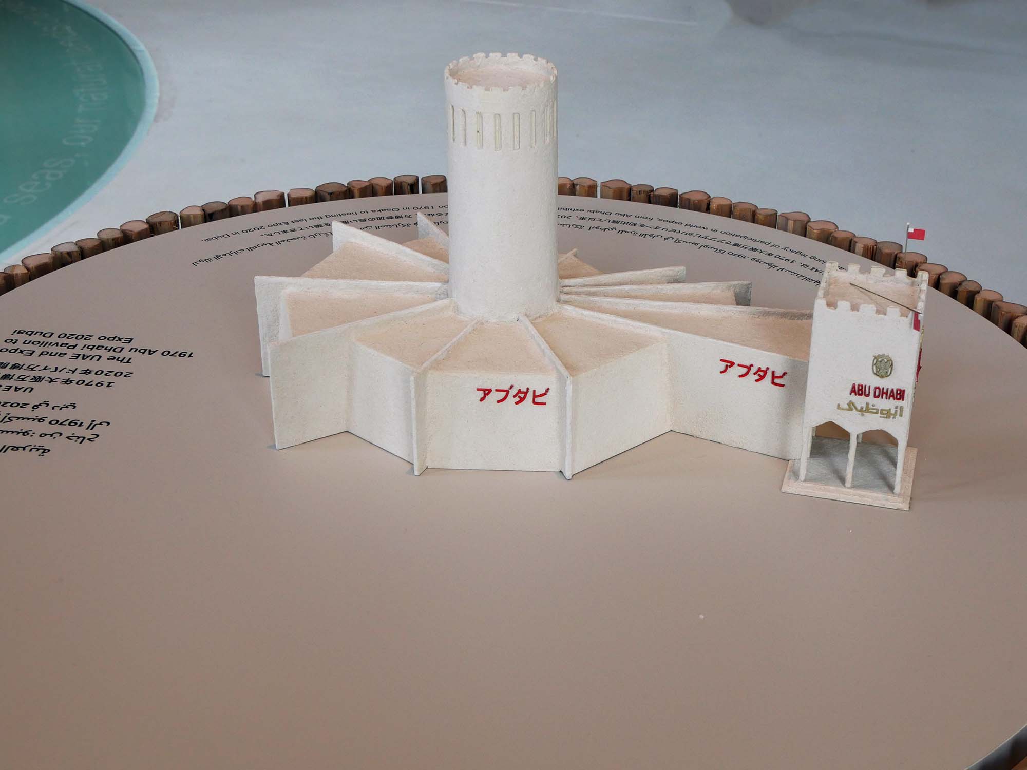 館内では、伝統文化だけでなく宇宙開発、再生可能エネルギー、医療など、UAEの先進的な側面にも触れることができます。特に、太陽の動きに合わせて回転するソーラーパネルや、羊やラクダの毛を用いた柔らかな織物など、伝統とテクノロジーの融合には強い印象を受けました。また懐かしい1970万博のアブダビ館の模型が置いてあります。先の大阪万博にはアブダビとして出展し、その後1971年にアラブ7カ国(アブダビ、ドバイ、シャルジャ、ラス・アル・ハイマ、フジャイラ、アジュマン、ウンム・アル・カイワインの7つの首長国)が1つになってアラブ首長国連邦(UAE)が成立。そして今回はその連邦での参加になります。