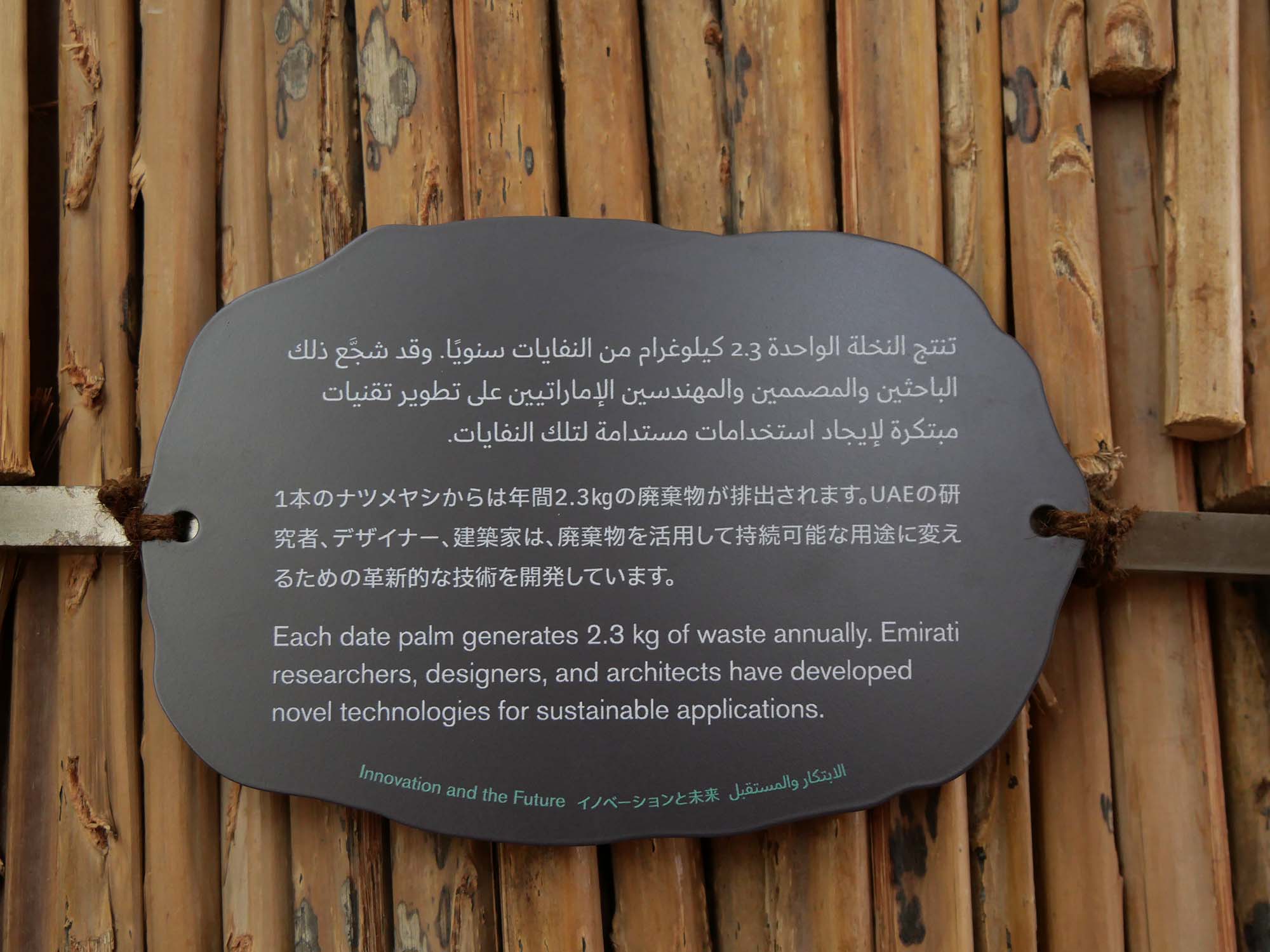 パビリオンを出るころには、ナツメヤシがただの用材や果実ではなく、この国の暮らし、建築、精神性を支える「聖なる木」であることを肌で感じることができました。静かで、どこか懐かしく、そして心が満たされる——そんな空間体験でした。