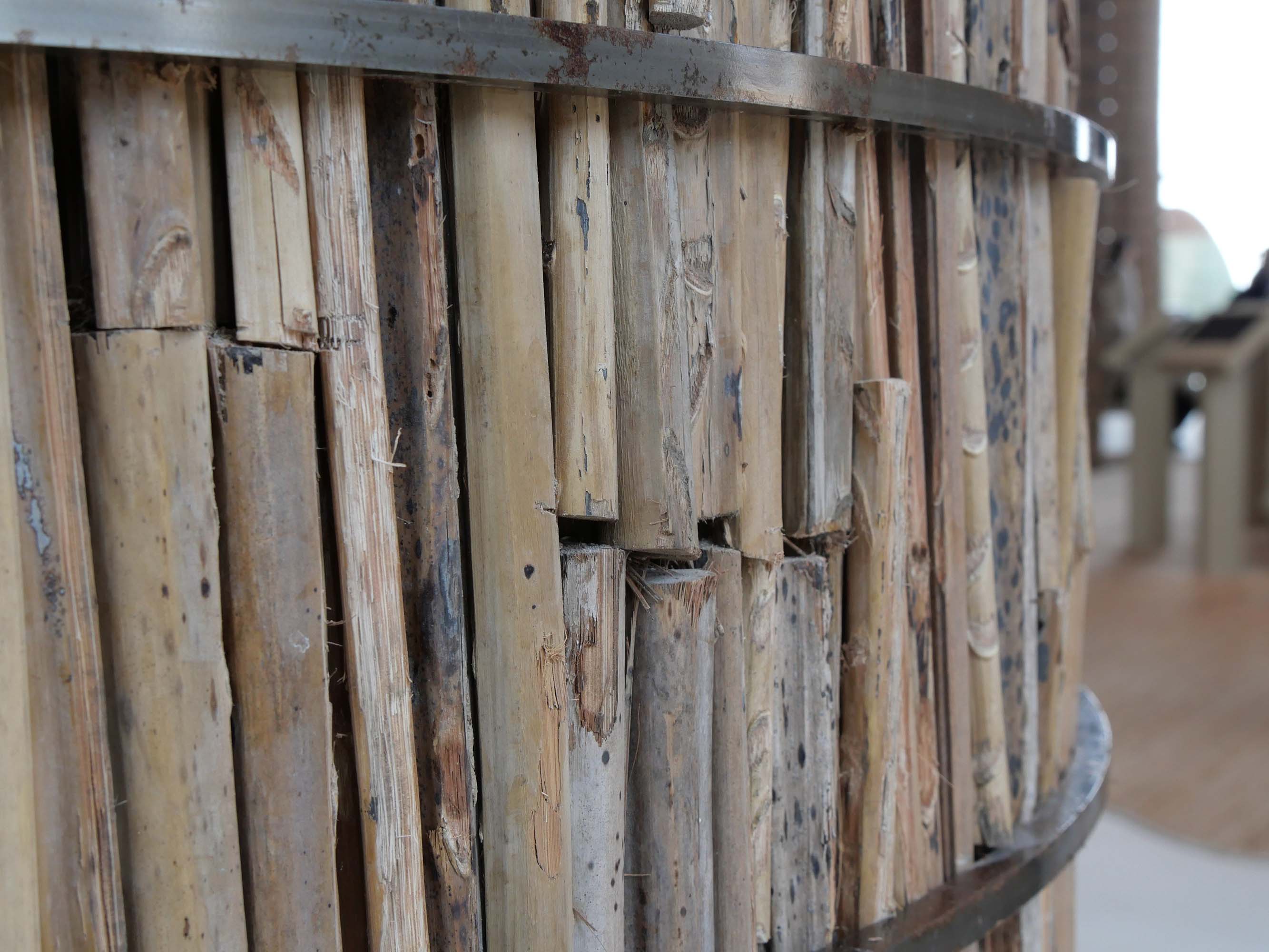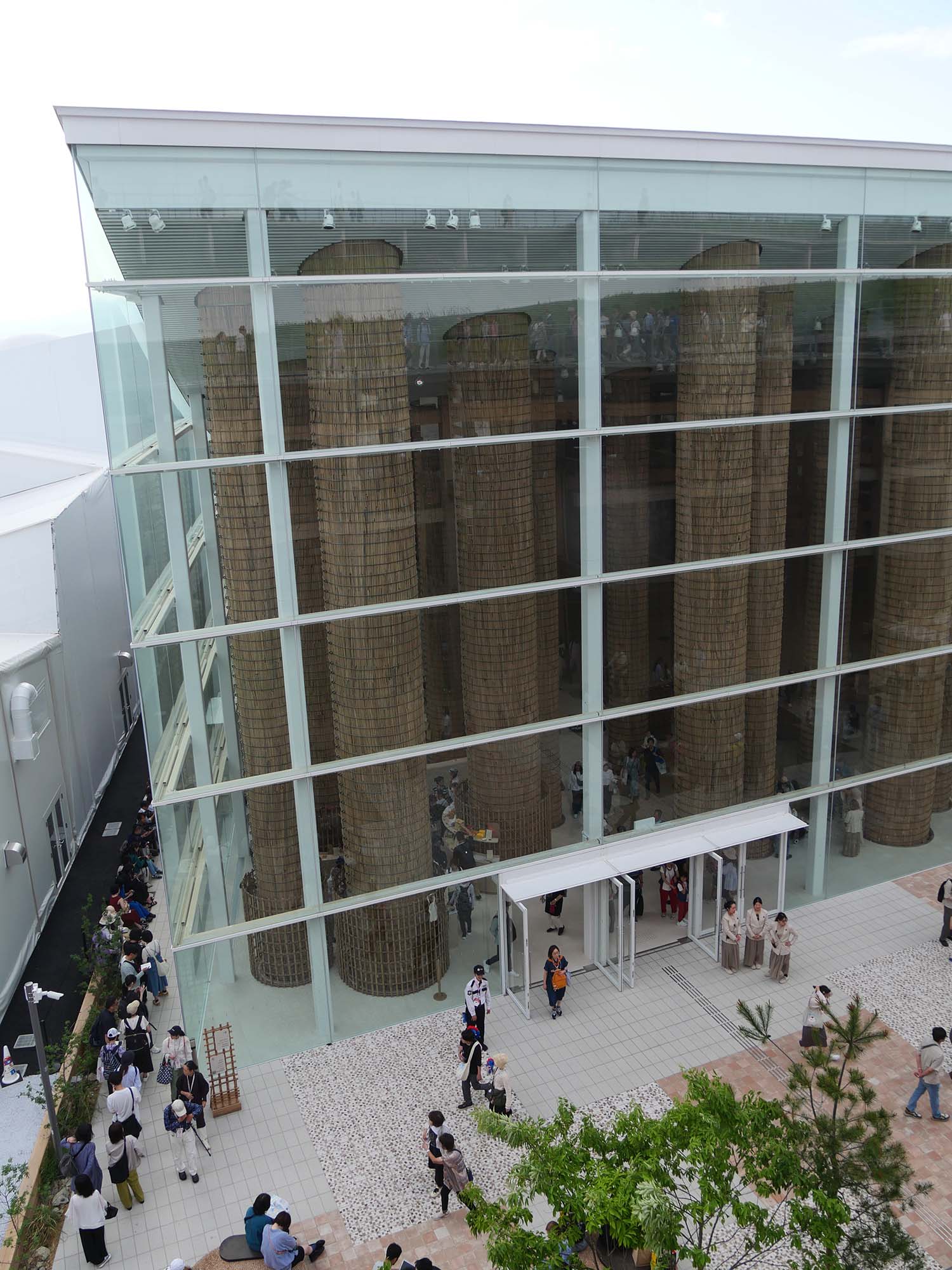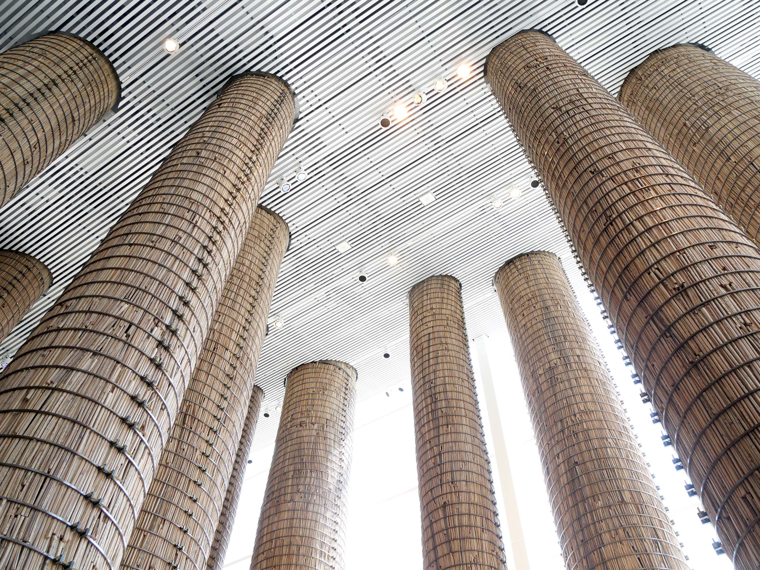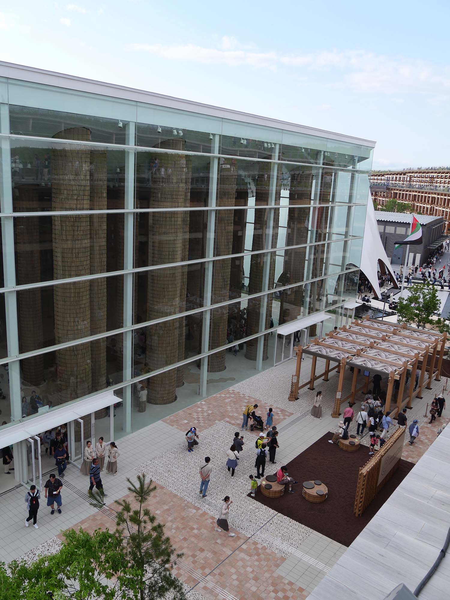 万博の会場で一番初めに入館したのがこの館でした。最初に目を奪われたのが、パビリオンの外観でした。ガラス越しに見える無数の巨大な柱は、まるで神殿のような印象で、近づいてよく見るとそれらはすべてナツメヤシの葉軸(ラキス)で覆われていました。
