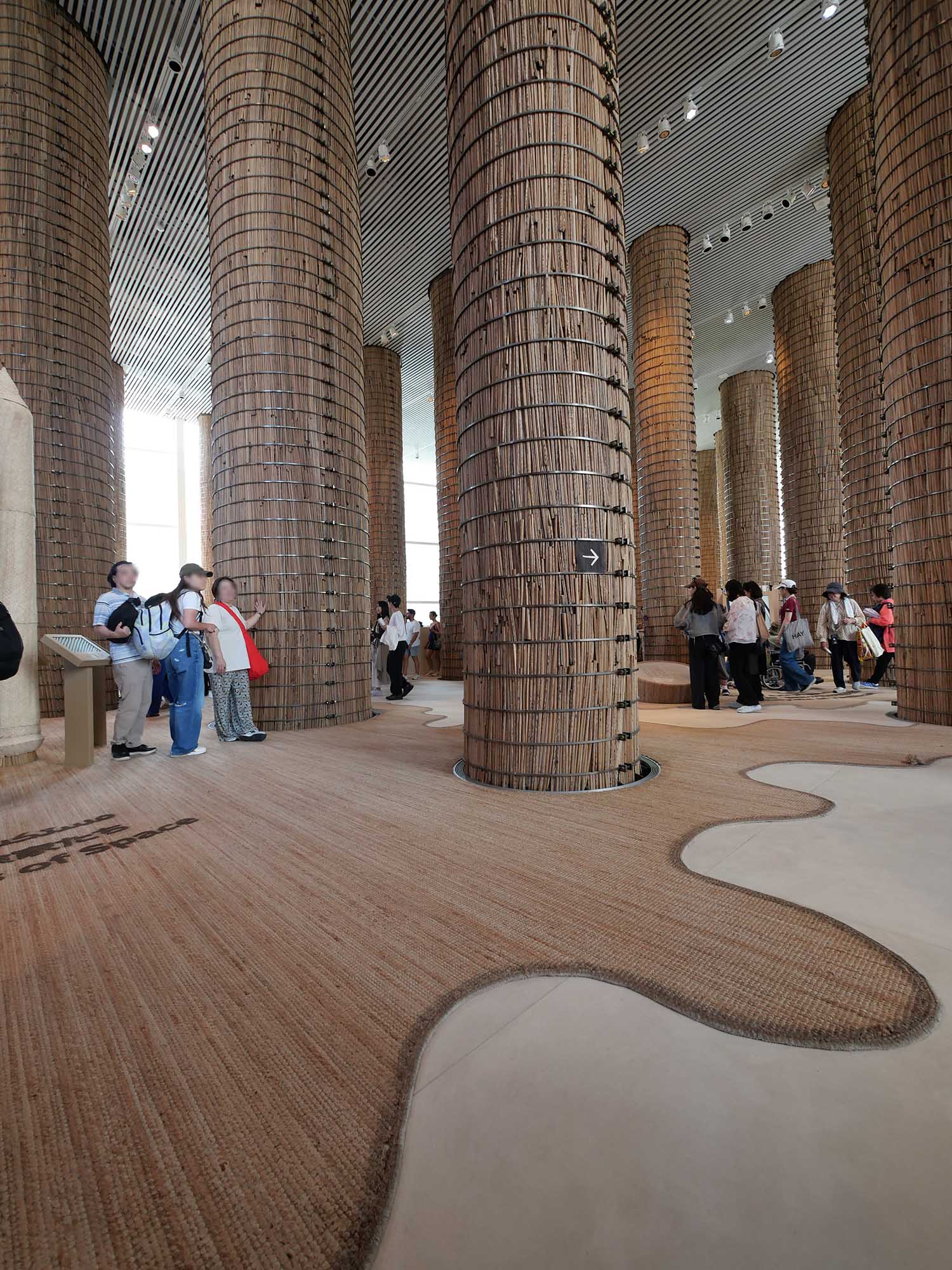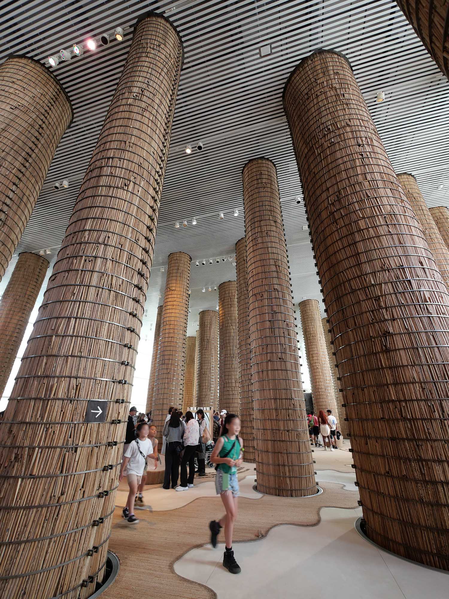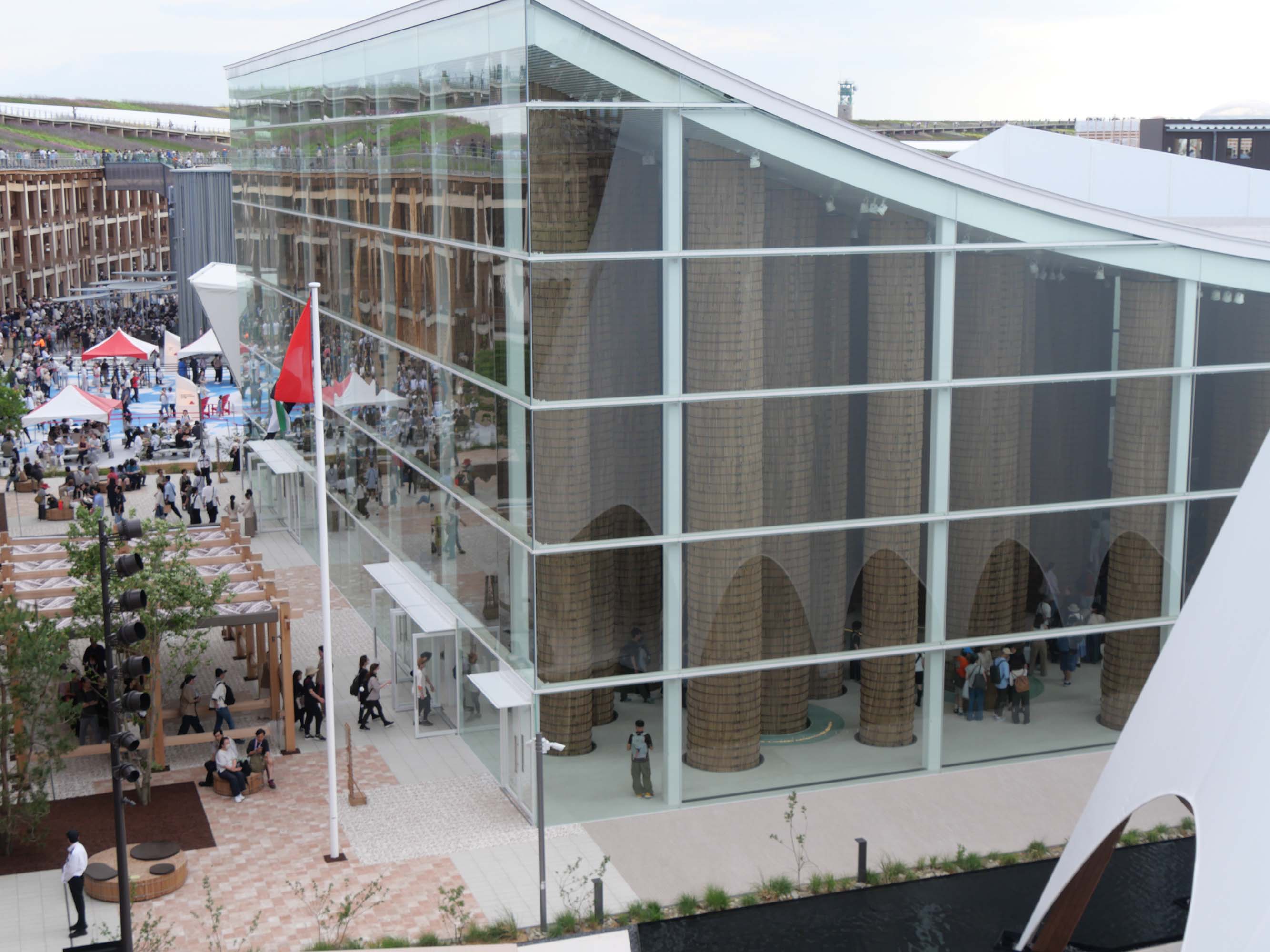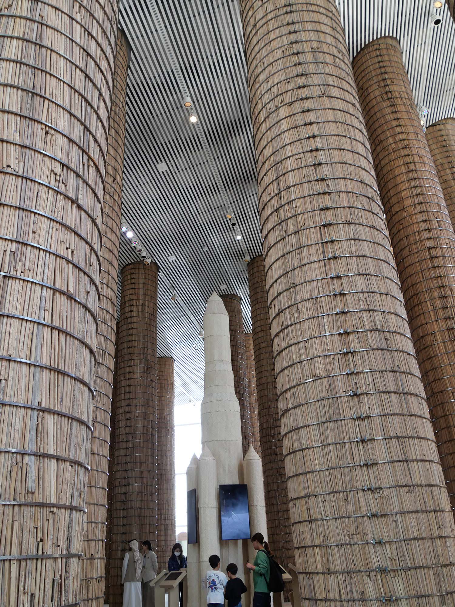 この柱は全部で90本。一本一本に葉軸を巻き付けて作られており、その数はなんと200万本以上。国内だけでは賄えず、周辺のアラブ諸国からも材料の提供を受けたとのことで、まさにこの助け合いの精神そのものが万博の理念を体現しています。