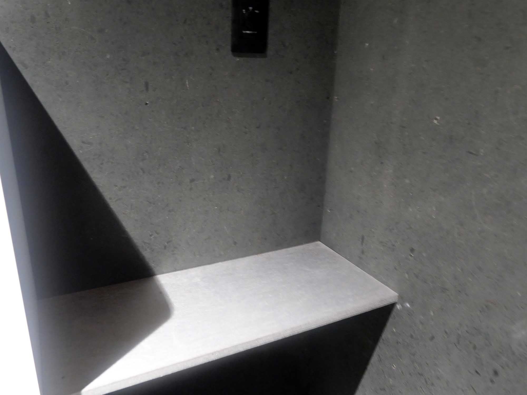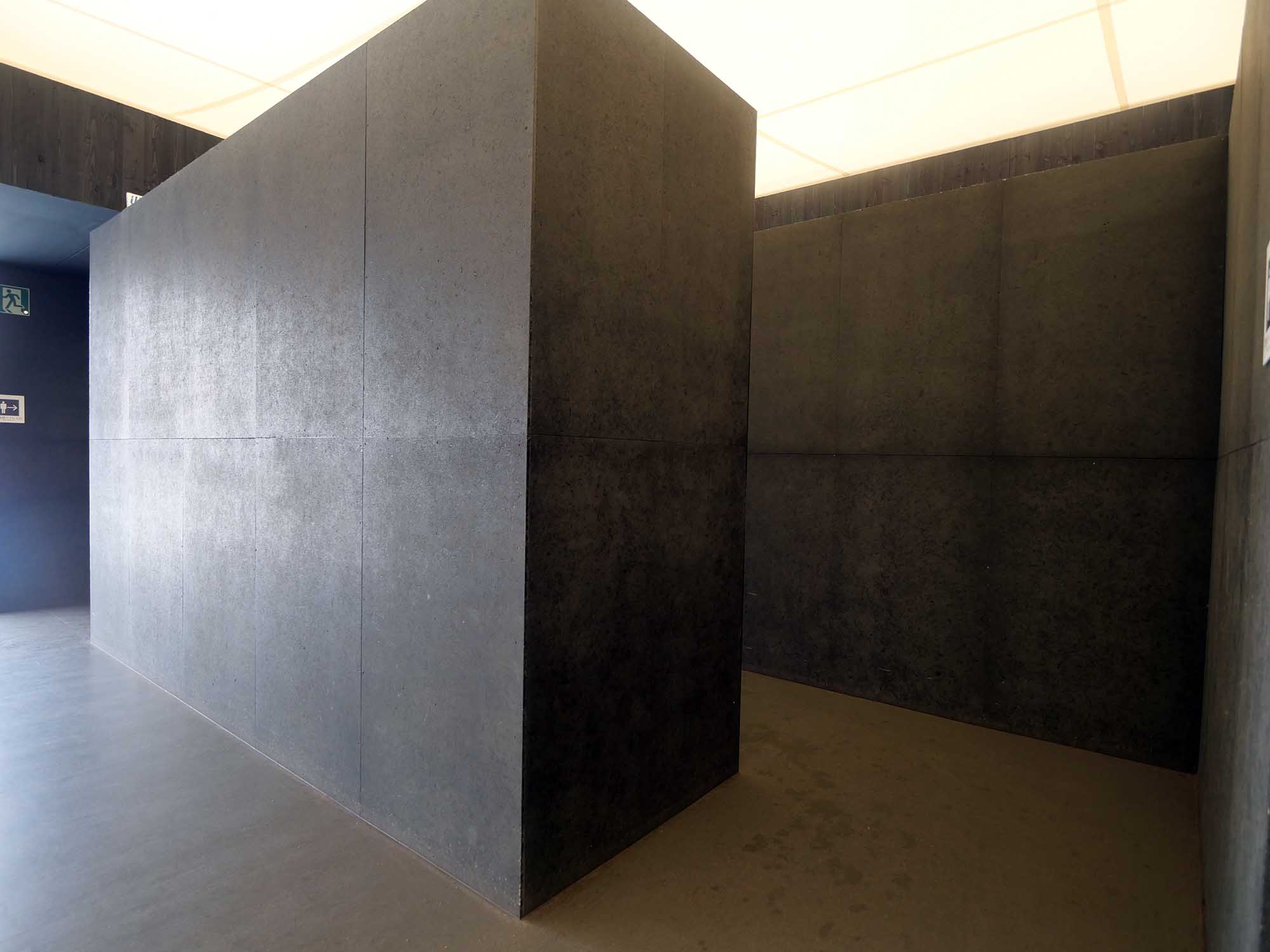 内部の仕上げはブルーブラック系の落ち着いた色彩で統一され、混雑した会場内で静かな時間を提供。