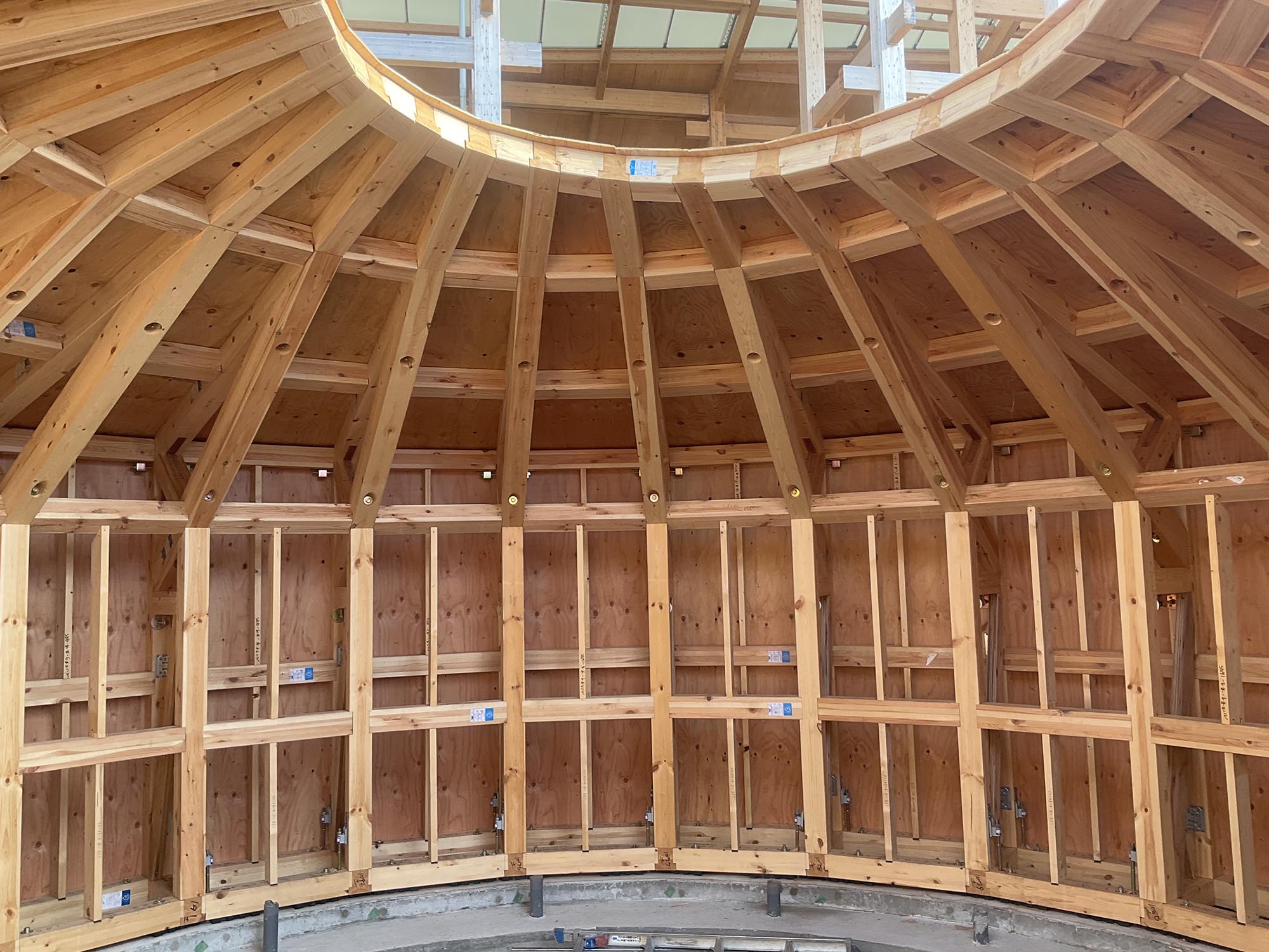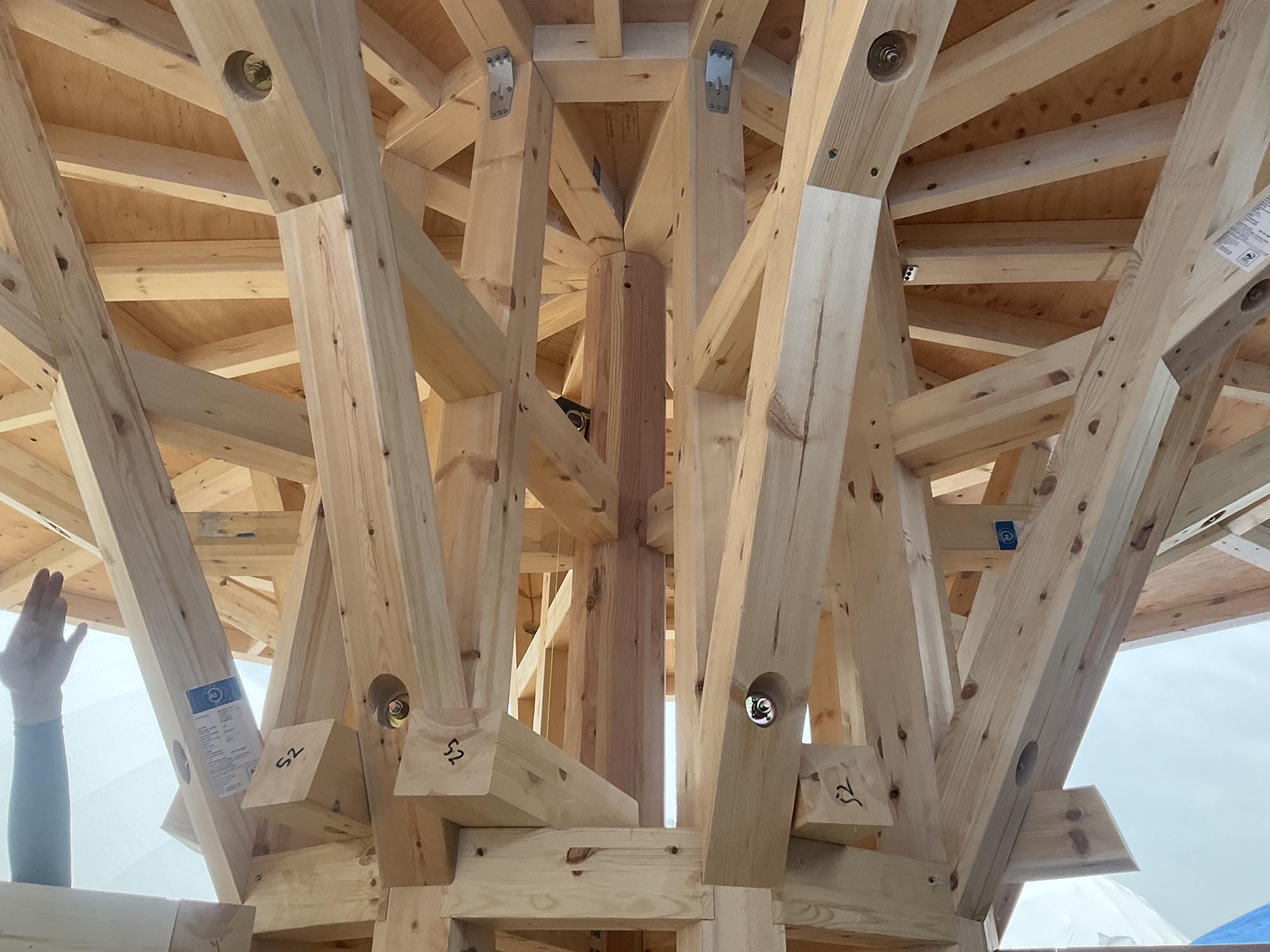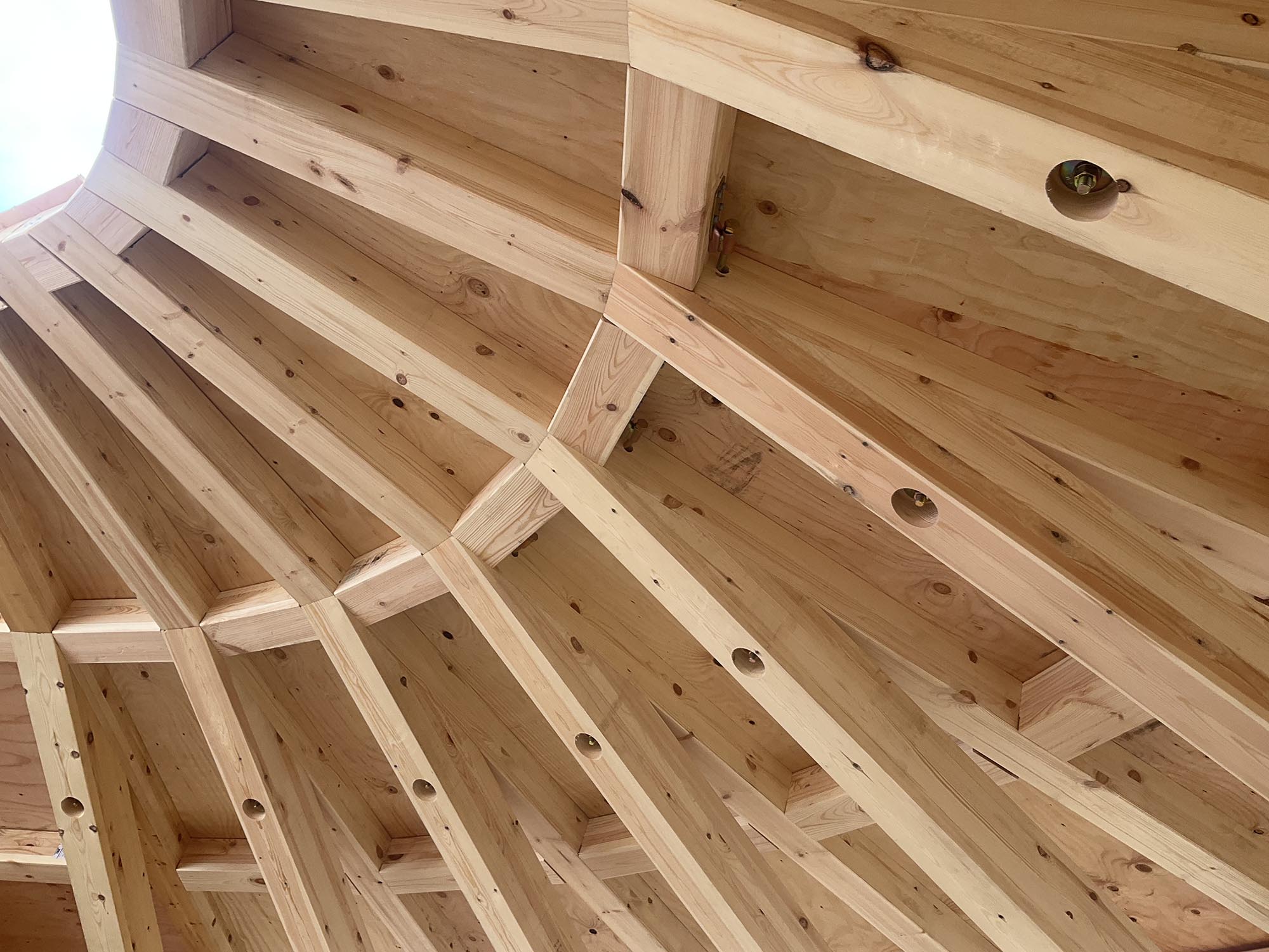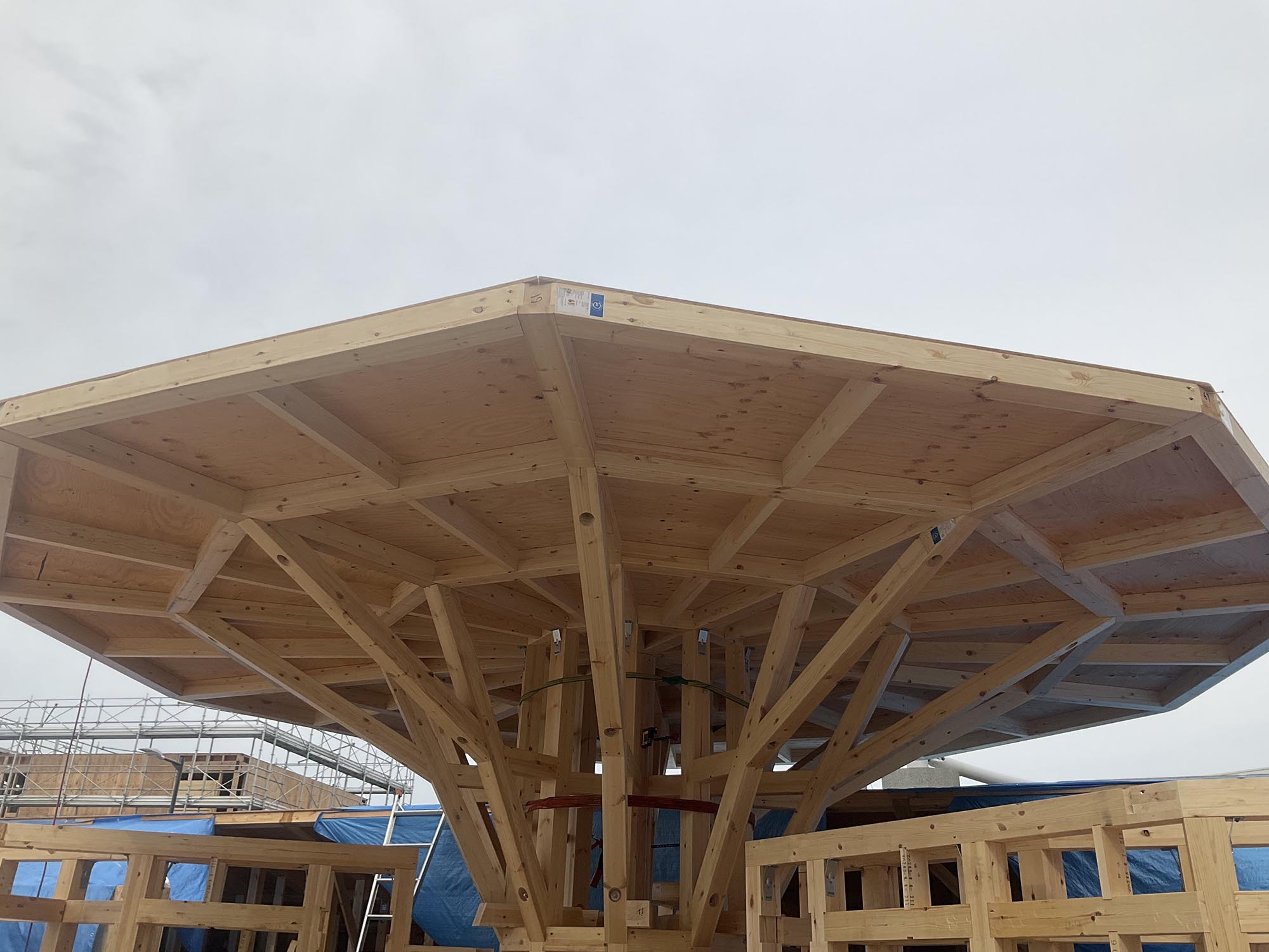 「トイレ4」の建物本体は木造です。 屋根は壁トラスによる10角形の架構になっています。この木の骨組みが、外装パネルやプランターをしっかり支えています。