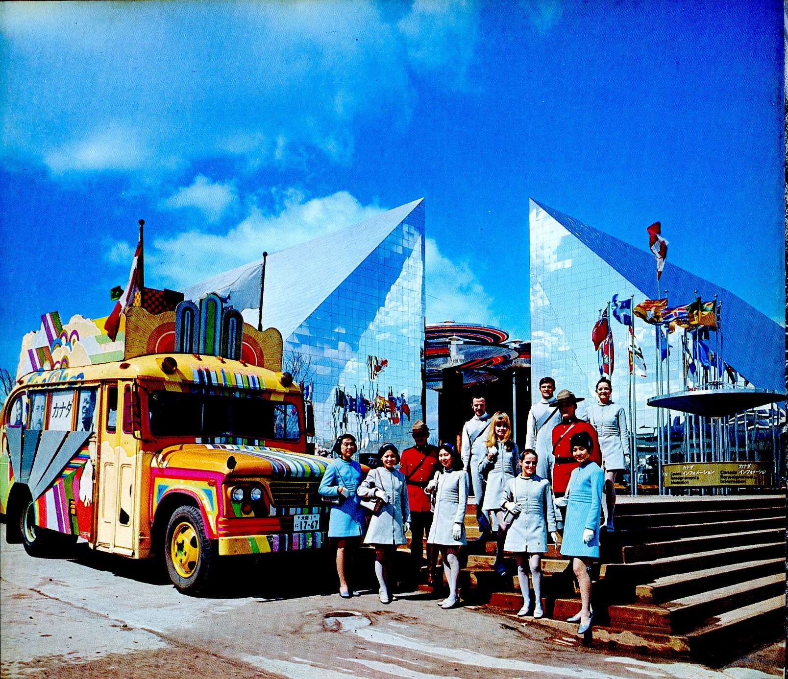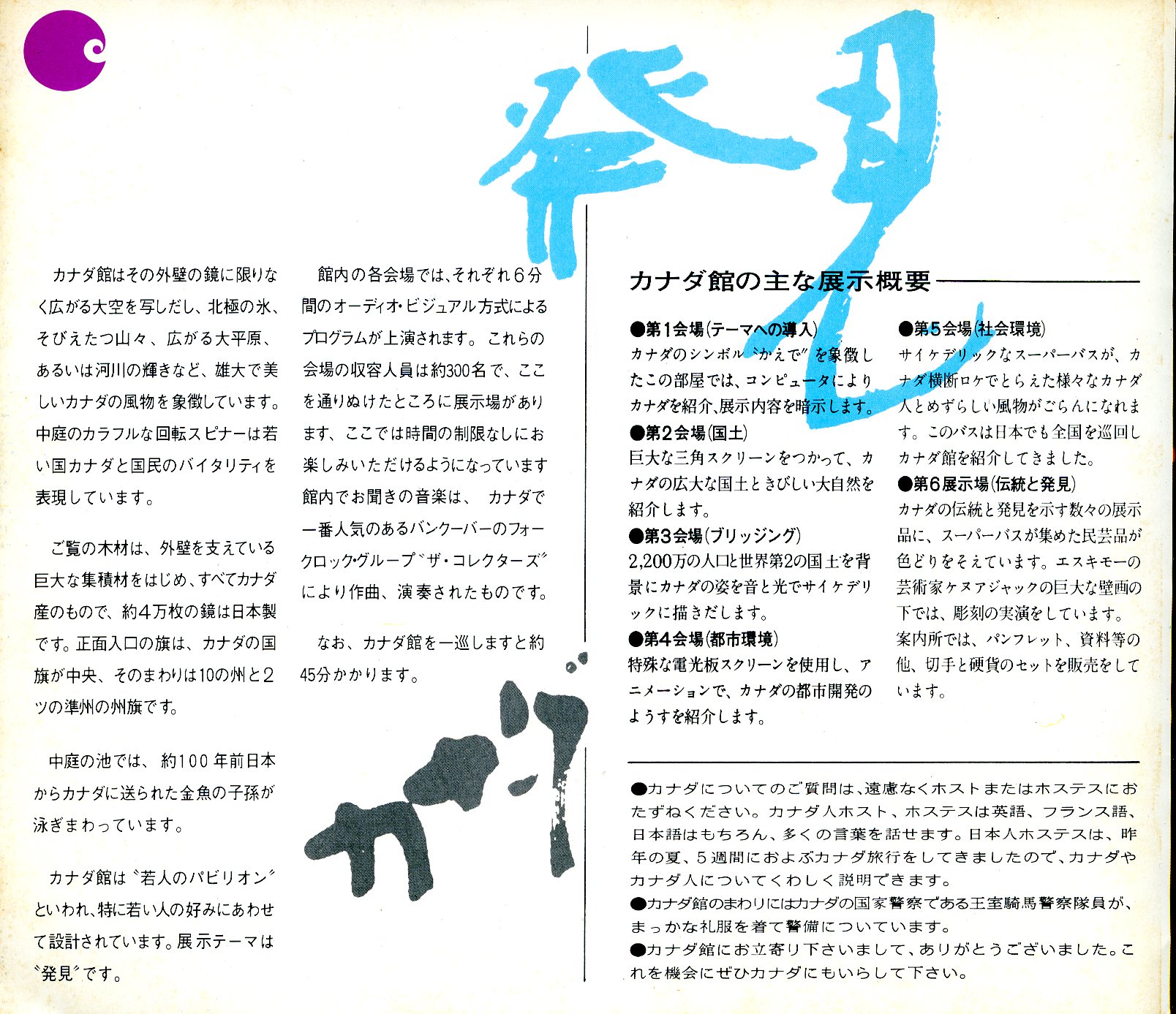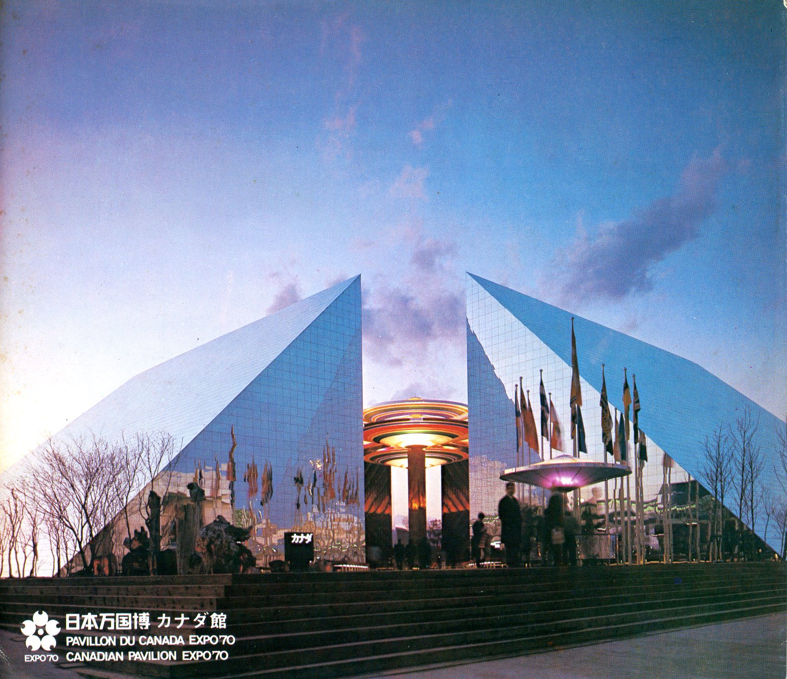 人型の梁組構成を4つのブロックで構成しており、囲まれた敷地を屋外展示やステージとしています。スピンナーと呼ばれる大型の回転する5本のパラソルが中心に世知され、池も配置されている。人型の梁構造はグルーラムでカナダで製造され、輸送されてきた。グルーラムとは木材を重ねて接着して作られる構造用木材のこと、グルーラムでできた梁は耐火性が非常に高く、熱を加えてもグルーラムは曲がりません。また、通常の火に1時間さらした後の焦げの深さは約36mmです。1970年に日本に紹介されながら、その後普及しなかったのは日本の建築基準法に抵触していたのかもしれません。カナダでは当時からスポーツ施設、大型店舗、展示ホール、学校、住宅、農業施設などに利用されていました。