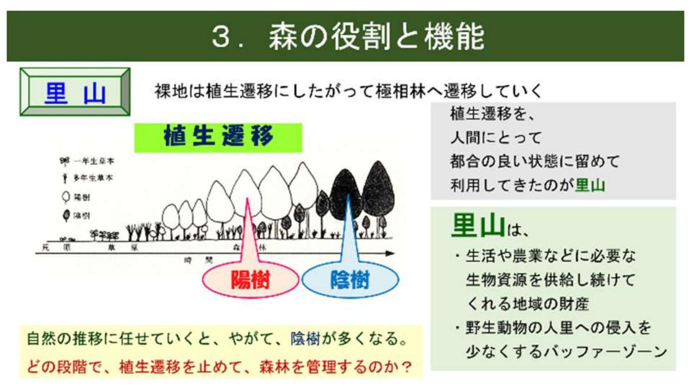 人類は“火”を使うことができ、昔は、木材を、灯り、煮炊き、暖房などに日常的に利用してきました。薪炭革命が起きるまでは、森はエネルギーの供給源として重要な役割を果たしていました。また、里山は、生活や農業などに必要な生物資源を供給し続けてくれる地域の財産であったとともに、野生動物の人里への侵入を少なくするバッファーゾーンの役割も果たしていました。