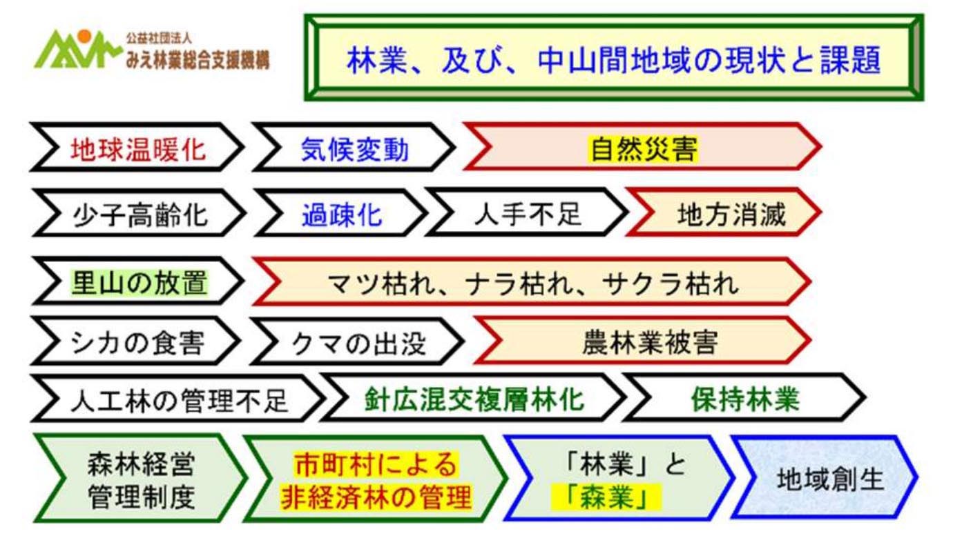 美し国“みえ”の森と木は、定期的に手を入れ続けるという伝統と文化によって、守られ維持されてきました。しかし、地球温暖化による気候変動の影響、少子高齢化、過疎化などによる人手不足、「林業」と「森業」の両立など地域課題は山積しています。SDGs などのグローバルな視点による取り組みも必要です。J-クレジットや生物多様性保全活動では県内外の関係者との連携・協力も必要です。