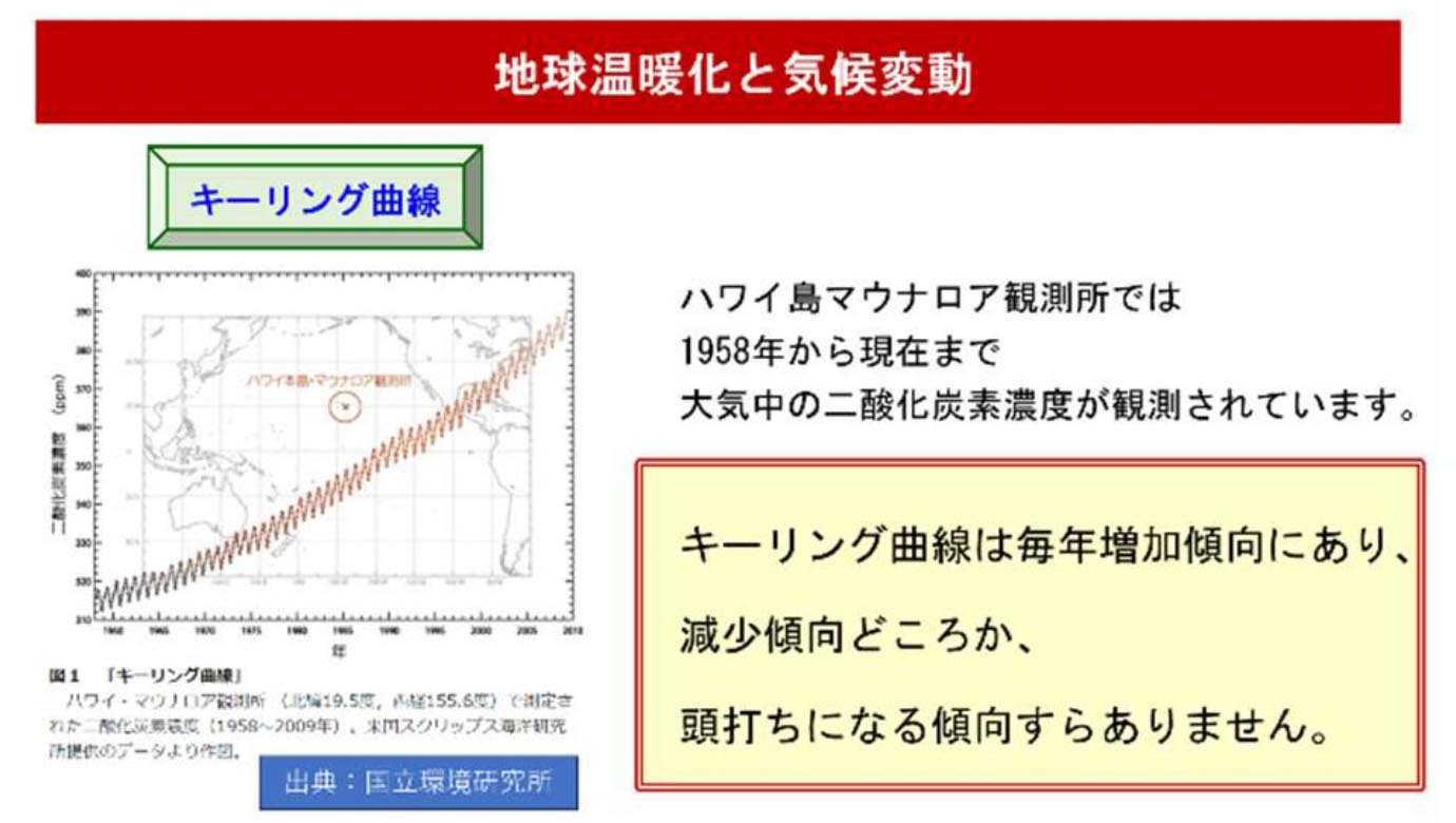 大気中の二酸化炭素濃度の観測値は、毎年上昇し続けており、頭打ちになる傾向がありません。IPCC 第 6 次評価報告書(2021)では「人間が温暖化をさせてきたことは疑う余地がない」と報告され、2023 年には国連のグテーレス事務総長が、地球沸騰化と表現しました。