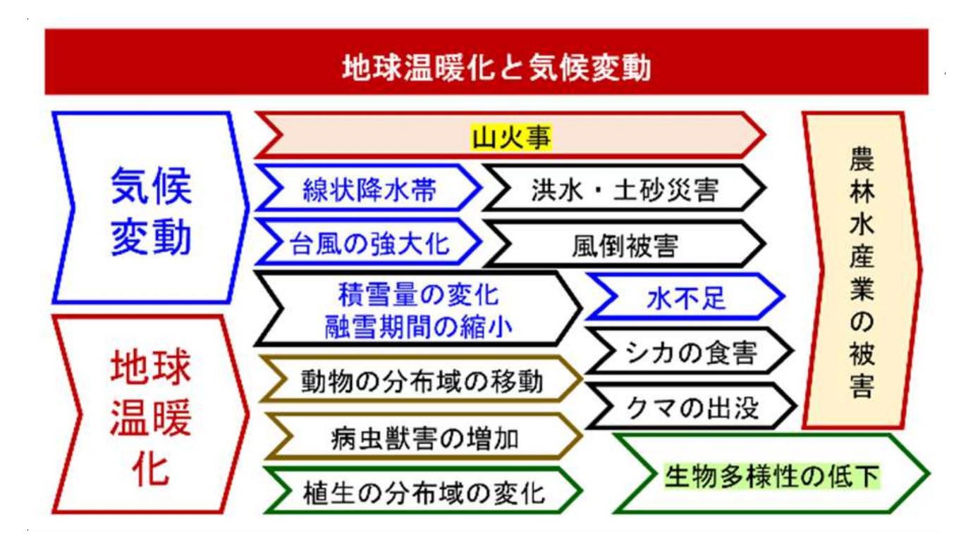 気候変動による影響としては、山火事、線状降水帯、台風の強大化、積雪量の変化などによる災害や被害が懸念されます。地球温暖化による影響としては、融雪期間の短縮、動物の分布域の移動、植生分布域の変化、病虫獣害の増加、生物多様性の低下などが懸念されます。